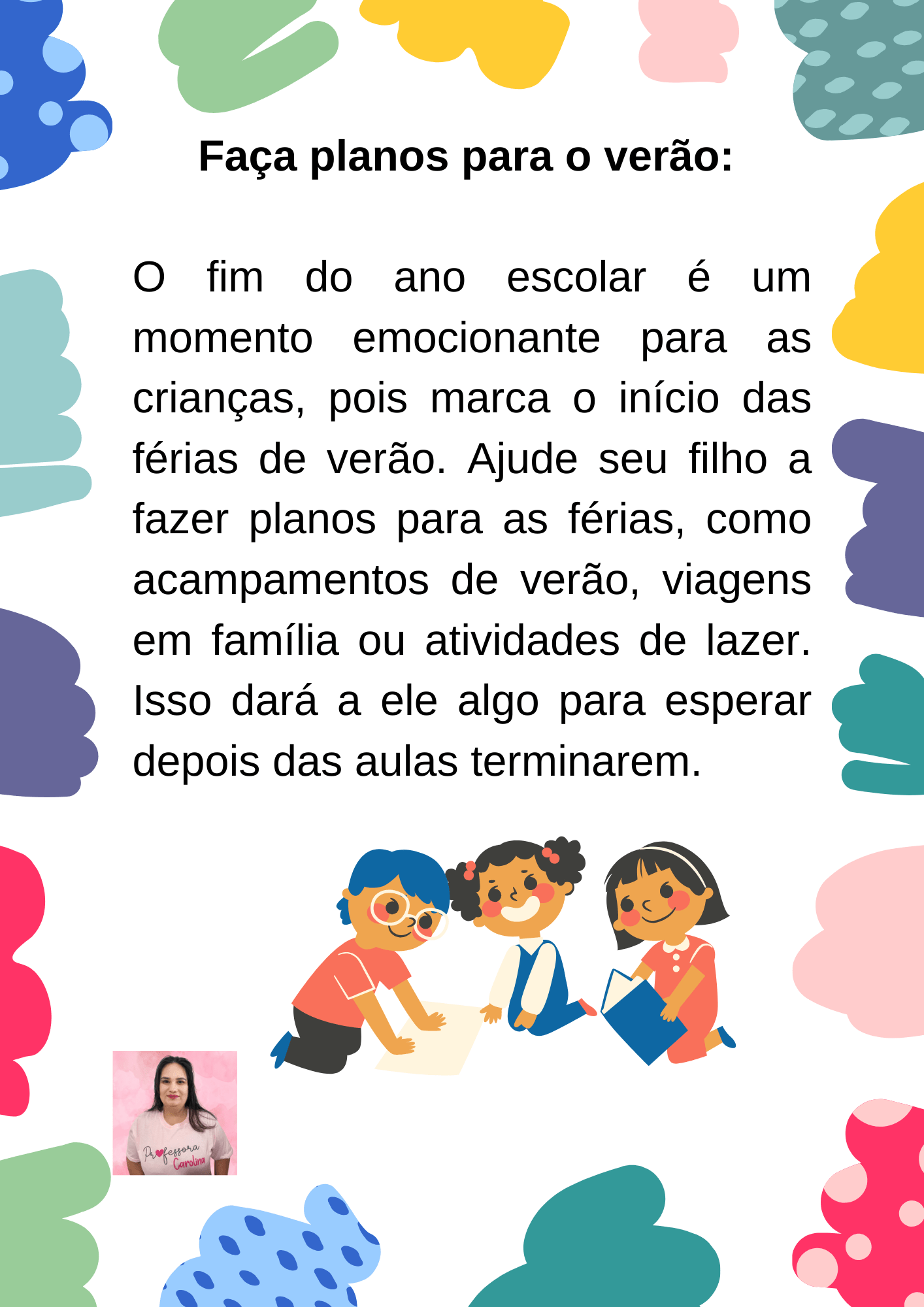 - Faça planos para o verão. Planeje algumas atividades divertidas para as crianças fazerem durante as férias de verão. Isso ajudará a mantê-las ocupadas e animadas.