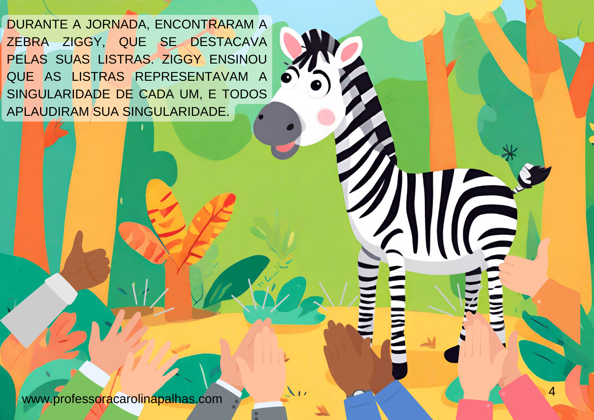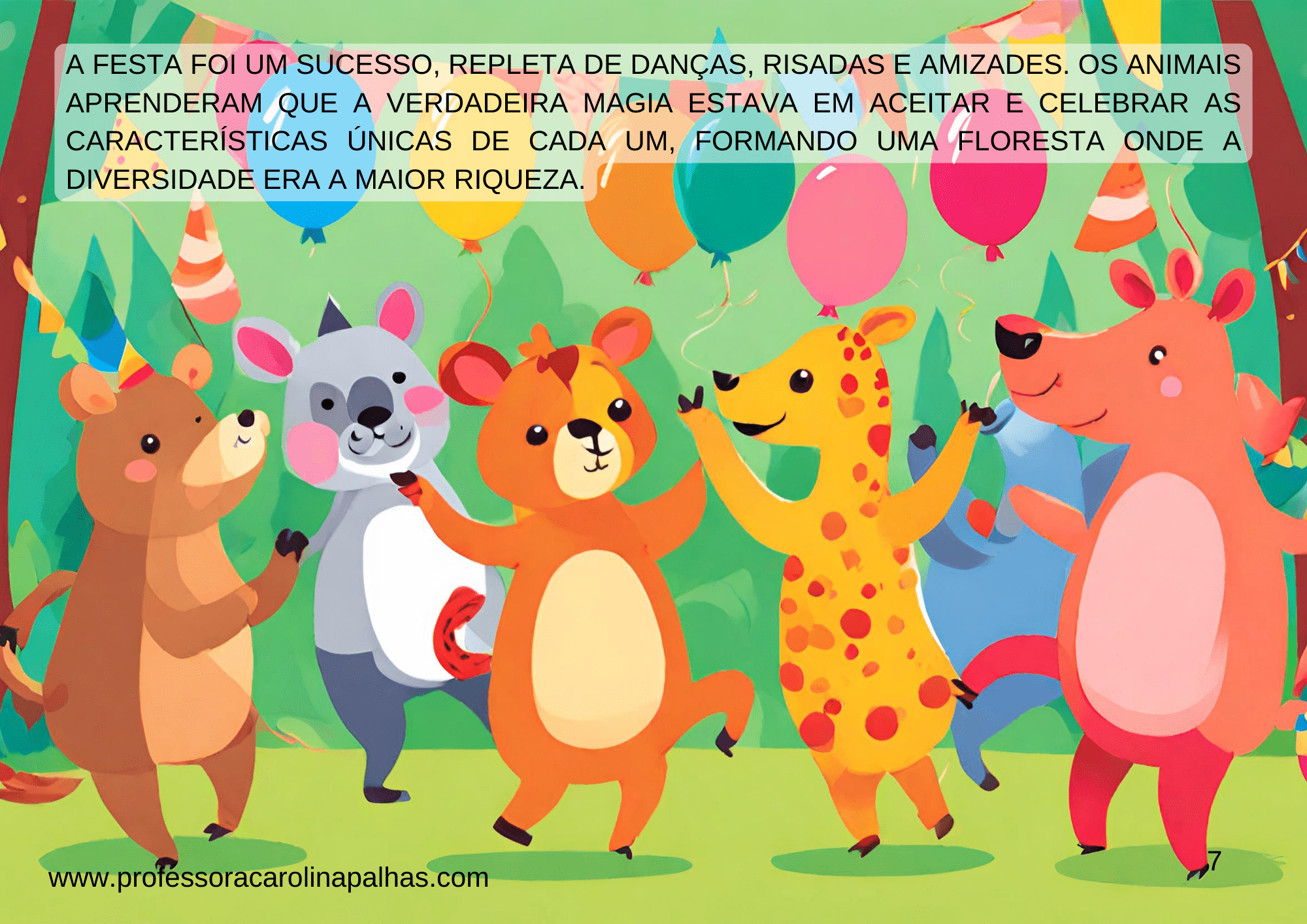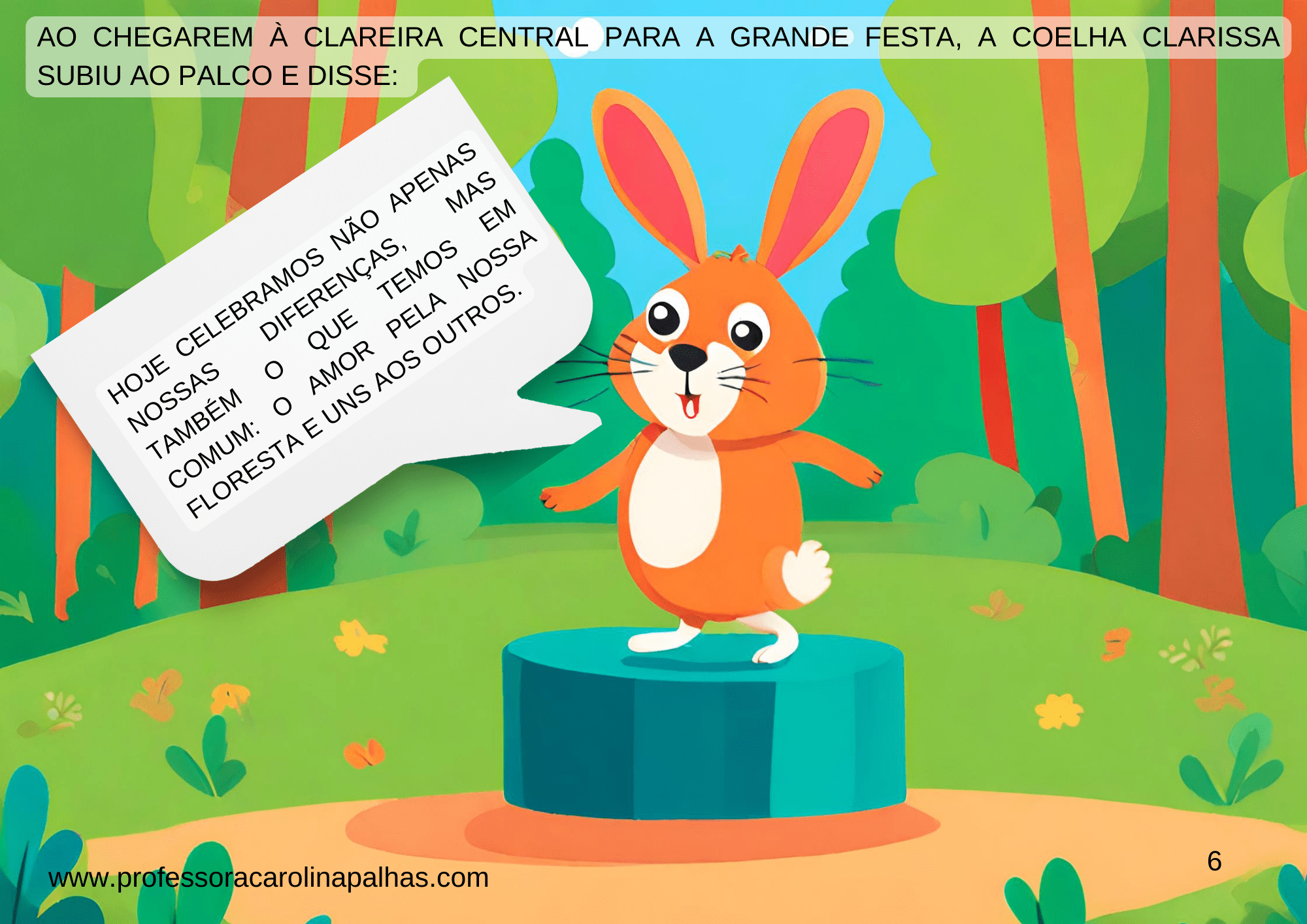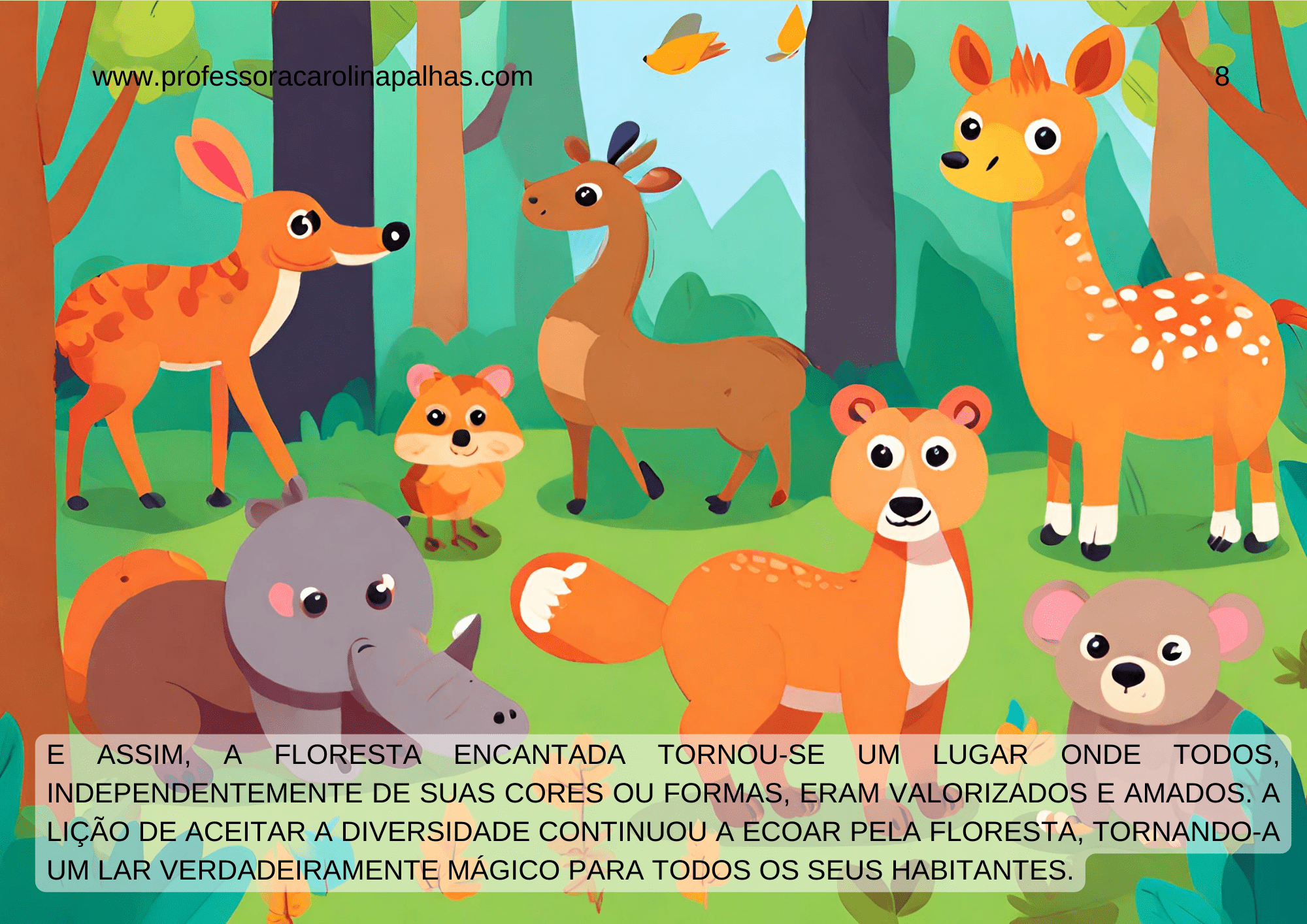 Sou Carolina Palhas, professora apaixonada pela educação infantil e pelo ensino fundamental, e estou emocionada em compartilhar com vocês a história que criei com tanto carinho: “Uma Floresta Encantada: Celebrando as Cores da Diversidade”.