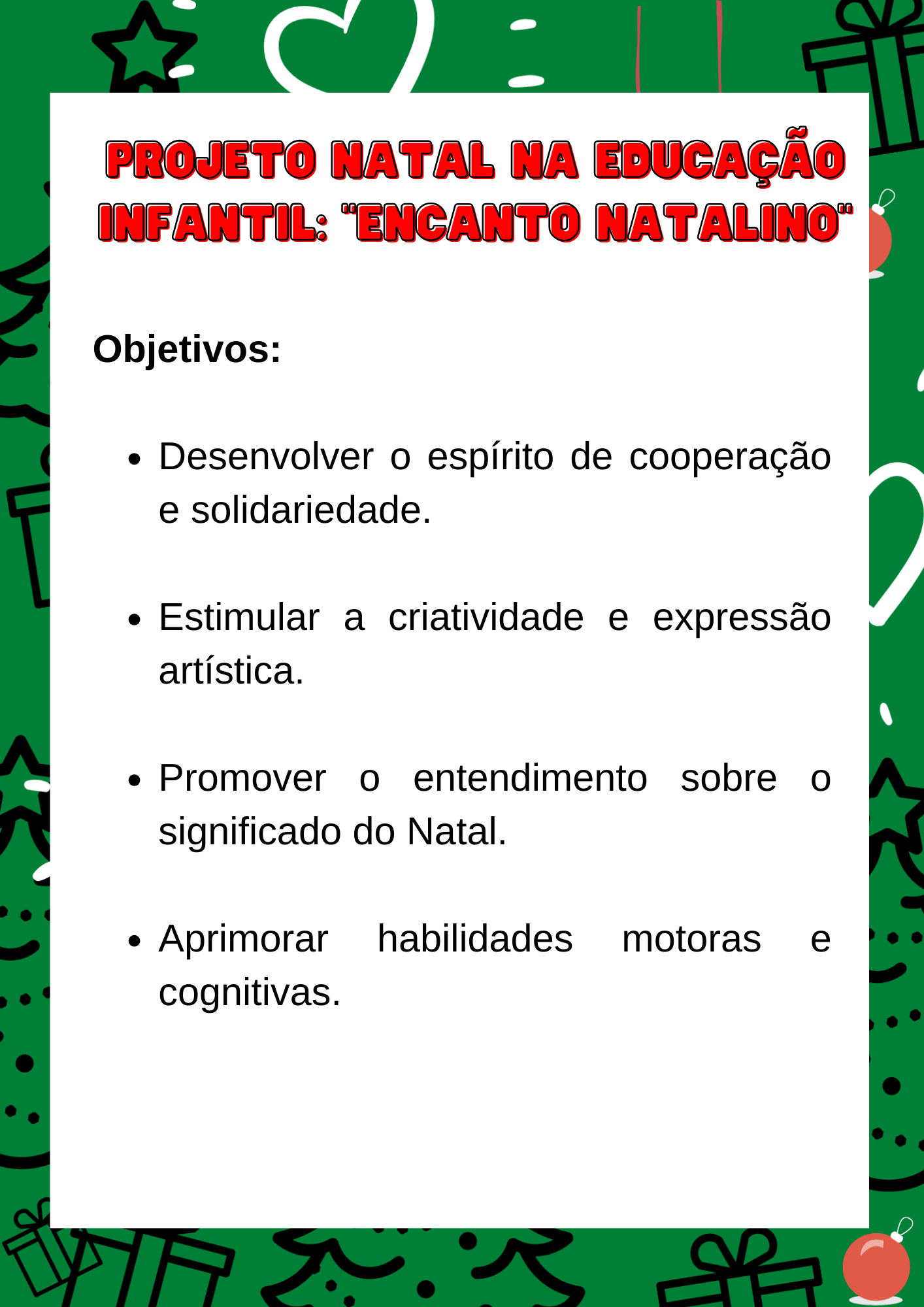 Introdução: O Natal é uma época mágica, repleta de luzes, cores e sentimentos de amor e solidariedade. Na Educação Infantil, é uma oportunidade única de estimular a imaginação das crianças e ensinar valores importantes. Em nosso projeto “Encanto Natalino”, mergulhamos em atividades lúdicas, artísticas e brincadeiras que não só celebram a temporada festiva, mas também promovem o desenvolvimento integral dos pequenos.