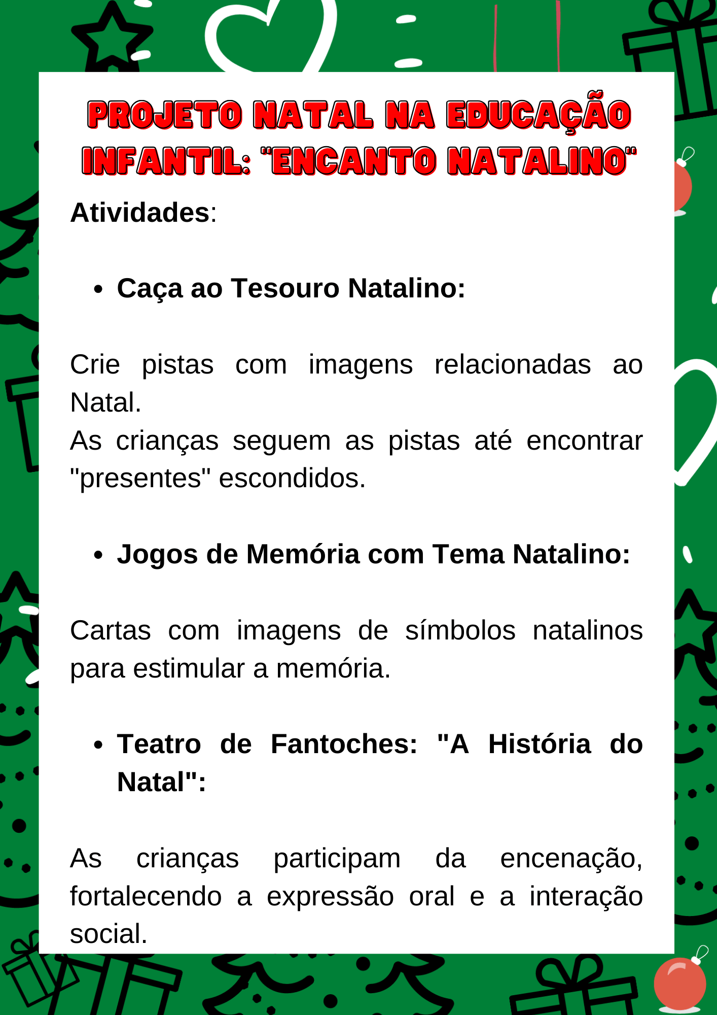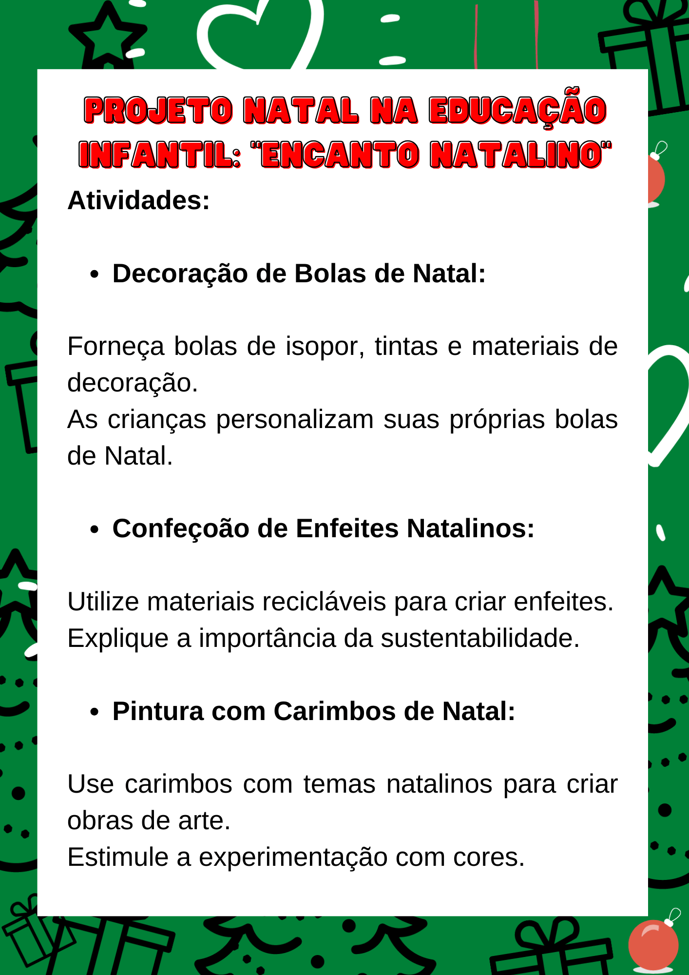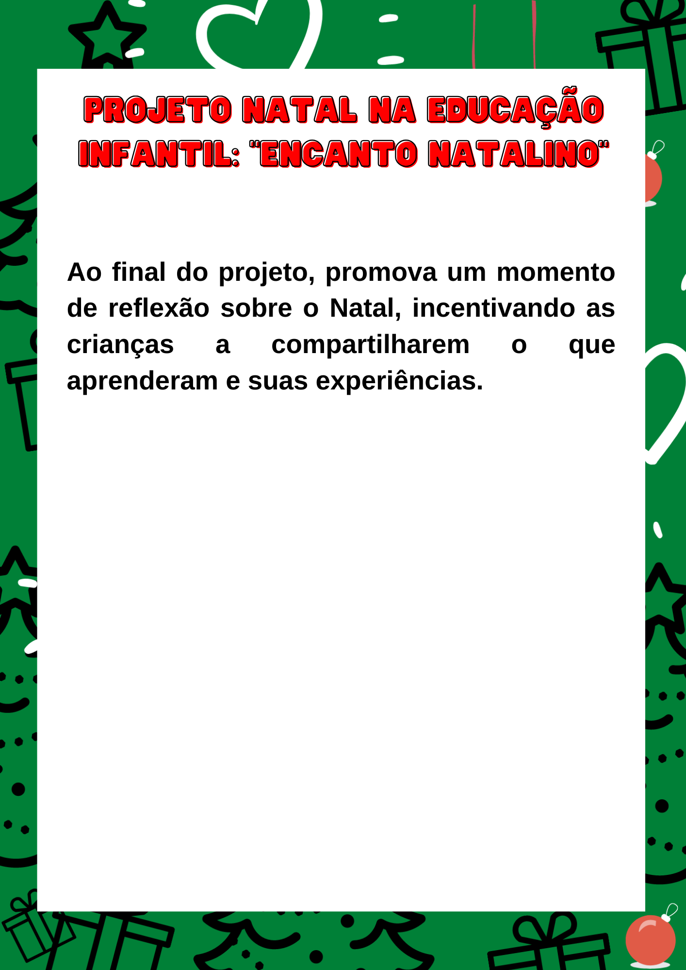 Conclusão: O projeto “Encanto Natalino” na Educação Infantil é uma celebração de aprendizado e diversão, onde as crianças não apenas absorvem o espírito natalino, mas também desenvolvem habilidades importantes para sua formação. No coração deste projeto está a ideia de que, através do brincar e do criar, as crianças constroem memórias preciosas enquanto absorvem lições valiosas sobre o significado do Natal e a importância do espírito comunitário. Que cada risada e cada enfeite feito pelas mãos pequenas possam espalhar alegria e amor nesta temporada especial. Feliz Natal!