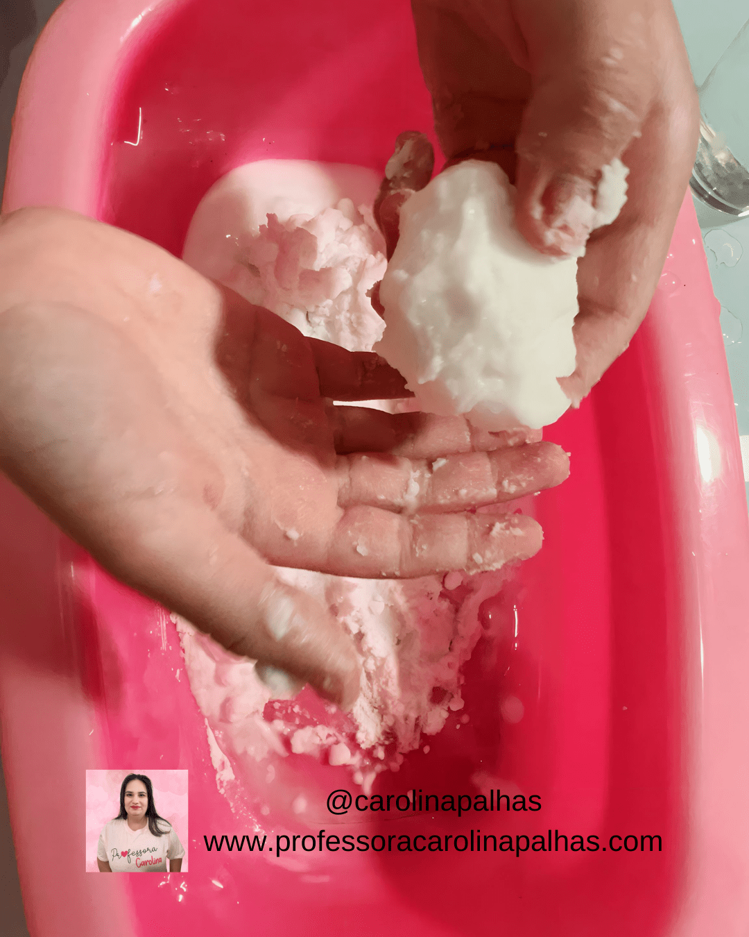 Passo 4: Moldando a Magia: Com a mistura pronta, deixe sua imaginação fluir! Use as mãos para moldar a neve em diversas formas, desde bolas fofas até montes encantados. Sinta-se à vontade para experimentar diferentes texturas e tamanhos.
