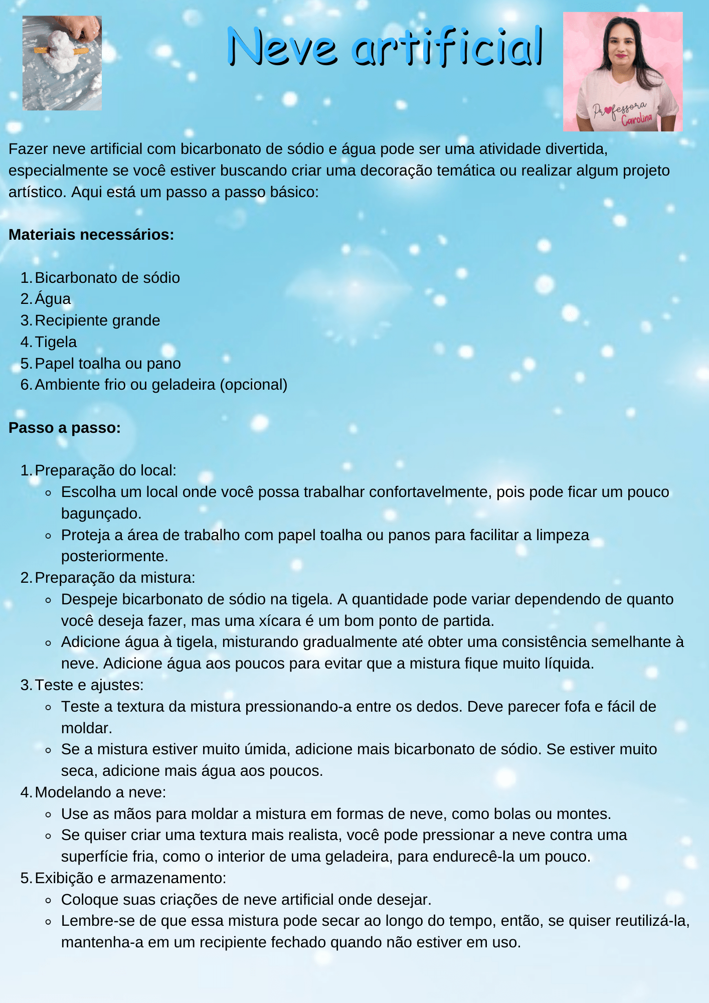 Conclusão: E voilà! Sua própria neve mágica está pronta para encantar e decorar. Coloque suas criações pela casa, crie cenários de inverno em miniatura ou use como parte de uma decoração temática. Lembre-se, a diversão está na jornada criativa, então aproveite cada momento deste projeto encantador! Compartilhe suas criações conosco nas redes sociais usando a hashtag #NeveArtesanal. Estamos ansiosos para ver suas obras de arte! ❄️✨