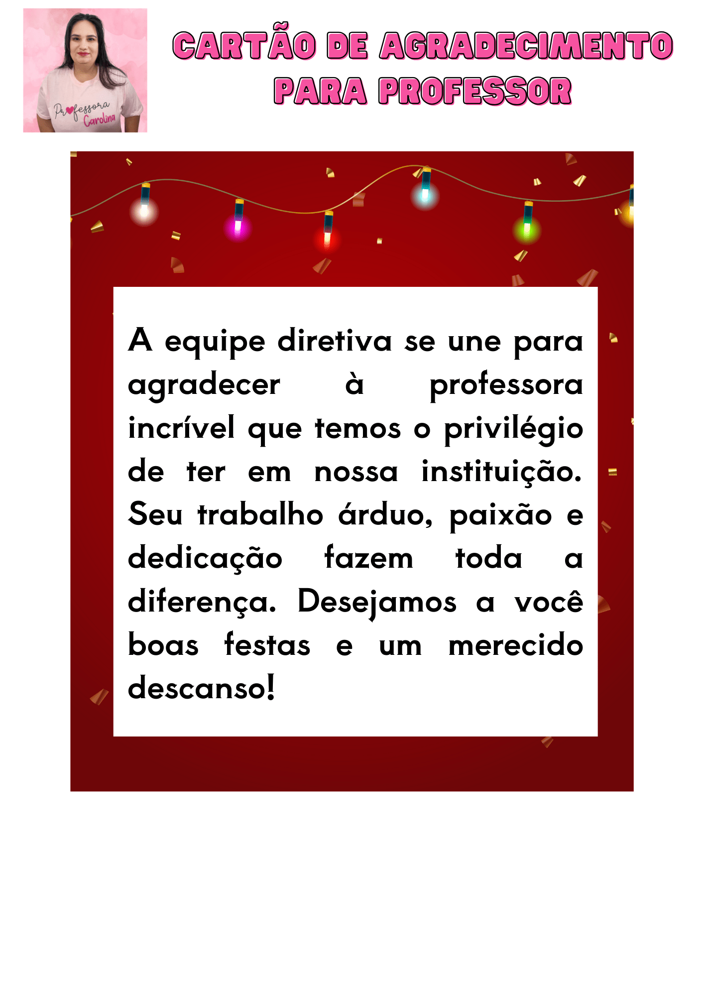 Queremos expressar nossa profunda gratidão pelo seu compromisso incansável com a educação. Seu esforço contínuo em inspirar e orientar nossos alunos é verdadeiramente notável. Obrigado por fazer a diferença todos os dias.
