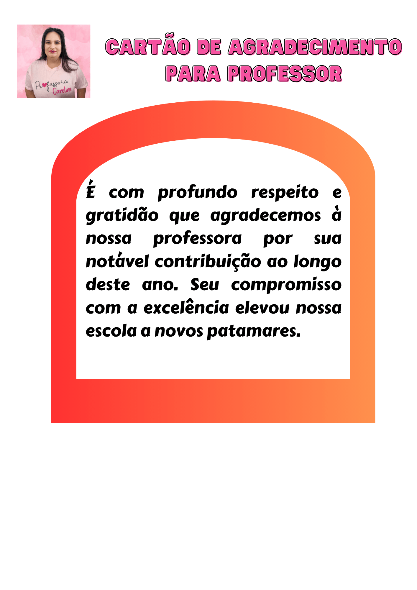 Queremos expressar nossa profunda gratidão pelo seu compromisso incansável com a educação. Seu esforço contínuo em inspirar e orientar nossos alunos é verdadeiramente notável. Obrigado por fazer a diferença todos os dias.