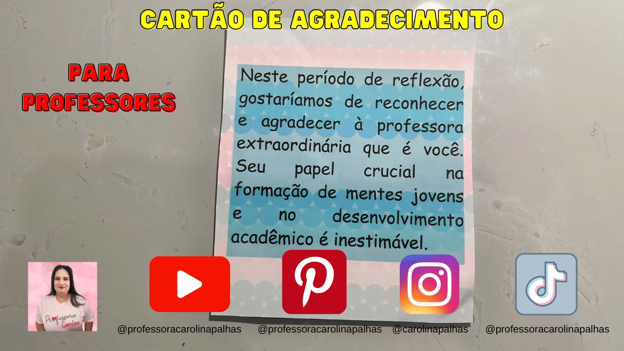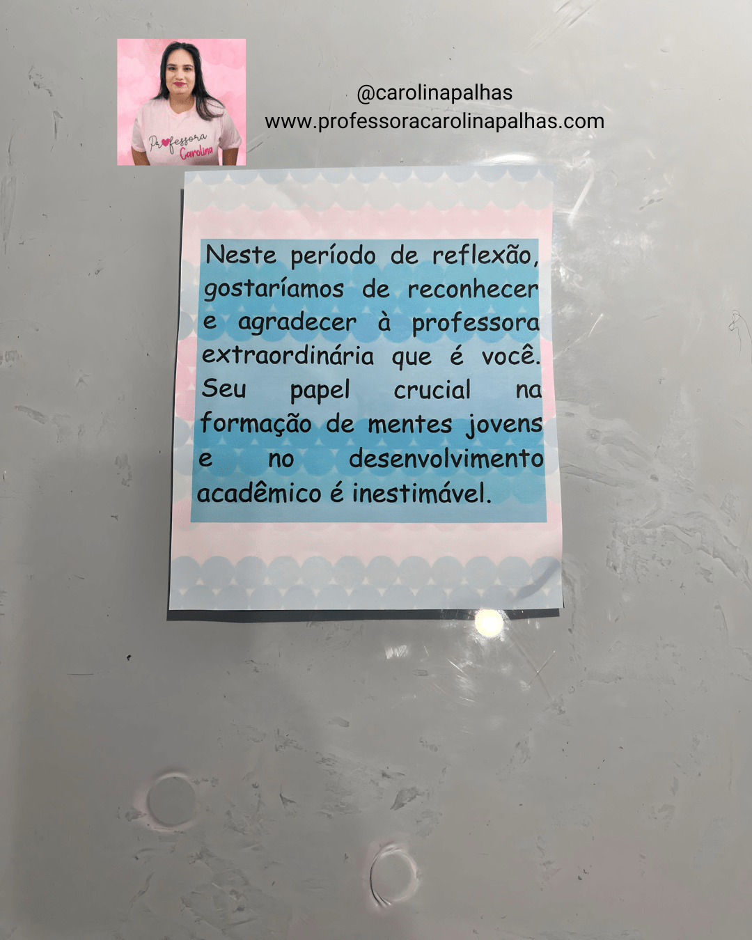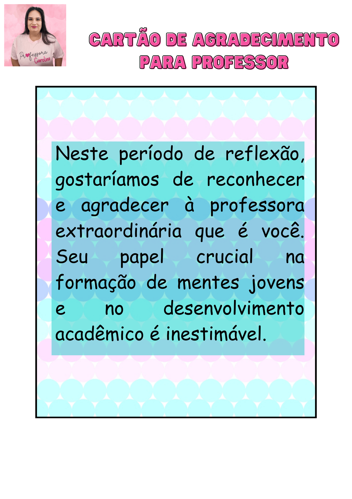 Sua resiliência diante dos desafios e sua capacidade de se adaptar às mudanças são admiráveis. Agradecemos por sua dedicação inabalável ao proporcionar uma educação de qualidade, mesmo em tempos difíceis. Seu compromisso é verdadeiramente inspirador.
