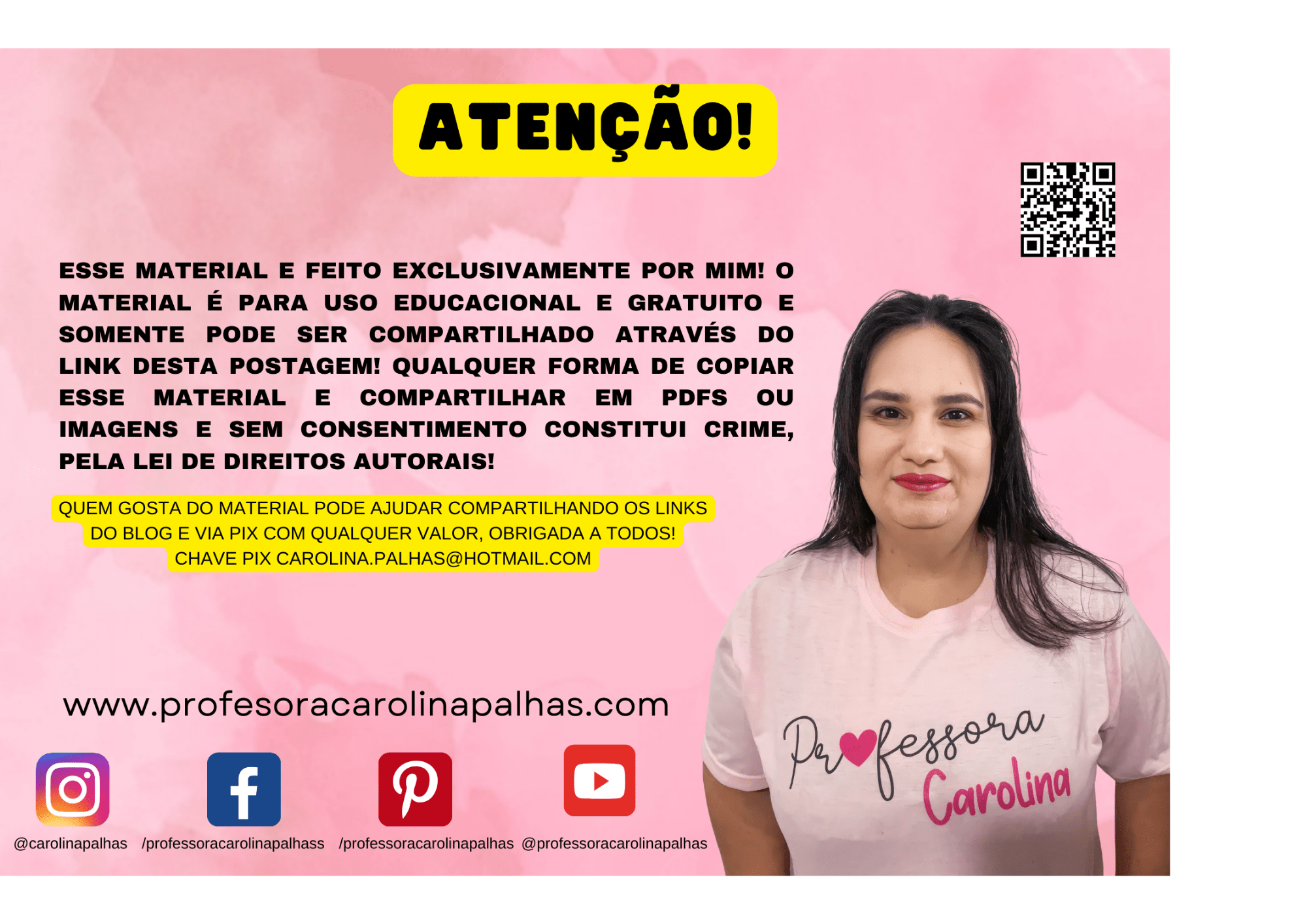 OBSERVAÇÃO: Esse material é feito exclusivamente por mim! O material é para uso educacional e gratuito e somente pode ser compartilhado através do link desta postagem! Qualquer forma de copiar esse material e compartilhar em PDFS ou imagens e sem consentimento constitui crime, pela lei de direitos autorais!