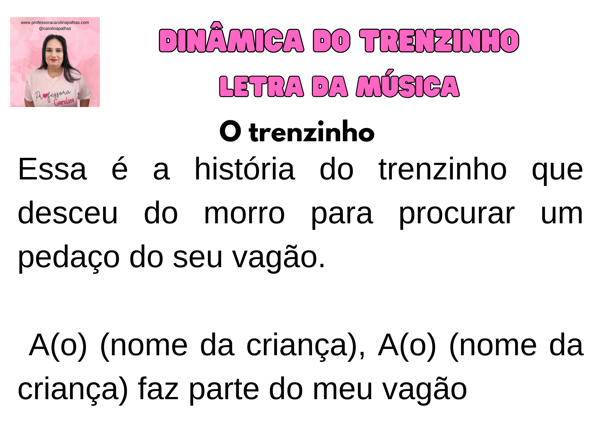“Essa é a história do trenzinho, Que desceu do morro para procurar, Um pedaço do seu vagão. O nome da criança, o nome da criança, Faz parte do meu vagão.”