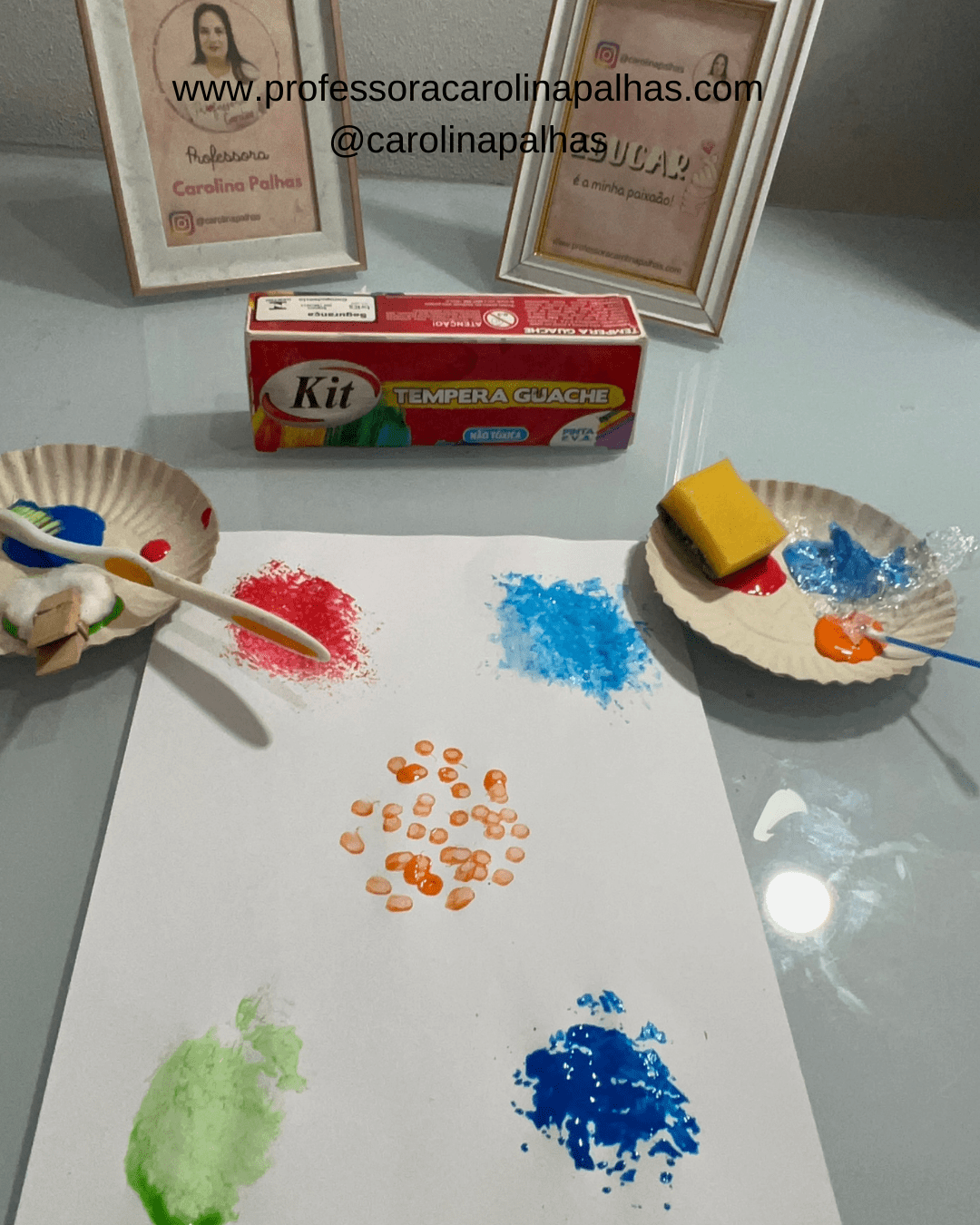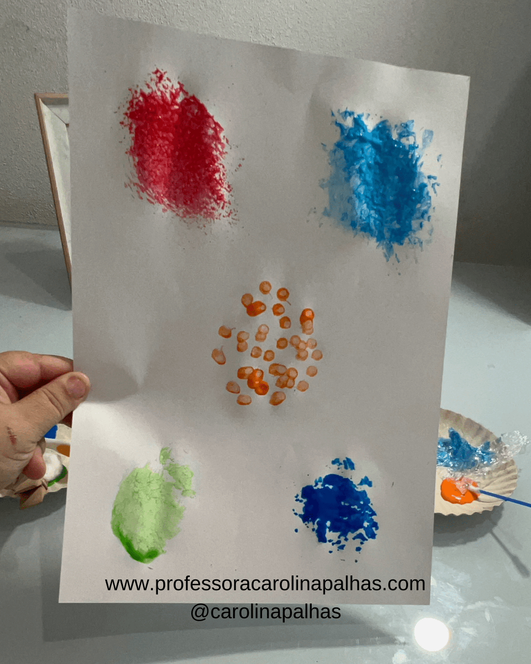 - Espalhe guache sobre uma folha de plástico bolha.