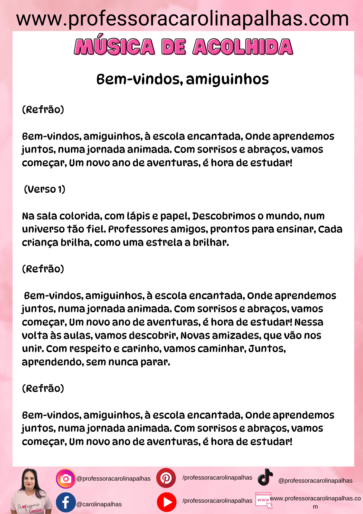 Refrão: Bem-vindos, amiguinhos, à escola encantada, Onde aprendemos juntos, numa jornada animada. Com sorrisos e abraços, vamos começar, Um novo ano de aventuras, é hora de estudar!