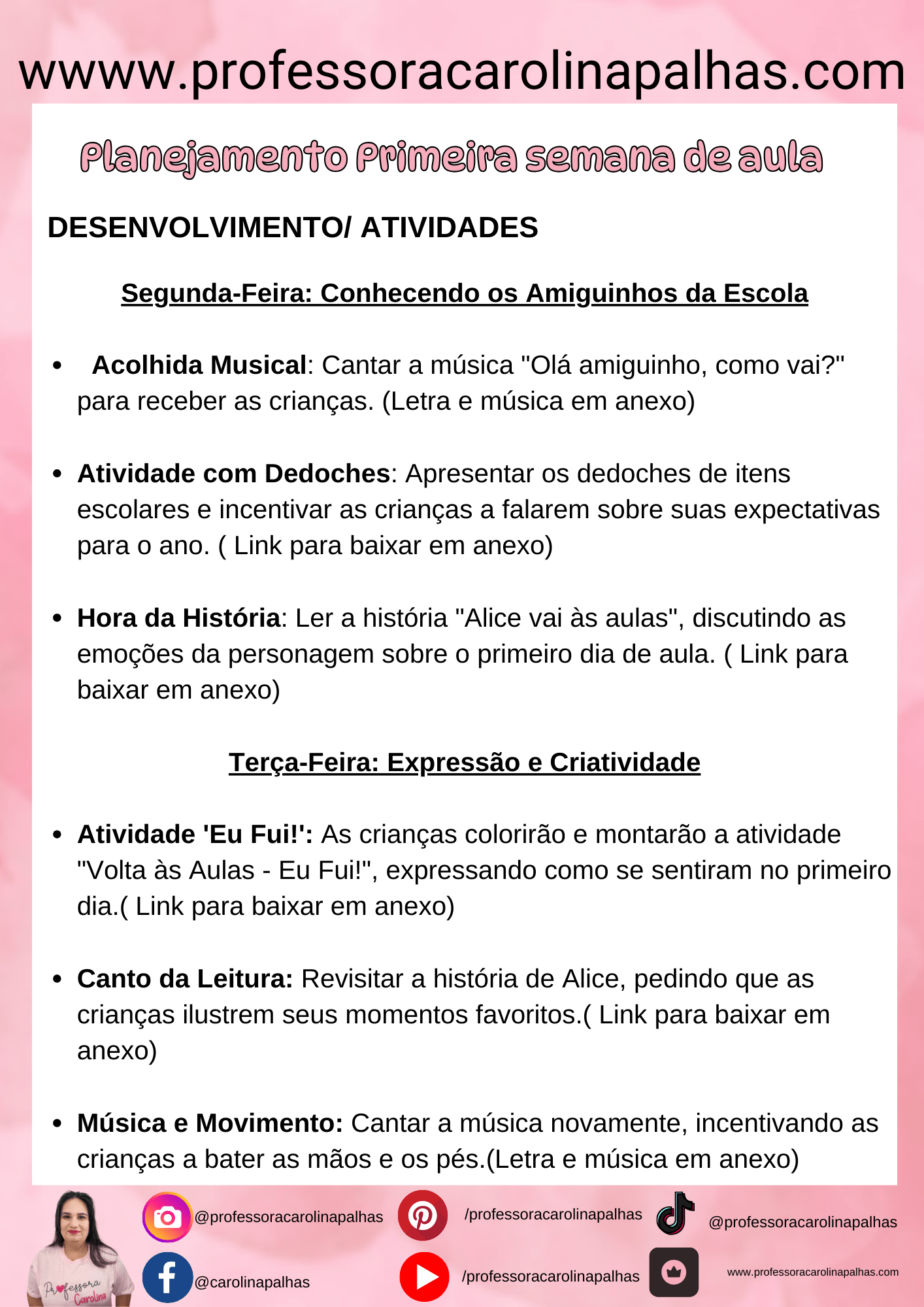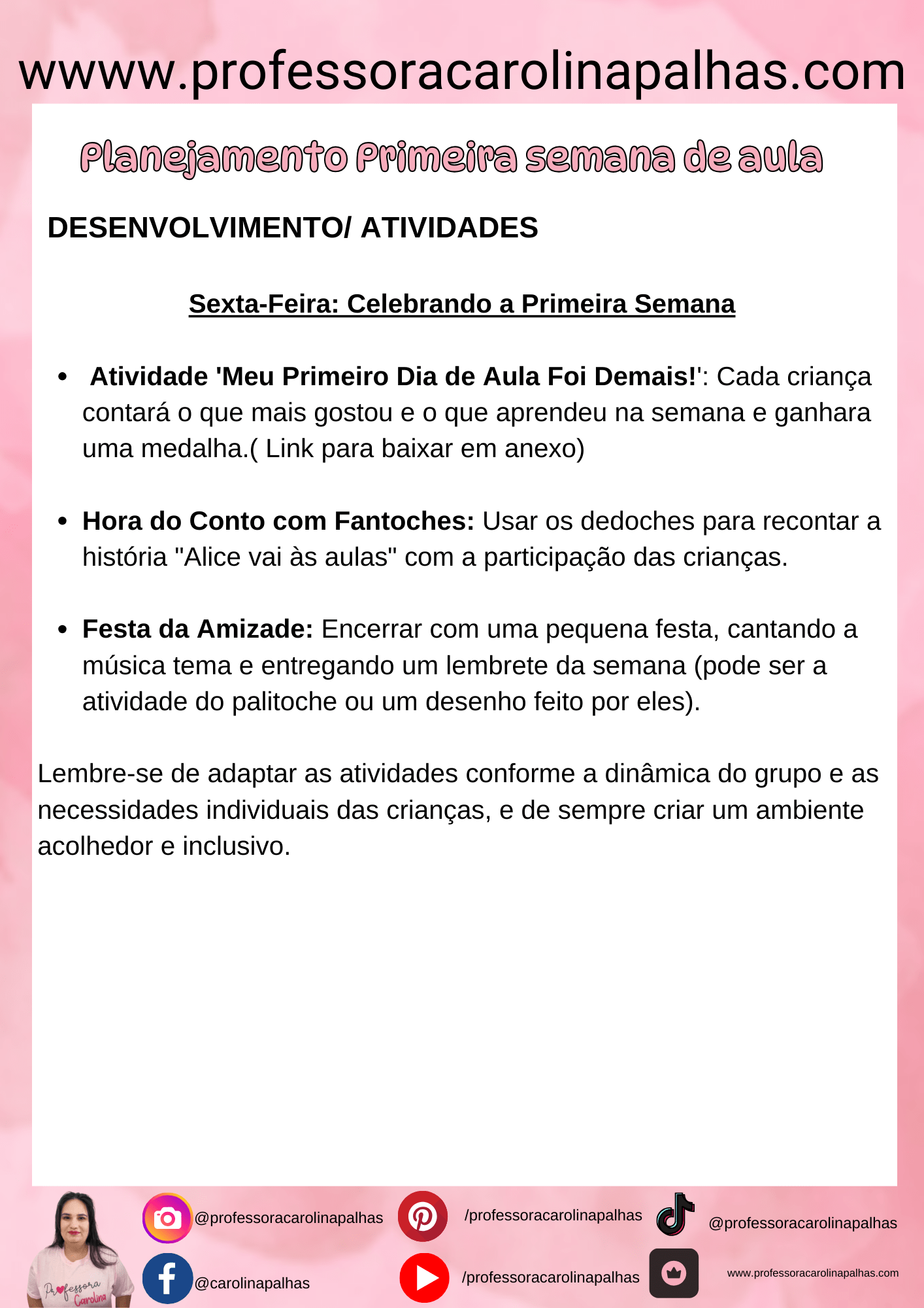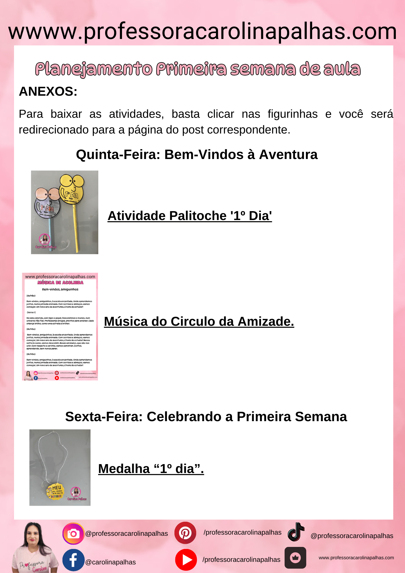 Sexta-feira: Medalhas de Reconhecimento Encerramos a semana premiando cada pequeno aluno com uma medalha de reconhecimento pelo seu primeiro dia de aula, reforçando o sentimento de conquista e pertencimento. O download está disponível aqui.