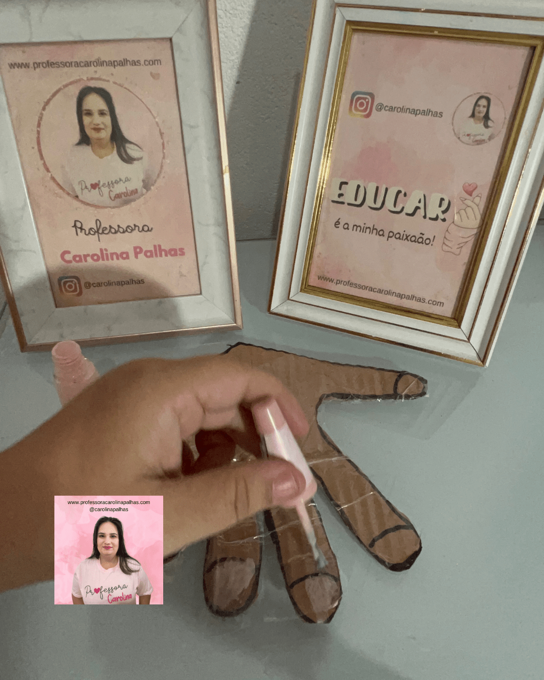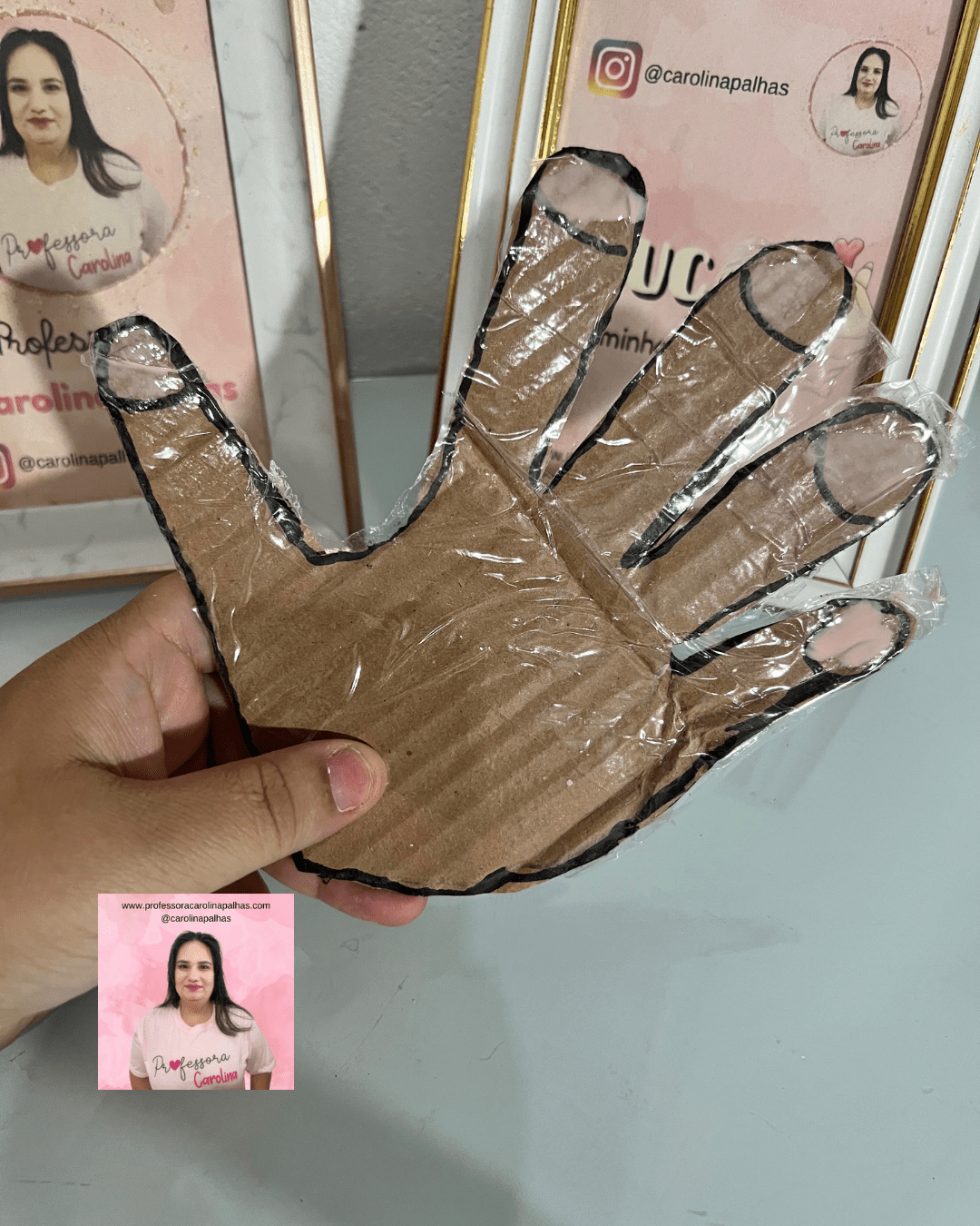 Imagens mostram Carolina fazendo os contornos das mãos, recortando e plastificando.