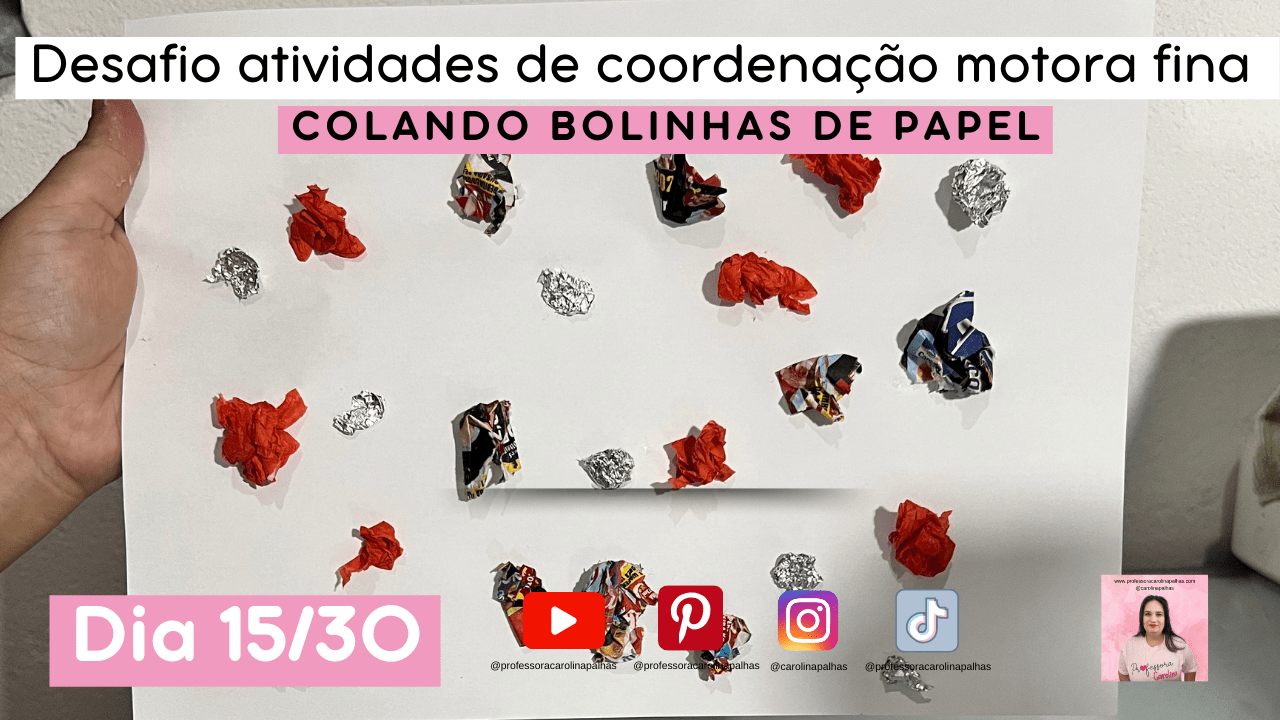 Olá, queridas famílias e educadores! Carolina Palhas está de volta com mais uma atividade especial do nosso Desafio de 30 Dias. Hoje, trago para vocês a encantadora Atividade 15\30 – Arte com Bolinhas de Papel! 🌟🎈