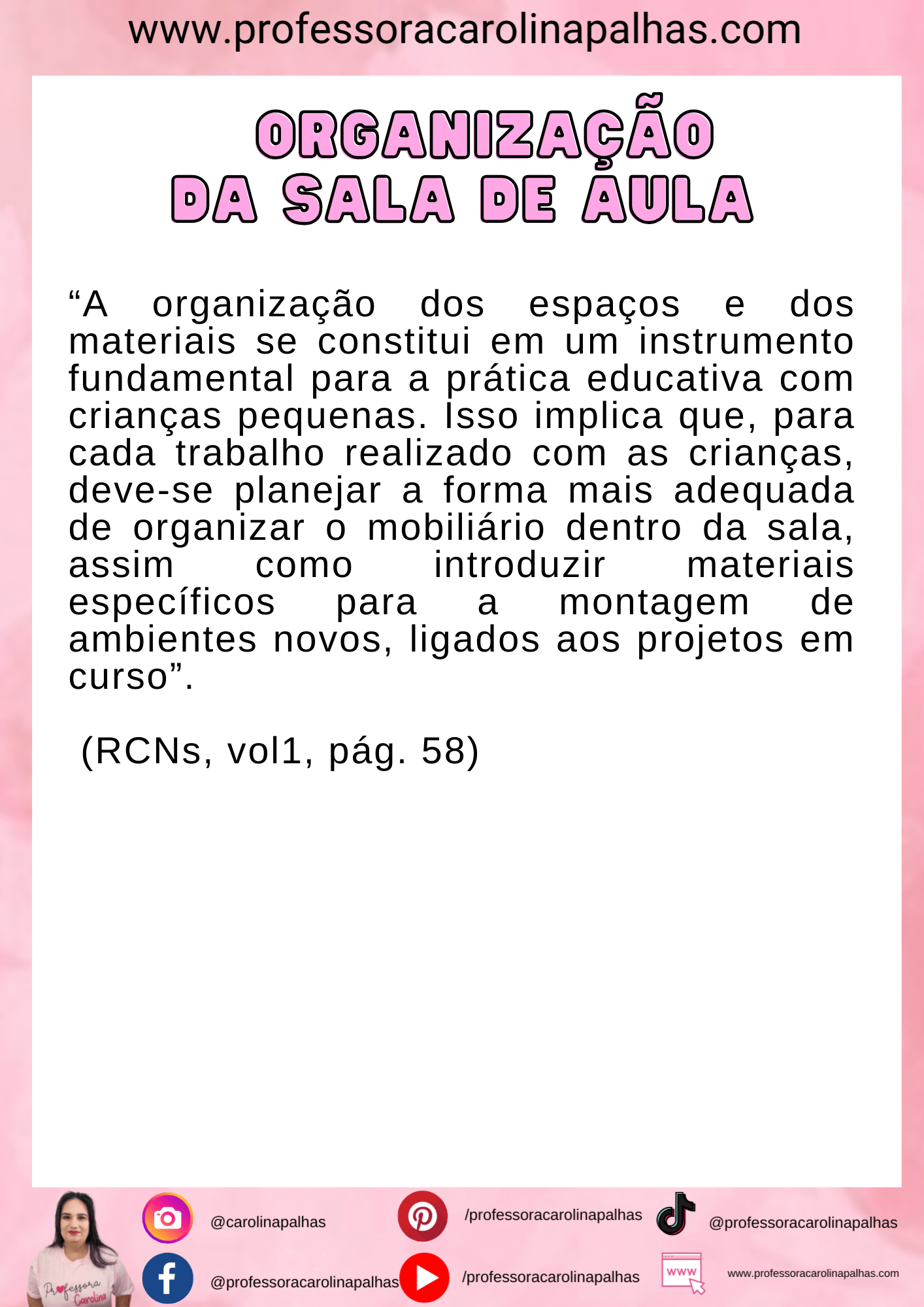 As atividades propostas às crianças podem ocorrer em diferentes locais, estendendo-se para fora da sala de aula, como a rua, o bairro e a cidade. Conforme as atividades são realizadas, os espaços organizadosário na sala de aula, bem como a seleção e introdução de materiais específicos que contribuam para a criação de ambientes novos e estimulantes, alinhados aos projetos pedagógicos em andamento (RCNs, vol. 1, p. 58).