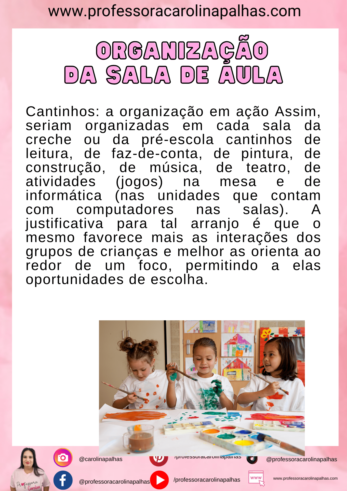 Uma abordagem recomendada para a organização do espaço é a criação de áreas específicas para diferentes atividades, conhecidas como “cantinhos”. Essas áreas podem incluir cantinhos de leitura, faz-de-conta, pintura, construção, música, teatro, jogos de mesa e informática (quando disponível). Essa organização favorece a interação entre grupos de crianças e oferece oportunidades de escolha, centrando a atenção em torno de um tema específico. Os cantinhos podem ser permanentes ou montados diariamente, de acordo com o planejamento do professor ou as sugestões das crianças. Geralmente, eles podem permanecer montados por um mês, mas o importante é que todas as crianças tenham a chance de explorar e se familiarizar com cada um deles. A necessidade de mudança é sinalizada quando as crianças começam a perder o interesse, indicando a necessidade de novos desafios.