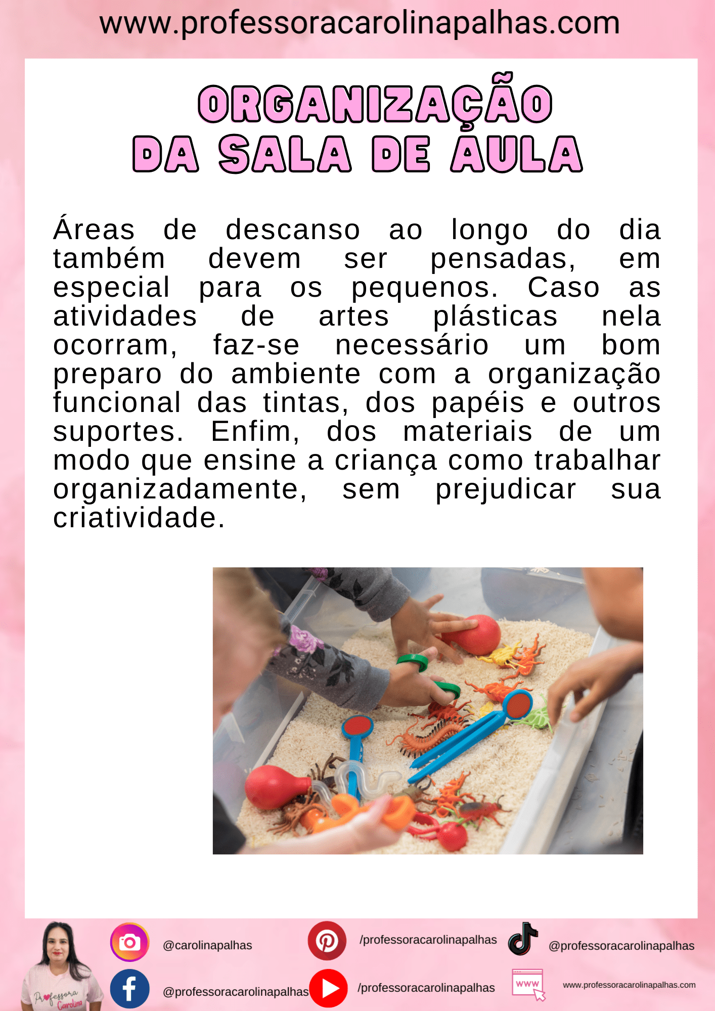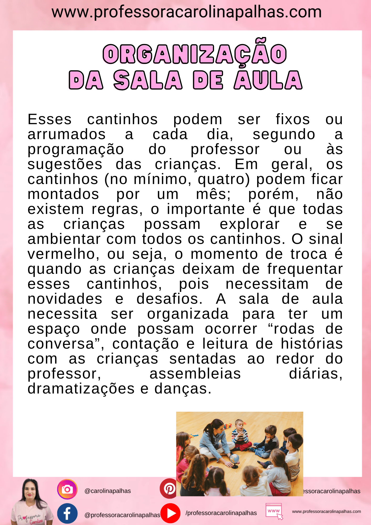 Além disso, a sala de aula deve ser organizada para acomodar “rodas de conversa”, contação e leitura de histórias, assembleias diárias, dramatizações e danças, com as crianças sentadas ao redor do professor. Também é importante prever áreas de descanso, especialmente para os mais pequenos. Se as atividades de artes plásticas forem realizadas na sala, é necessário preparar o ambiente de forma funcional, organizando tintas, papéis e outros materiais de maneira que ensine as crianças a trabalhar de forma organizada, sem comprometer sua criatividade.