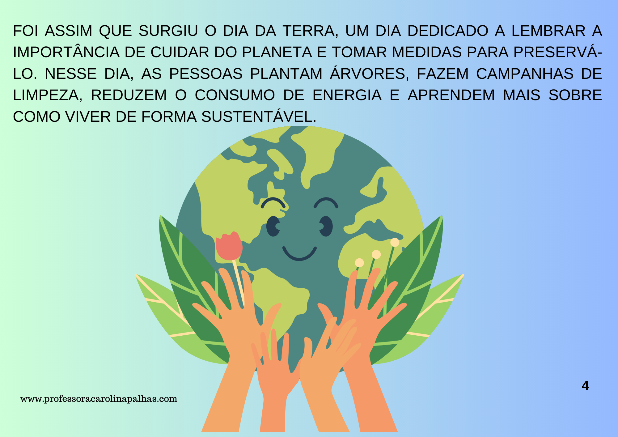 O Dia da Terra é comemorado, todos os anos, em 22 de abril. Essa data é importante para refletirmos a respeito de como nossas ações impactam negativamente a vida no nosso planeta, e é um momento para cobrarmos medidas mais eficientes de preservação da natureza. É um momento também de mudança de comportamento para que consigamos deixar um planeta saudável para as próximas gerações.