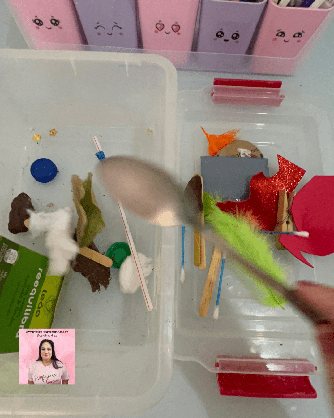 - Passo a Passo: Organize objetos coloridos para formar uma imagem ou padrão em uma bandeja.