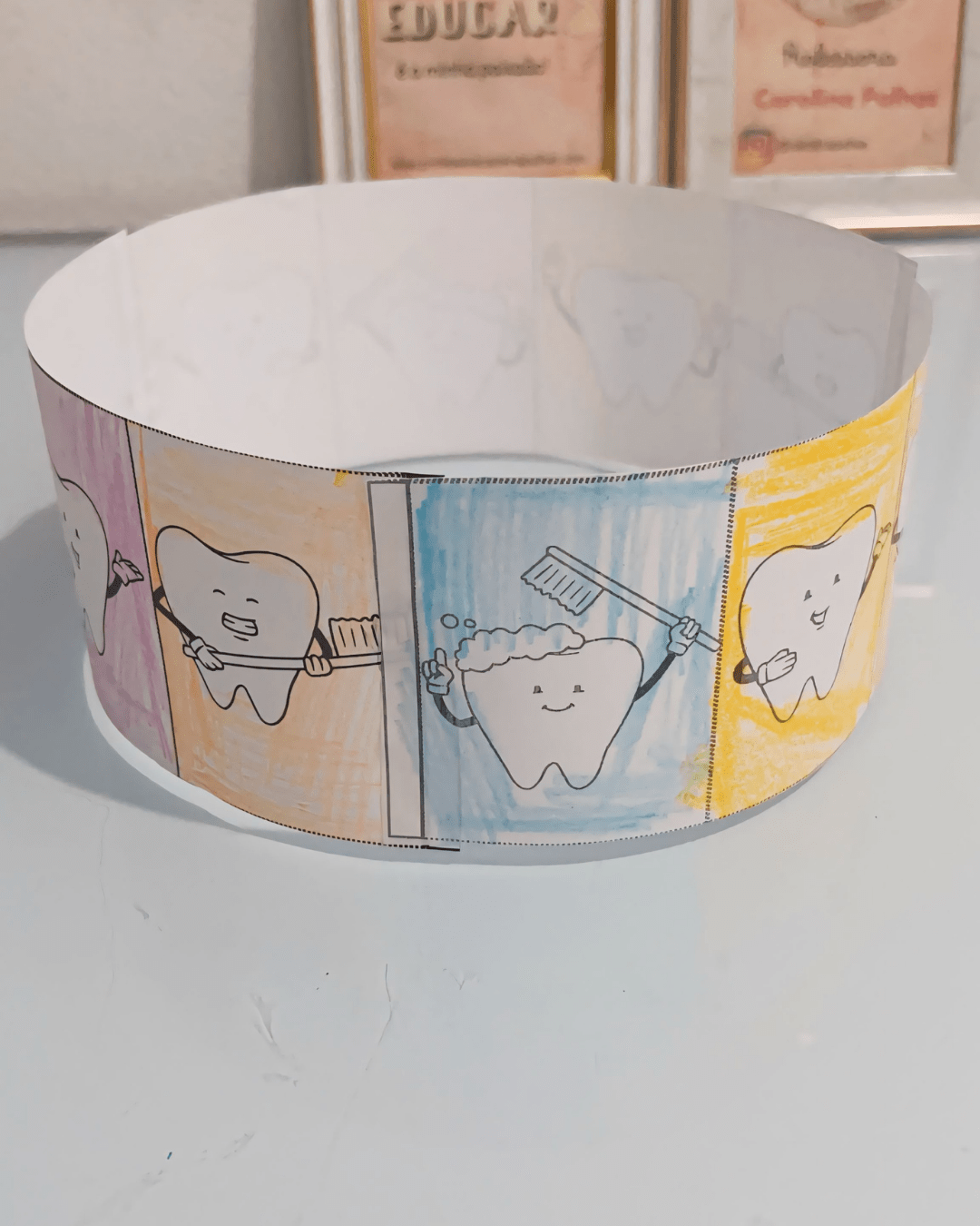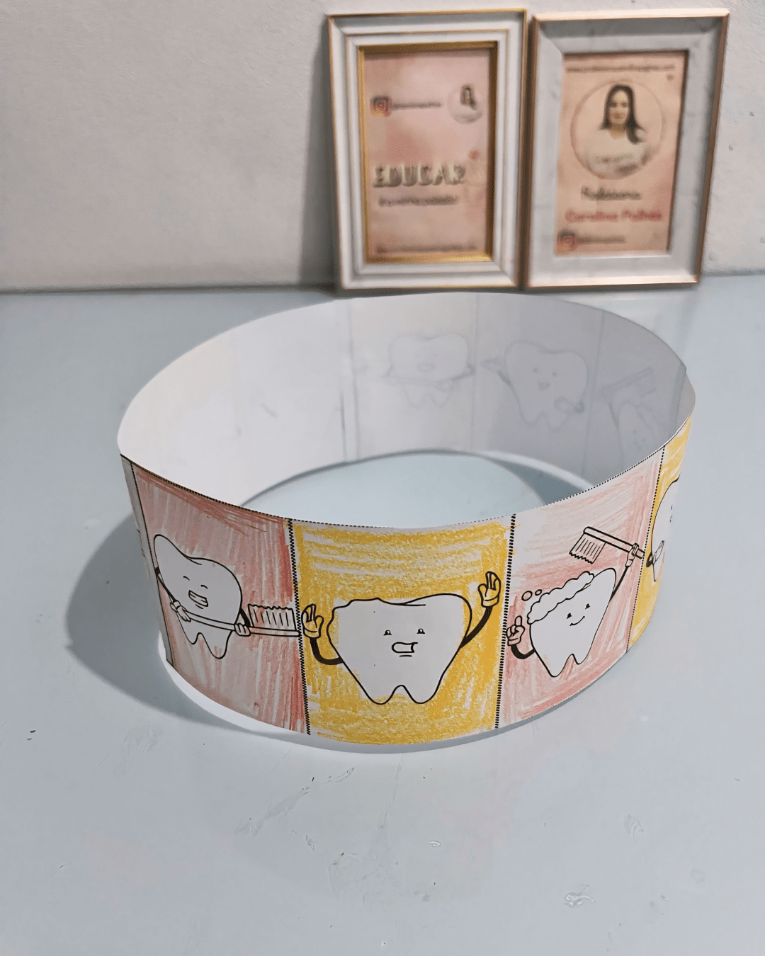 • Atividades na Mesa: Criamos um mural coletivo com fotos e desenhos das atividades da semana, celebrando os aprendizados sobre a higiene bucal.