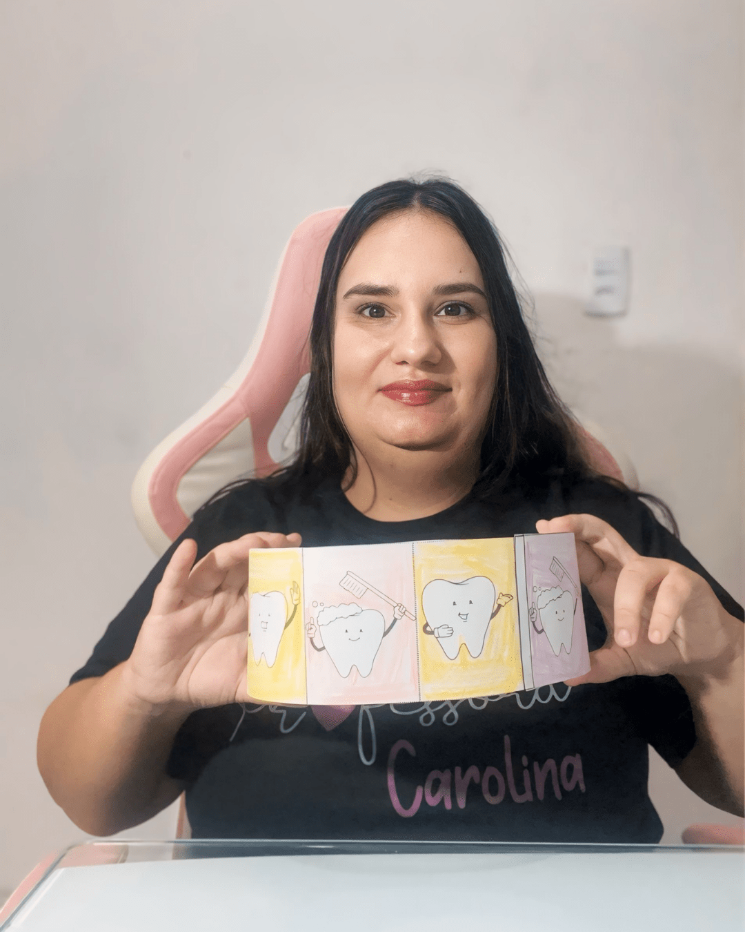 • Continuamos com mais jogos, como tabuleiros educativos sobre saúde bucal, e realizamos workshops de escovação supervisionada. As histórias interativas seguem reforçando os personagens que aprendem sobre a higiene bucal.