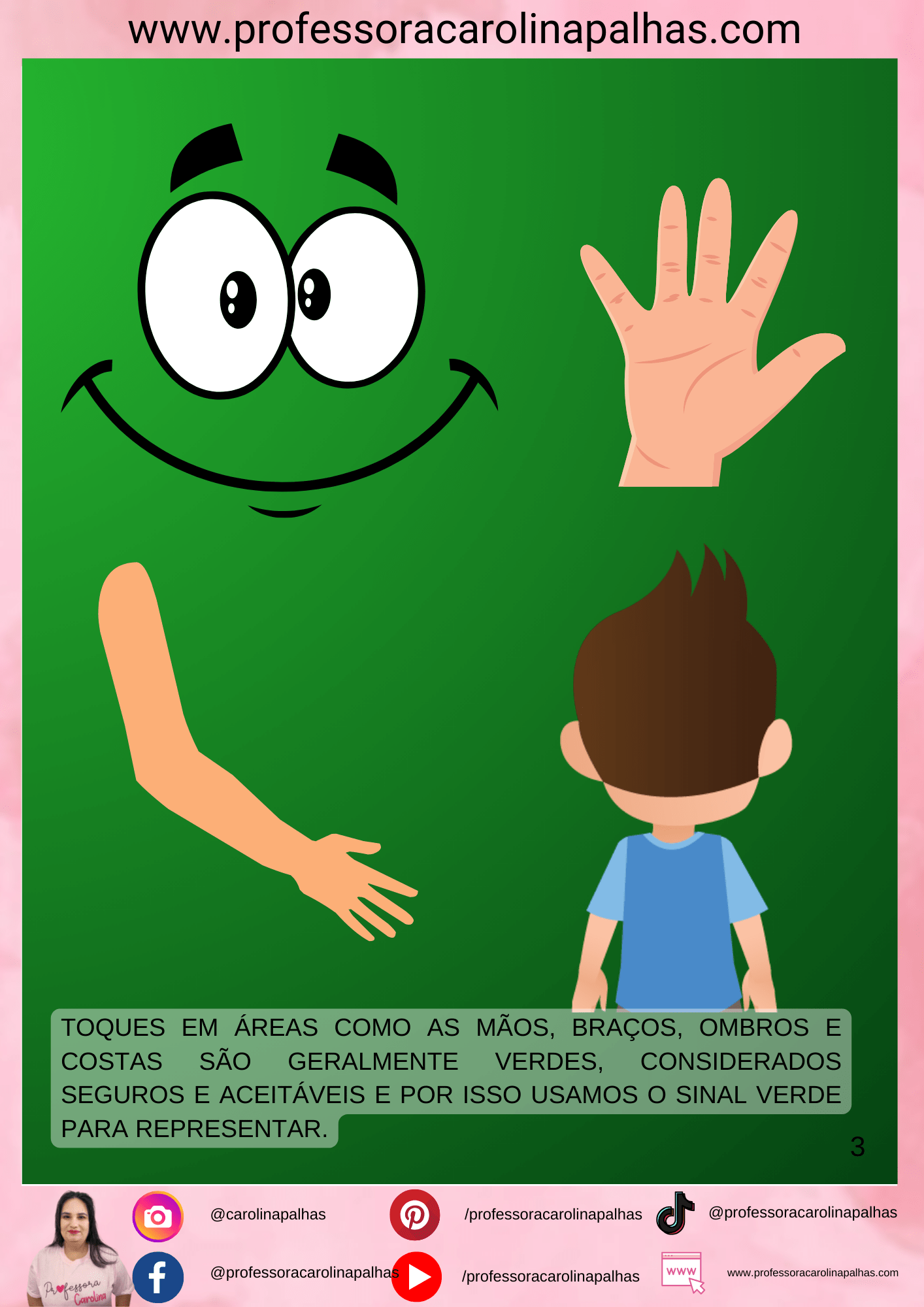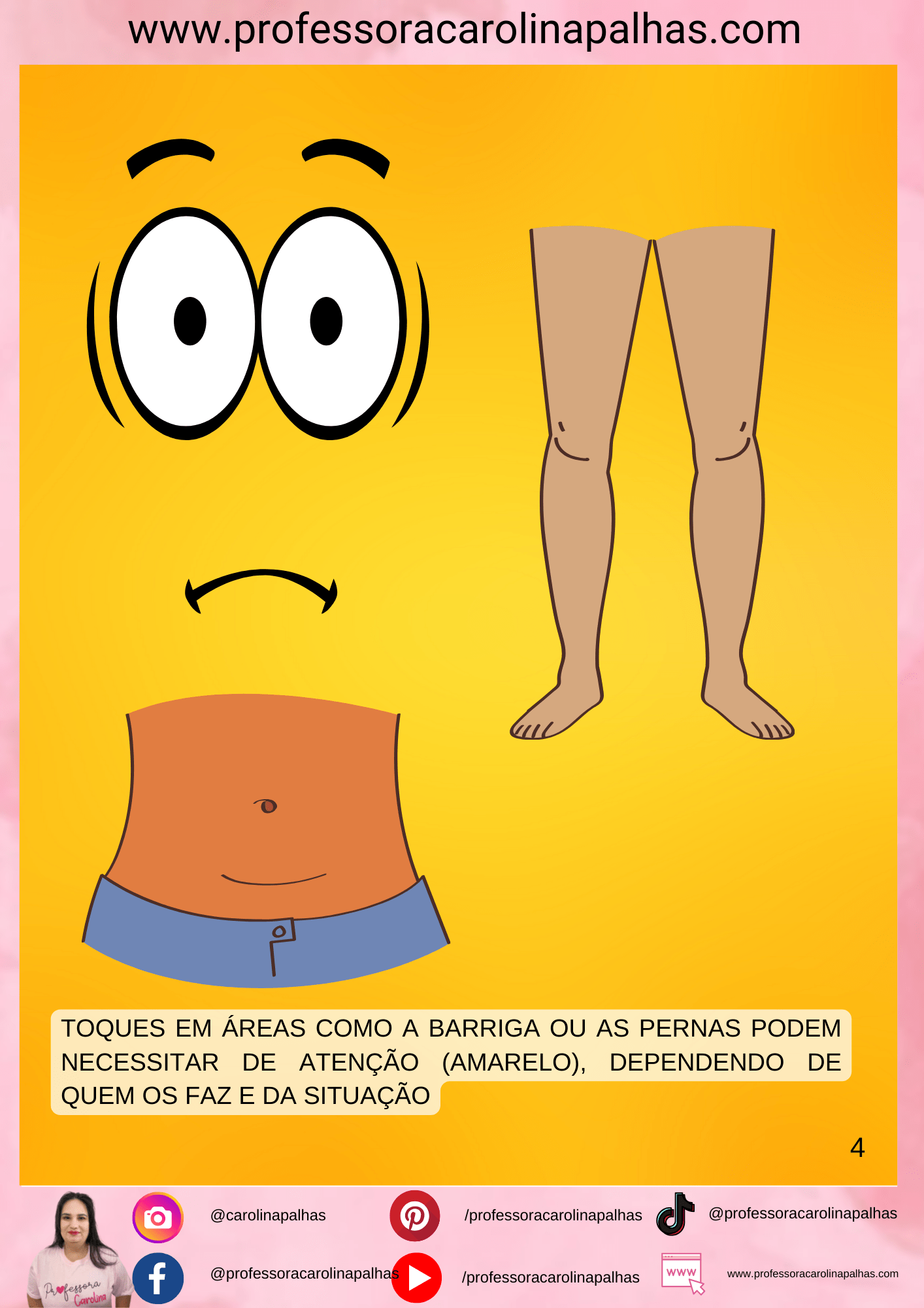 - Jogo do Semáforo: Crie um jogo interativo onde as crianças avançam em um tabuleiro com base em cartões que descrevem diferentes tipos de toques, decidindo se são “verde”, “amarelo” ou “vermelho”. Isso reforça o aprendizado de forma divertida e engajante.