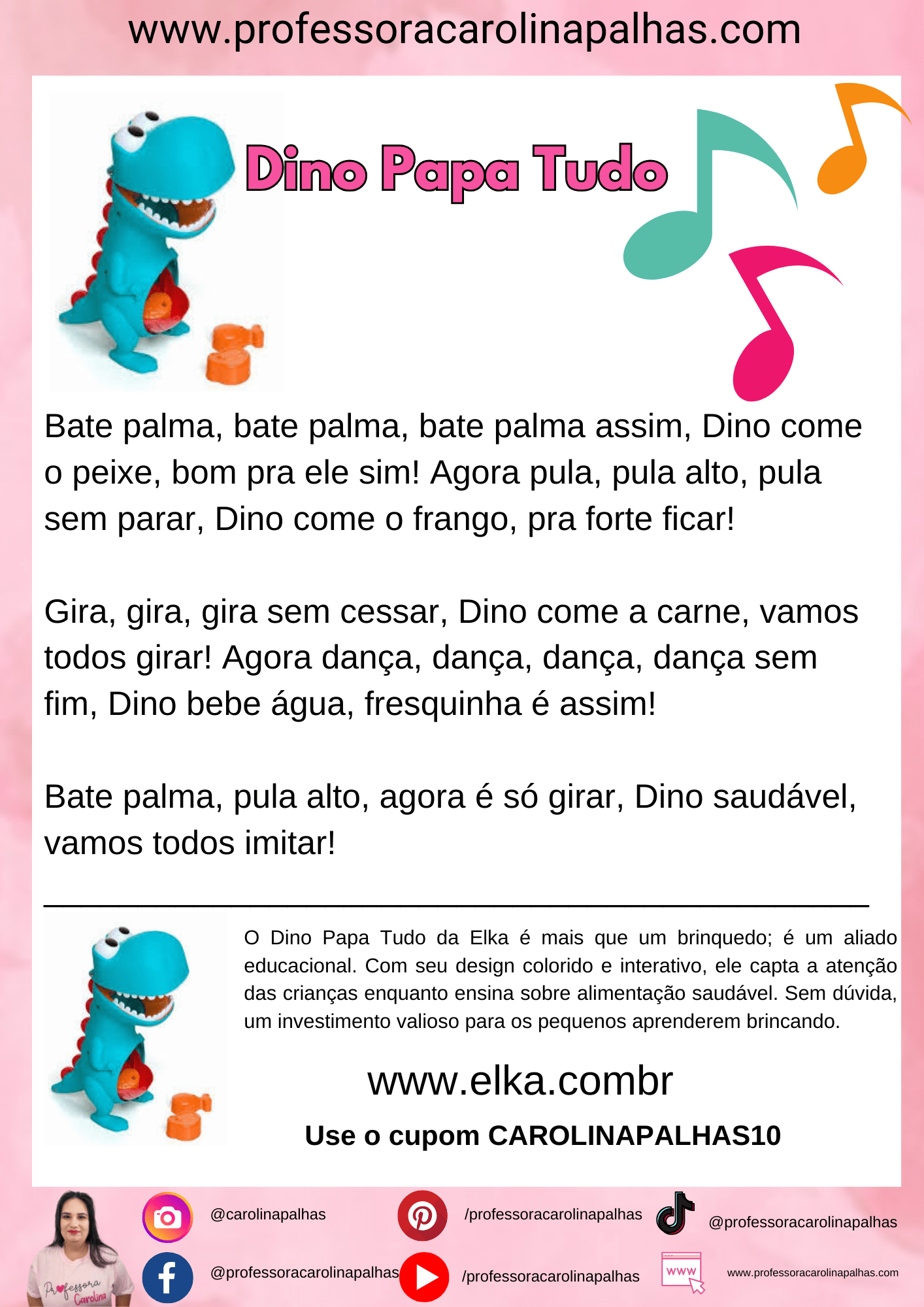 Para enriquecer essa experiência musical, utilizo o “Dino Papa Tudo”, um brinquedo super educativo e campeão de vendas da Elka. Esse brinquedo não só diverte as crianças, mas também as ensina sobre diferentes tipos de alimentos e a importância de uma dieta equilibrada.