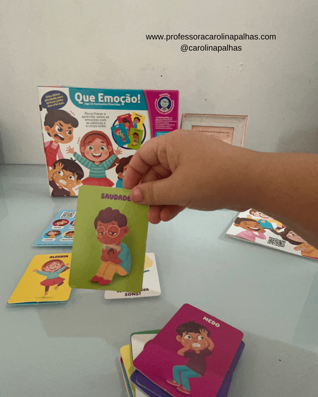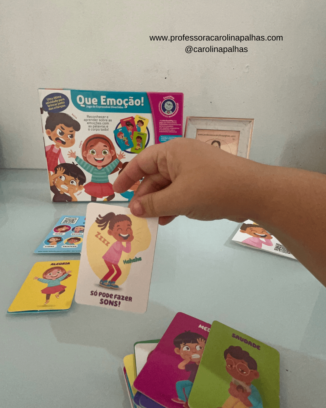 2. Use o jogo “Que Emoção!” da Elka para reforçar o aprendizado. Este jogo desafia as crianças a reconhecerem e imitarem emoções usando cartas que mostram diferentes expressões faciais e corporais.