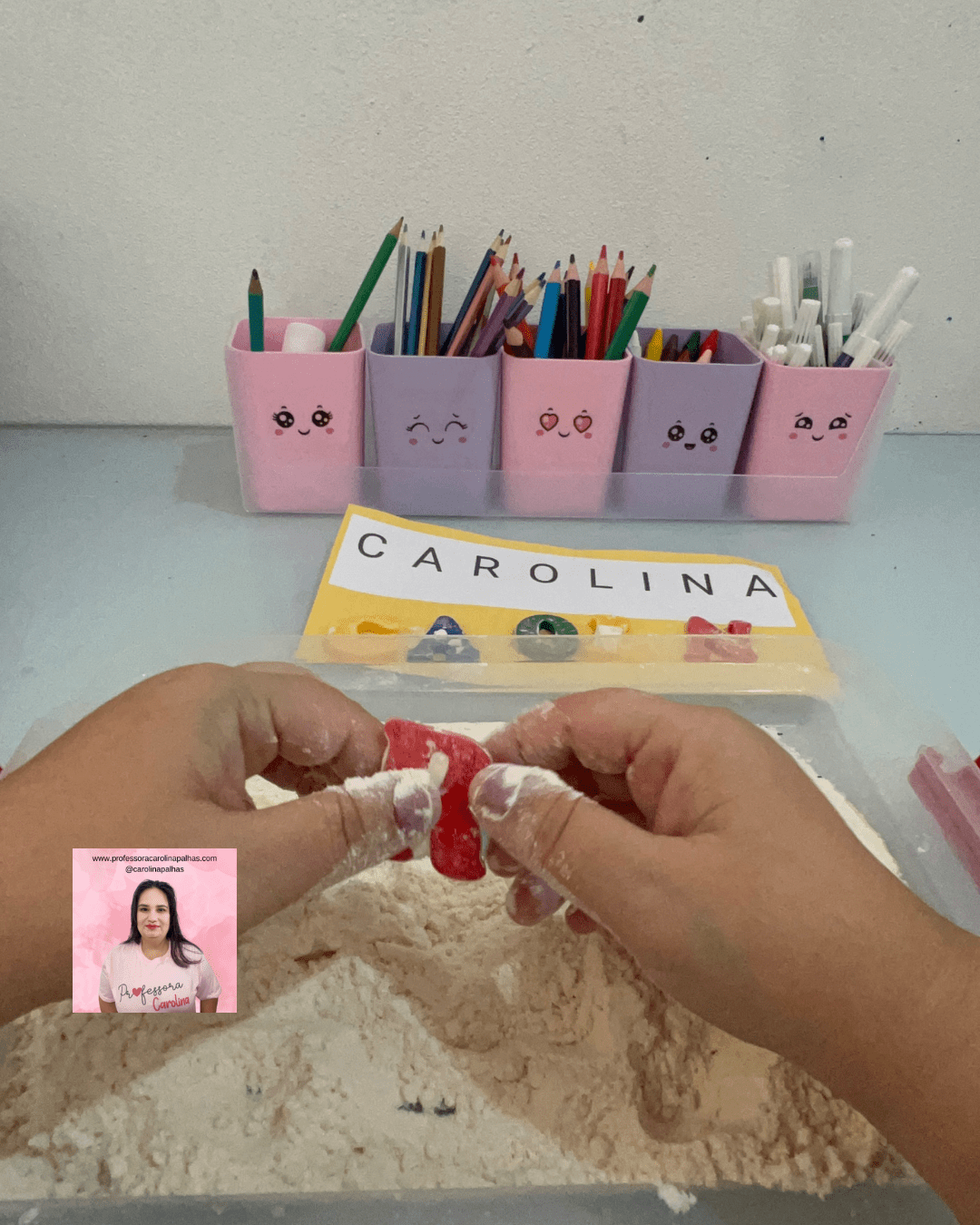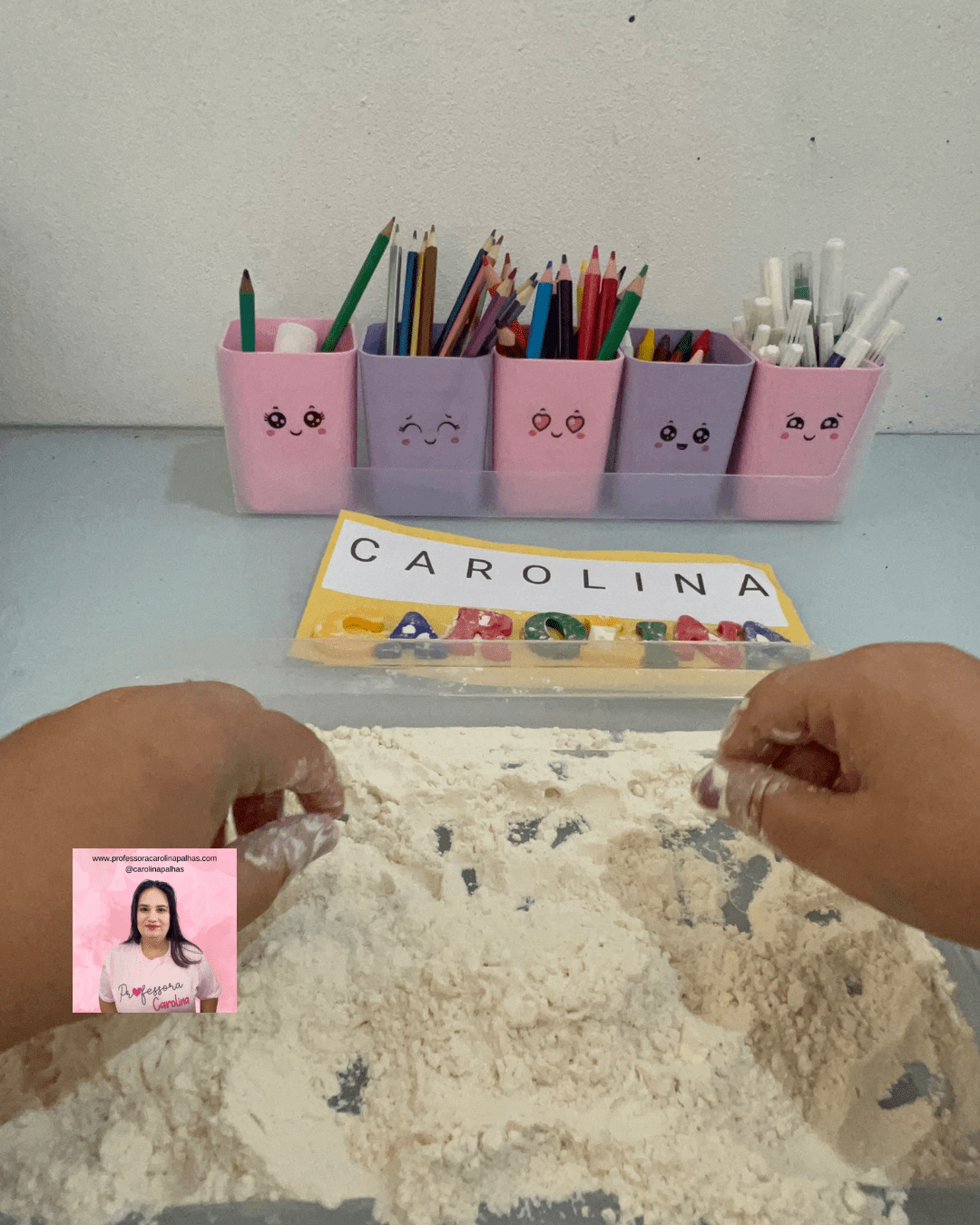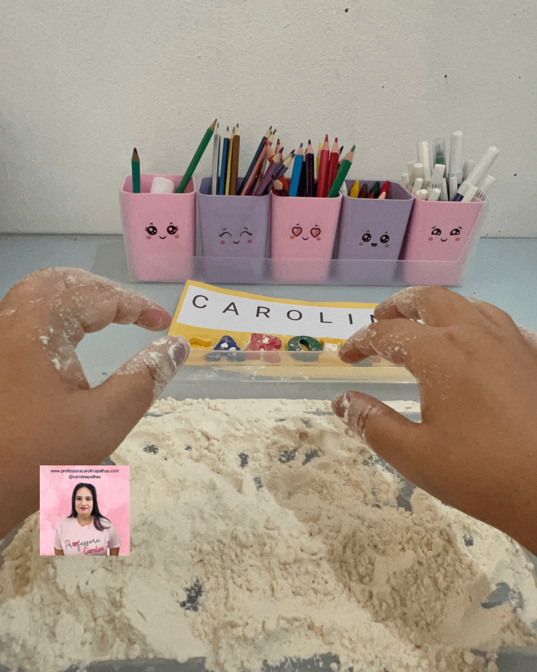 - Desenvolvimento da coordenação motora fina: A manipulação da farinha e das letras ajuda a desenvolver habilidades motoras.