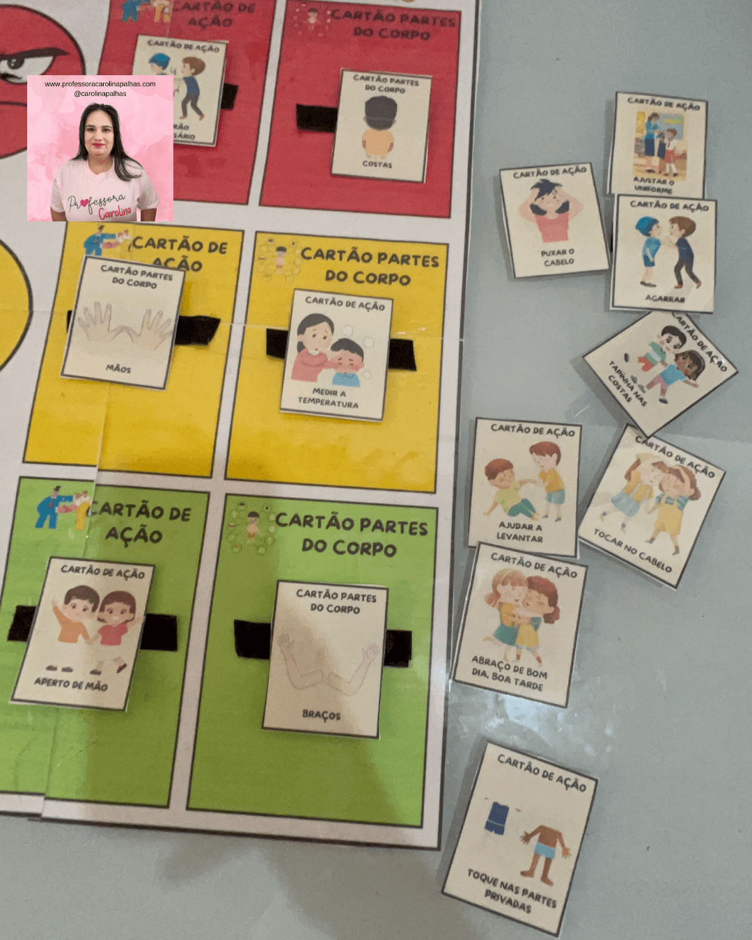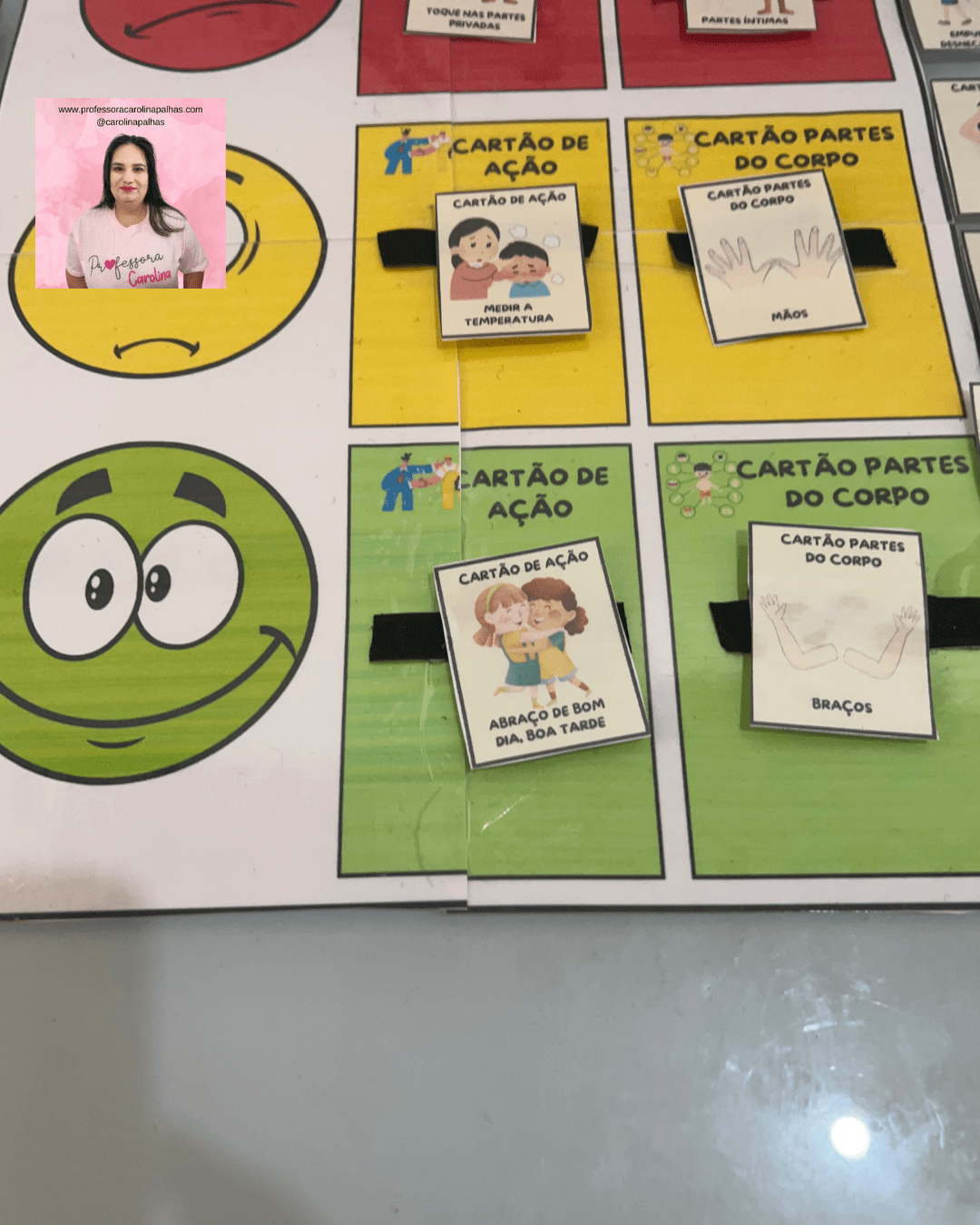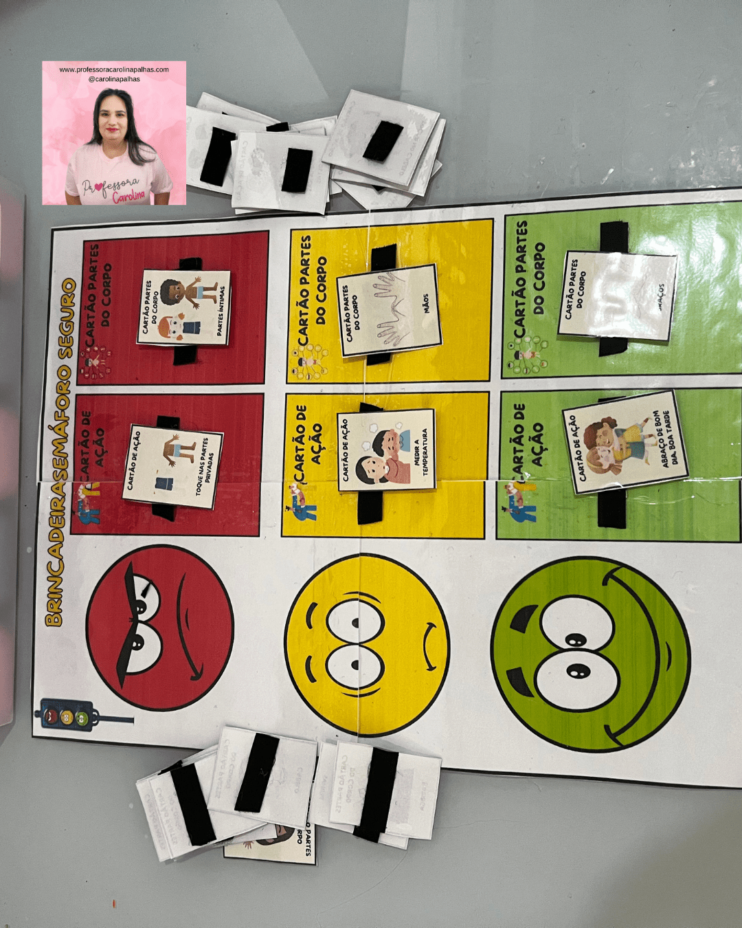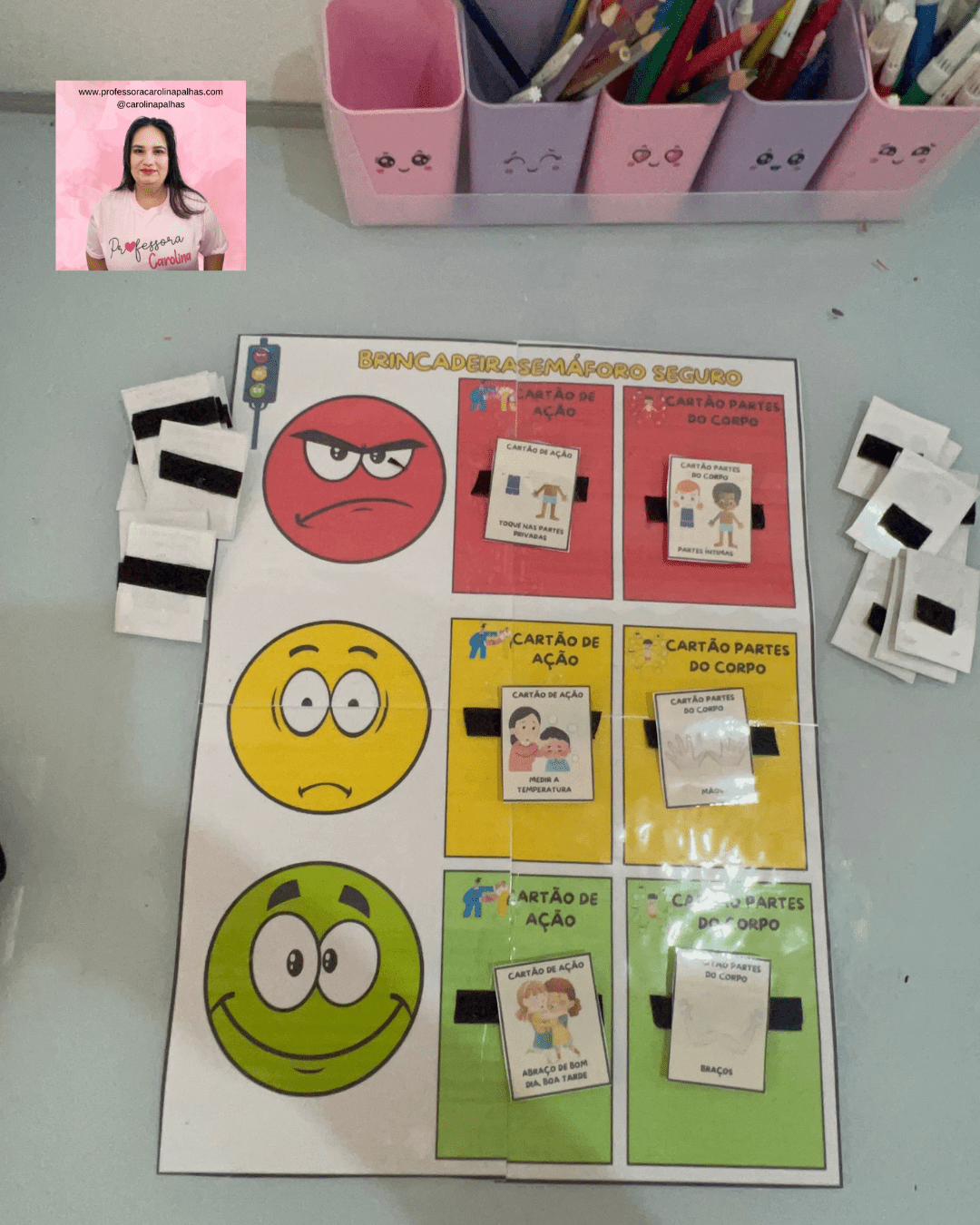 • Descrição: Apresentação de uma atividade prática onde as crianças aprendem sobre o semáforo do toque com cartões que ilustram expressões faciais e tipos de toque, reforçando o aprendizado sobre consentimento e limites pessoais.