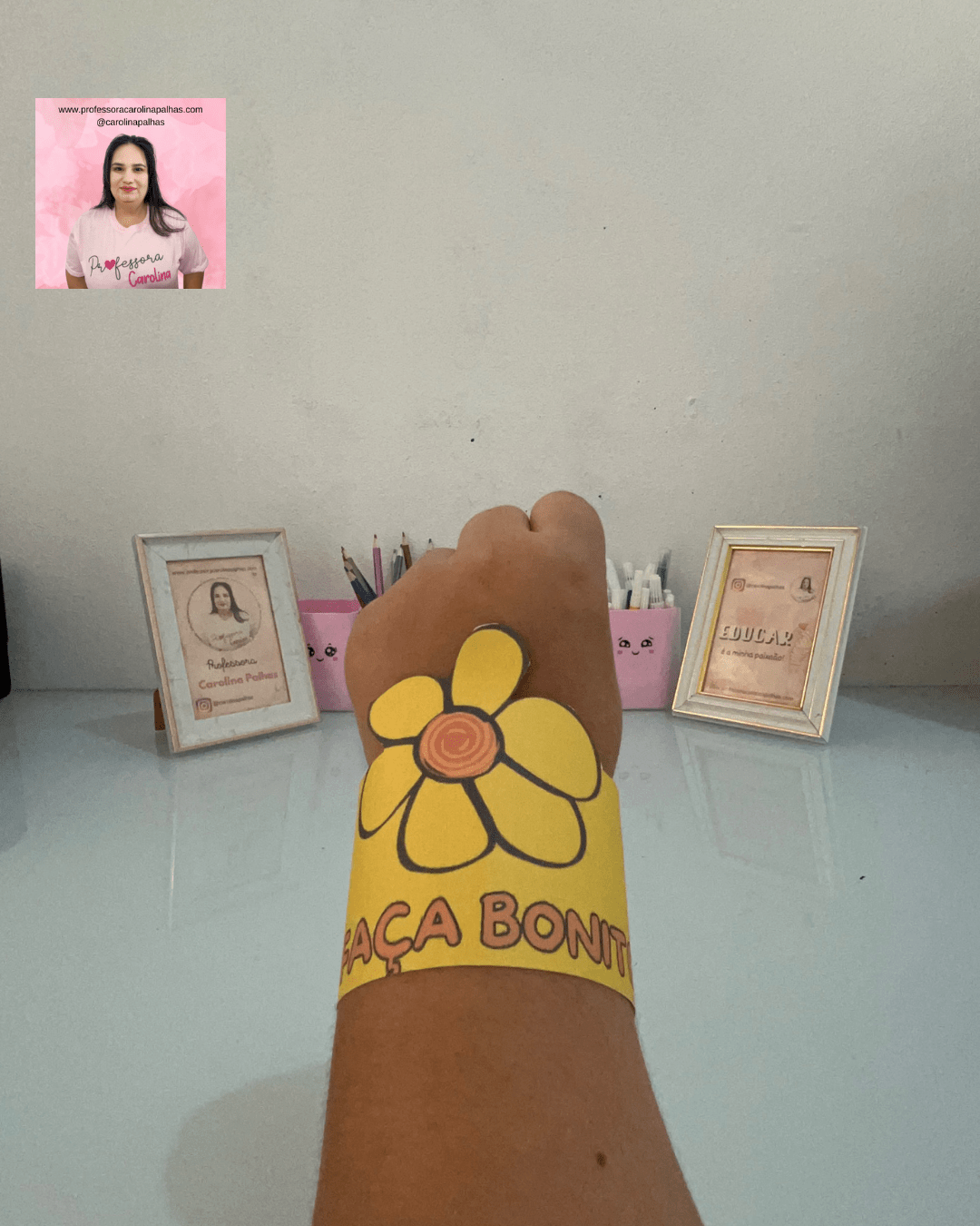 Descrição: Introdução de um bracelete colorido que serve como lembrete visual e tátil sobre o semáforo do toque, ajudando as crianças a lembrarem das lições aprendidas sobre o toque seguro e consentimento.