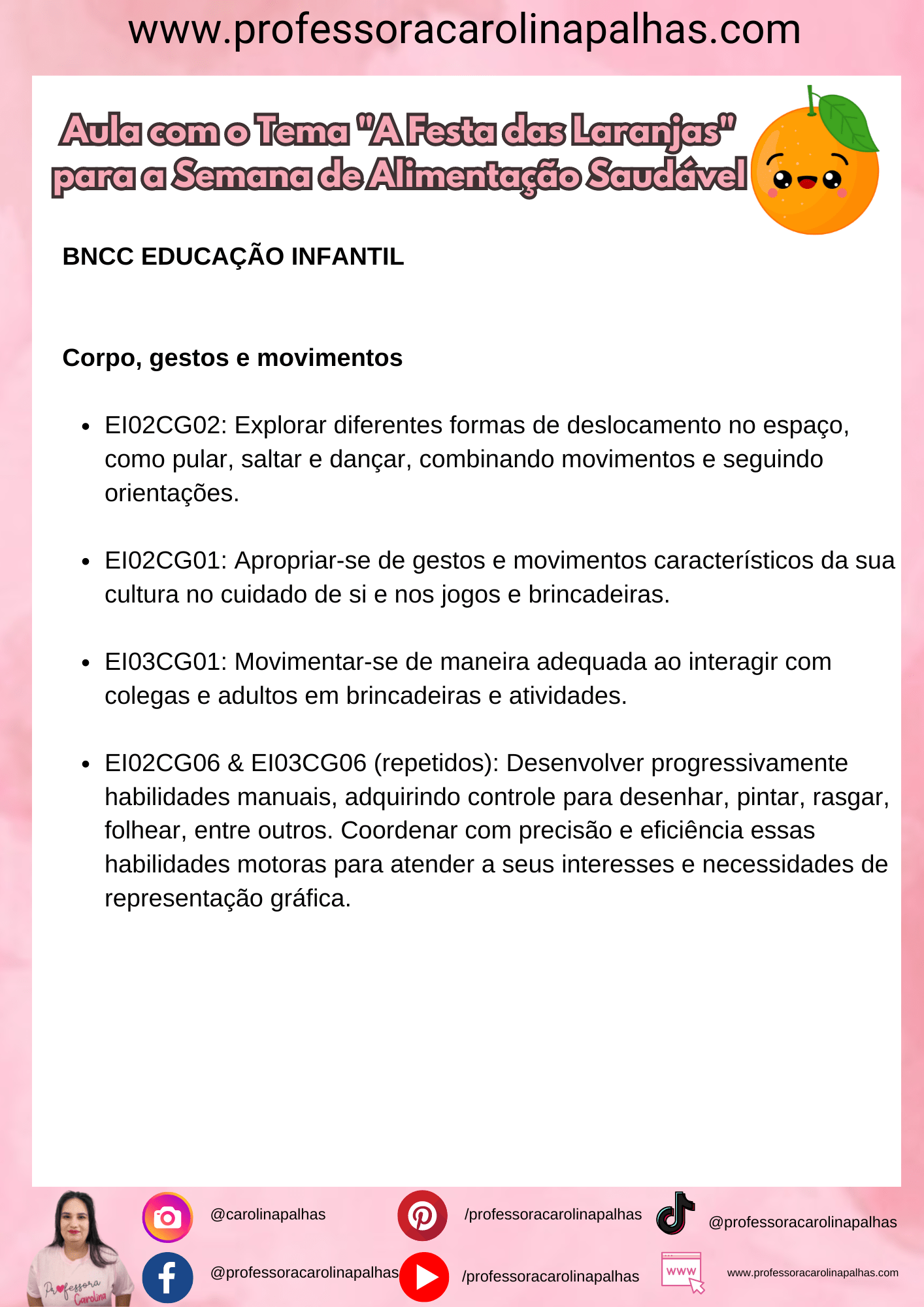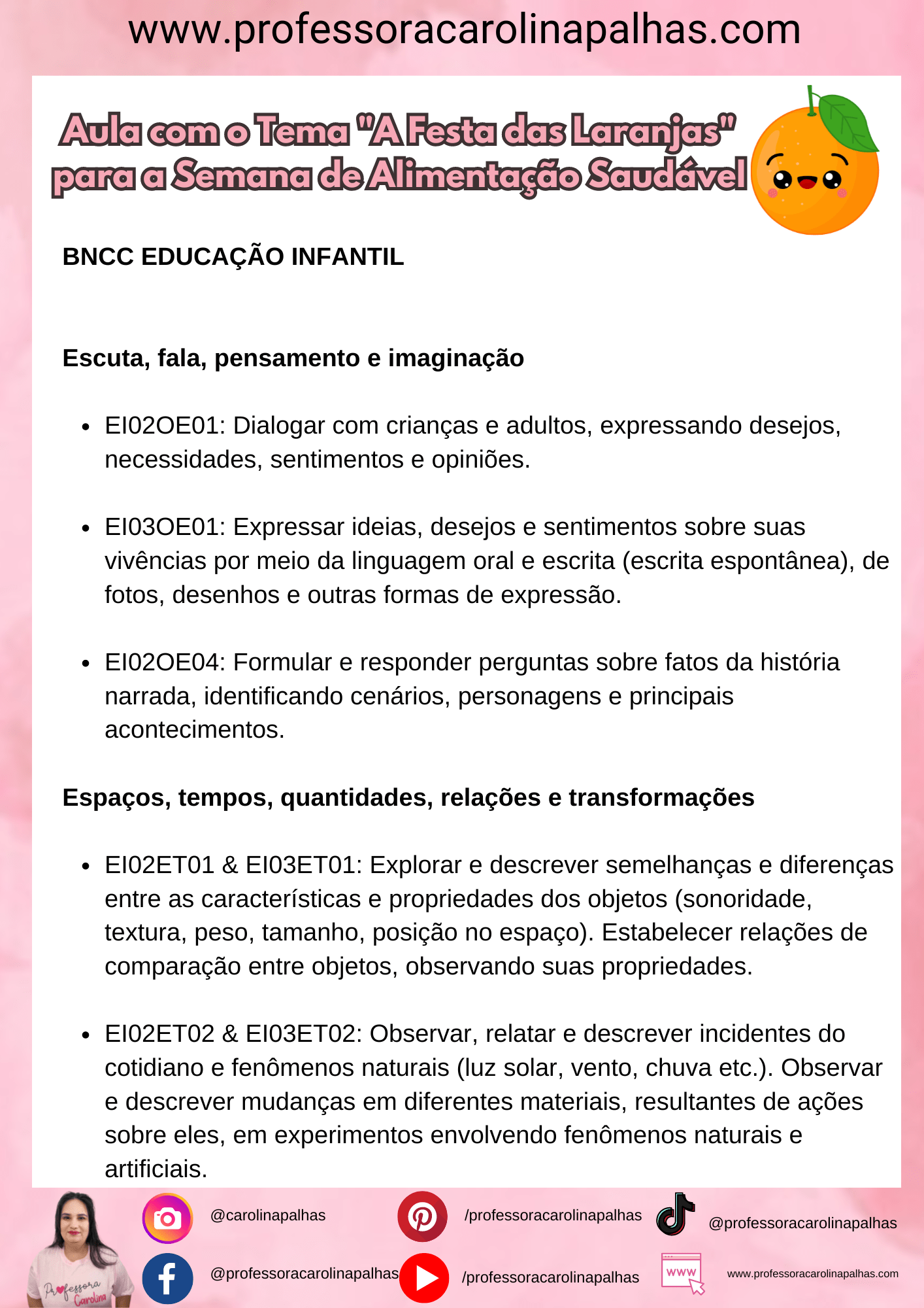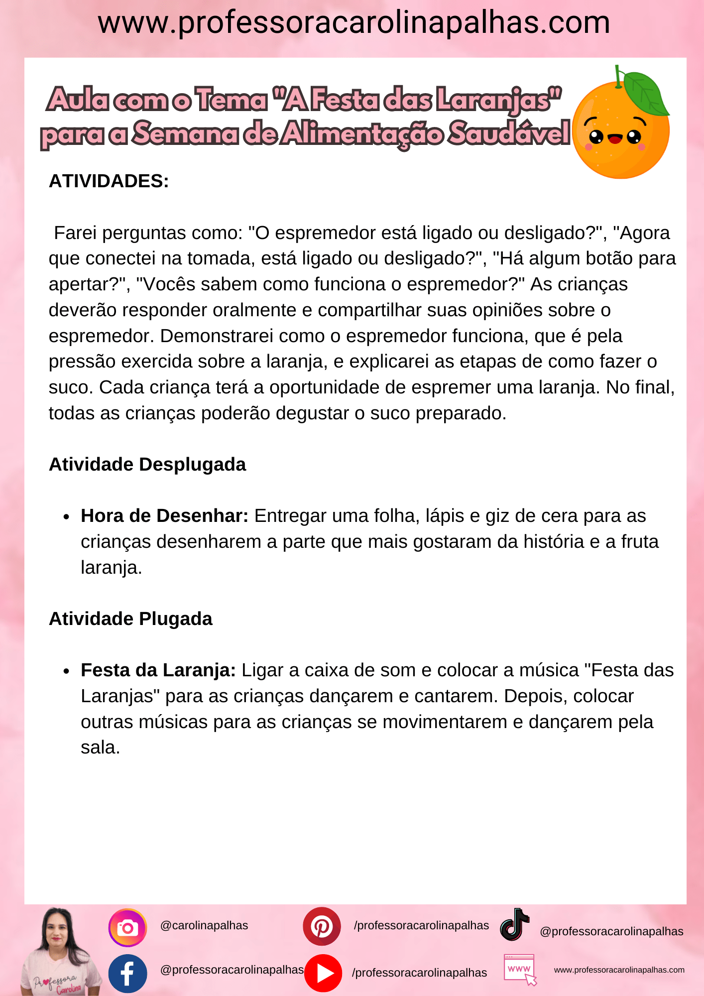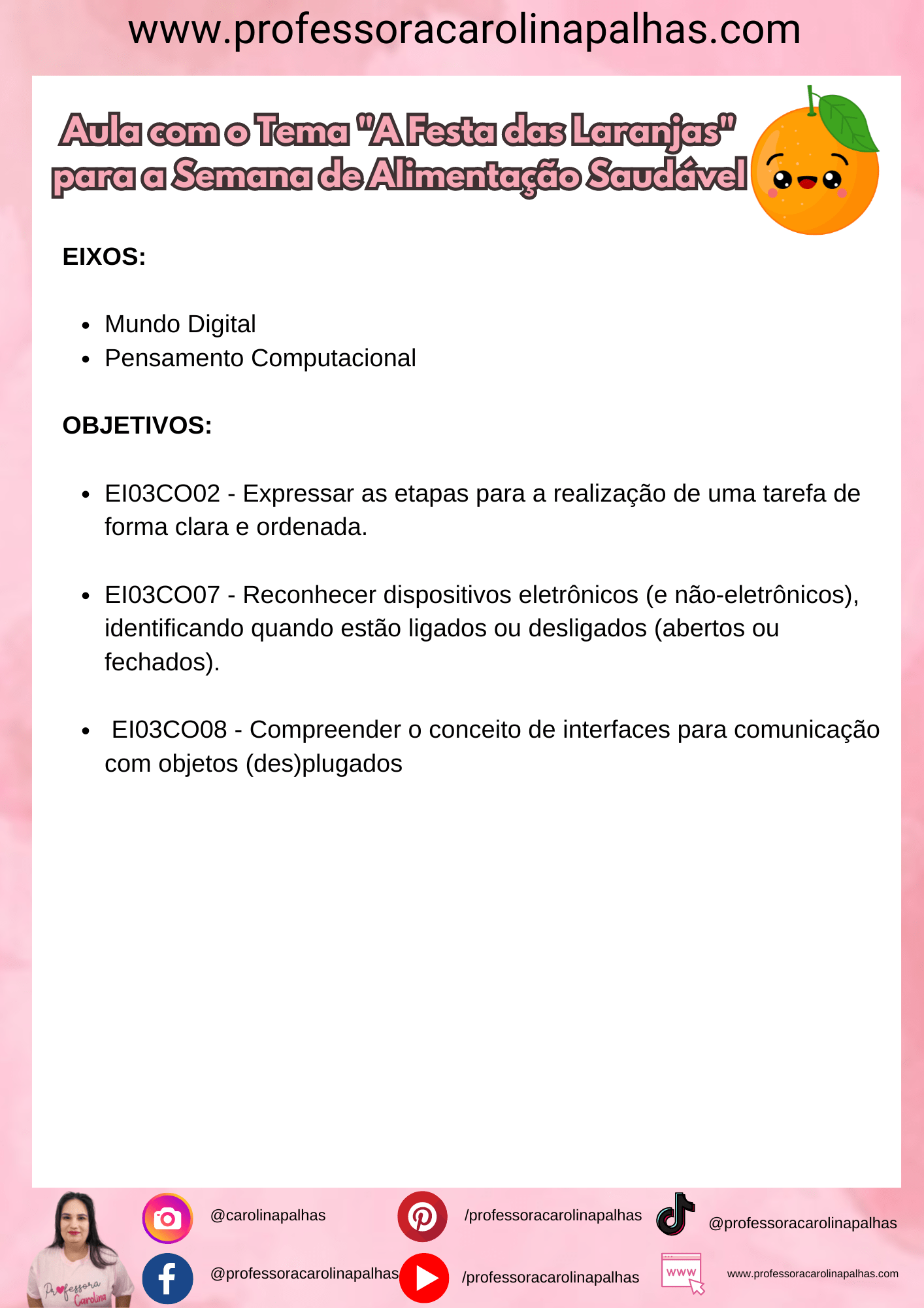 Na semana de alimentação saudável, preparei uma aula especial com o tema “A Festa das Laranjas” para as crianças do maternal. Esta atividade foi dividida em momentos desplugados e plugados, integrando diversas habilidades e conhecimentos, conforme a Base Nacional Comum Curricular (BNCC).