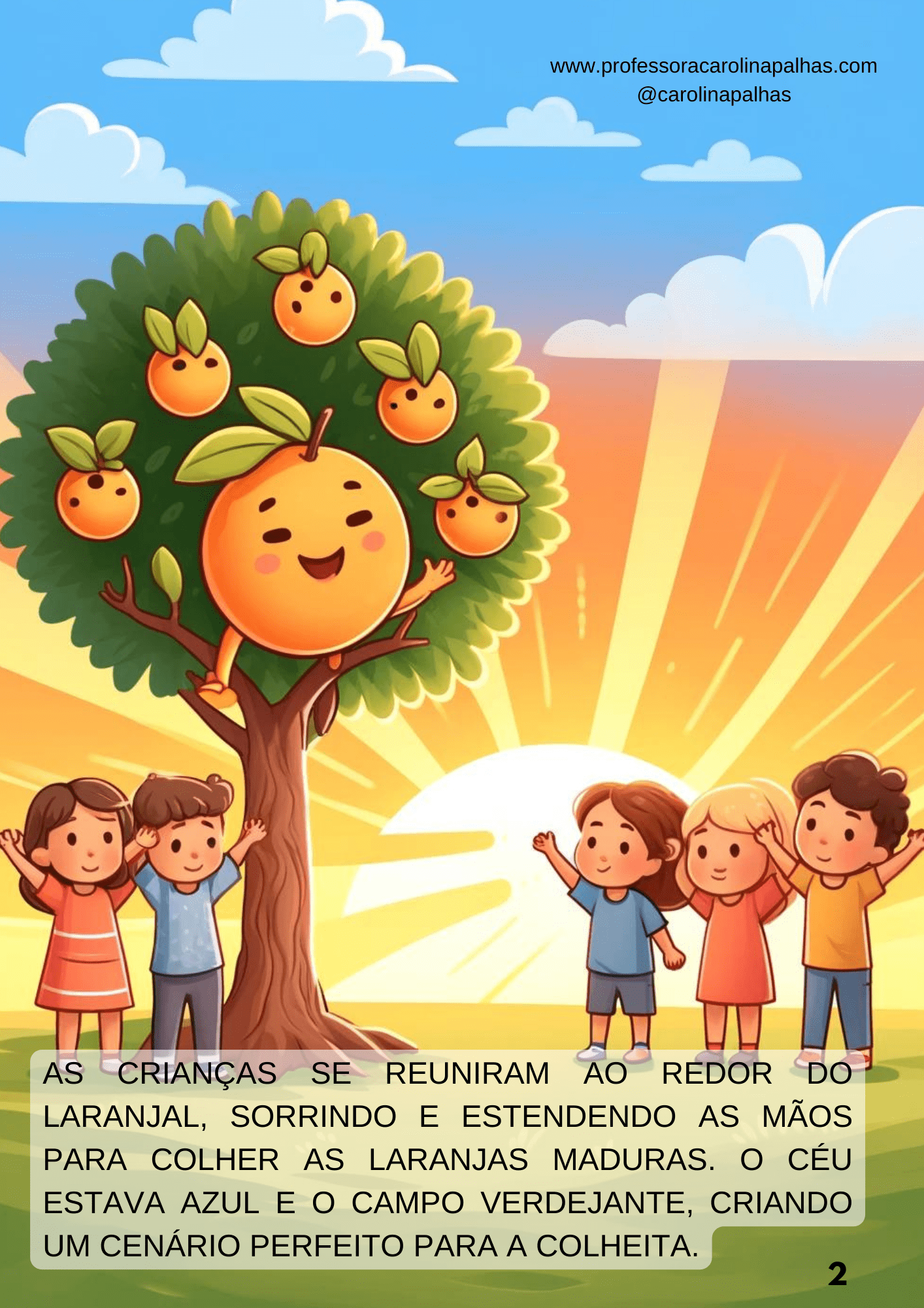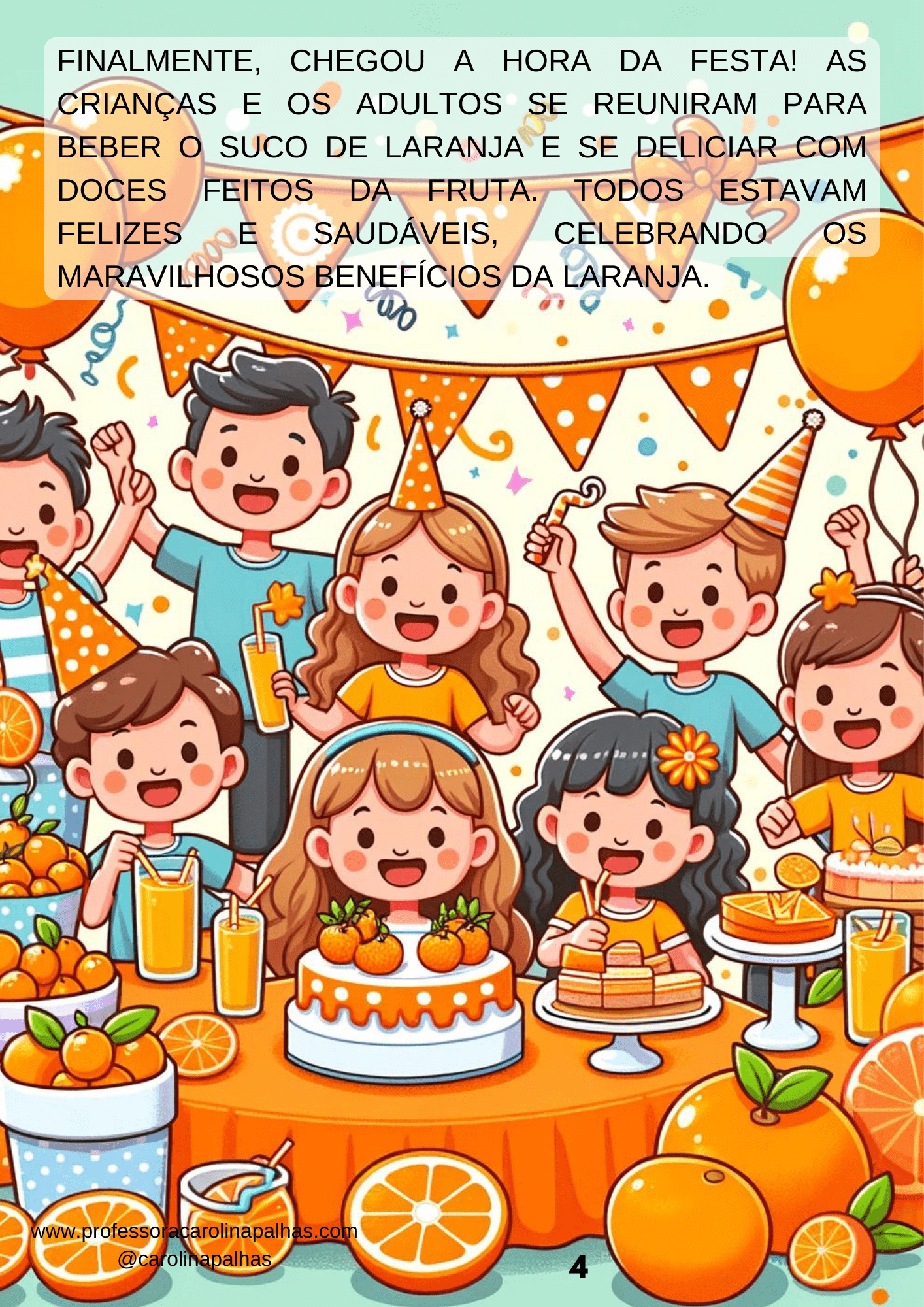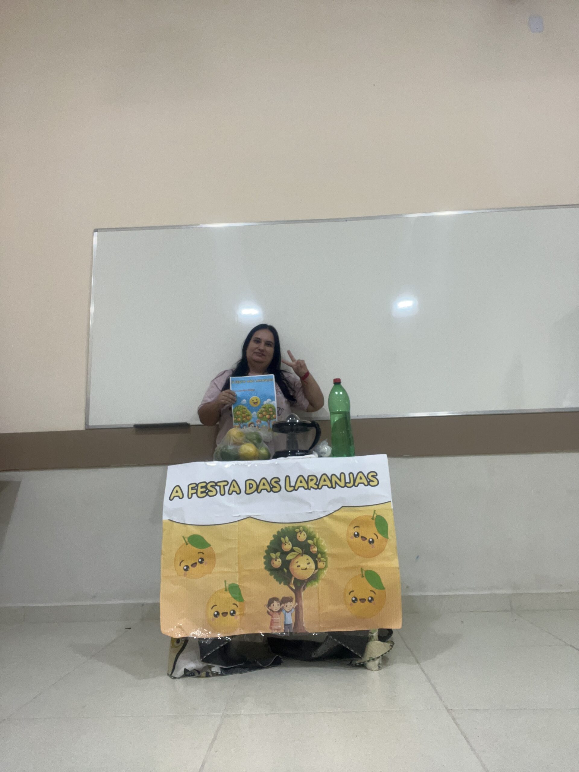 Levamos as crianças para a sala ao lado da sala de informática e contei a história “A Festa das Laranjas”, que preparei especialmente para esta aula. Após a contação, realizamos uma roda de conversa sobre a história, incentivando as crianças a expressarem suas opiniões e sentimentos.