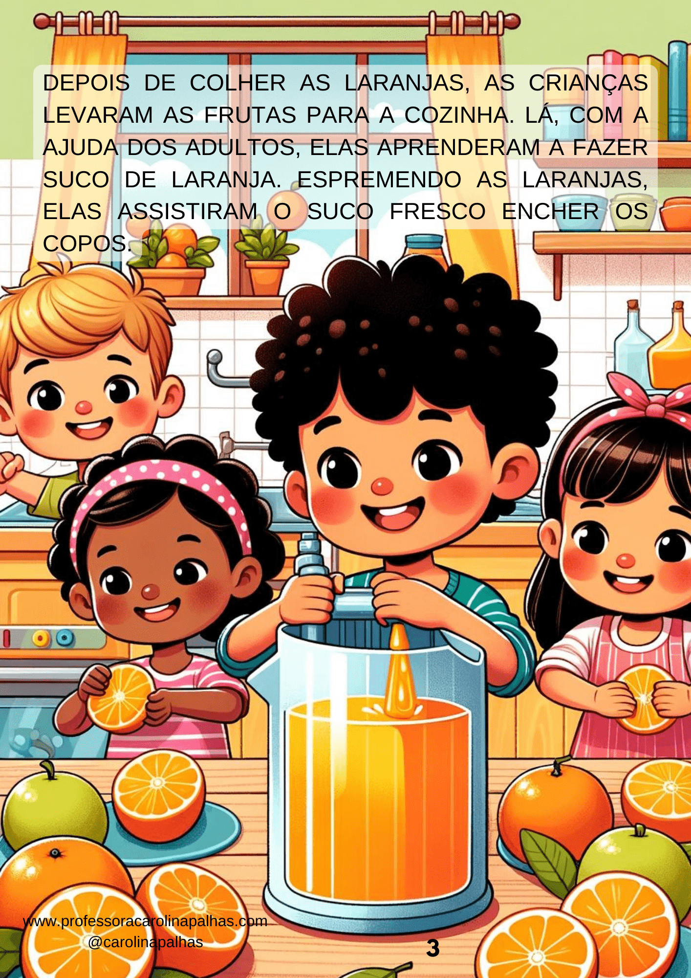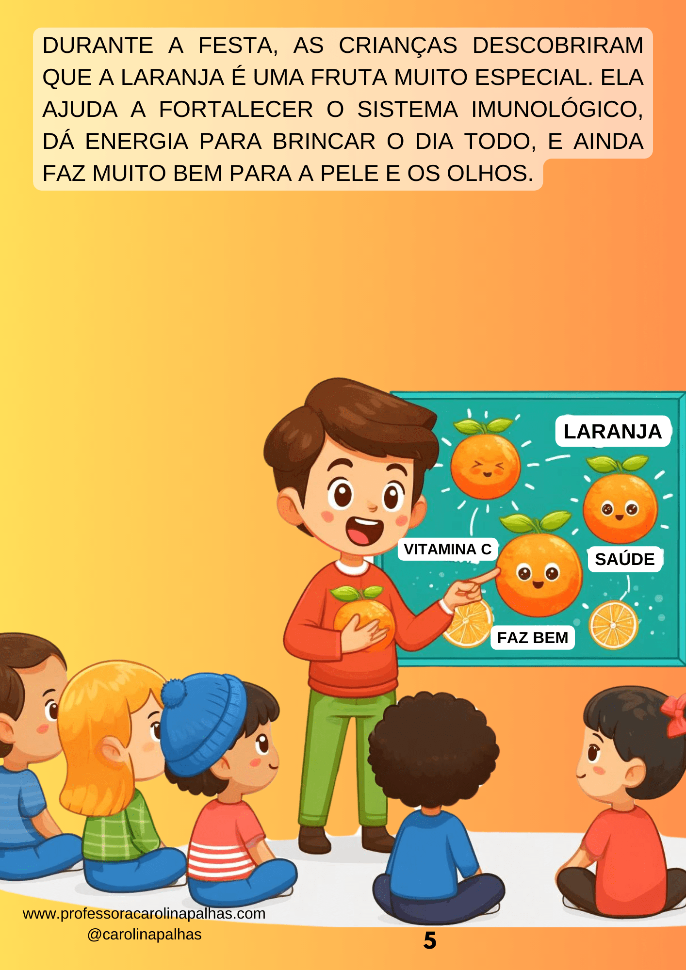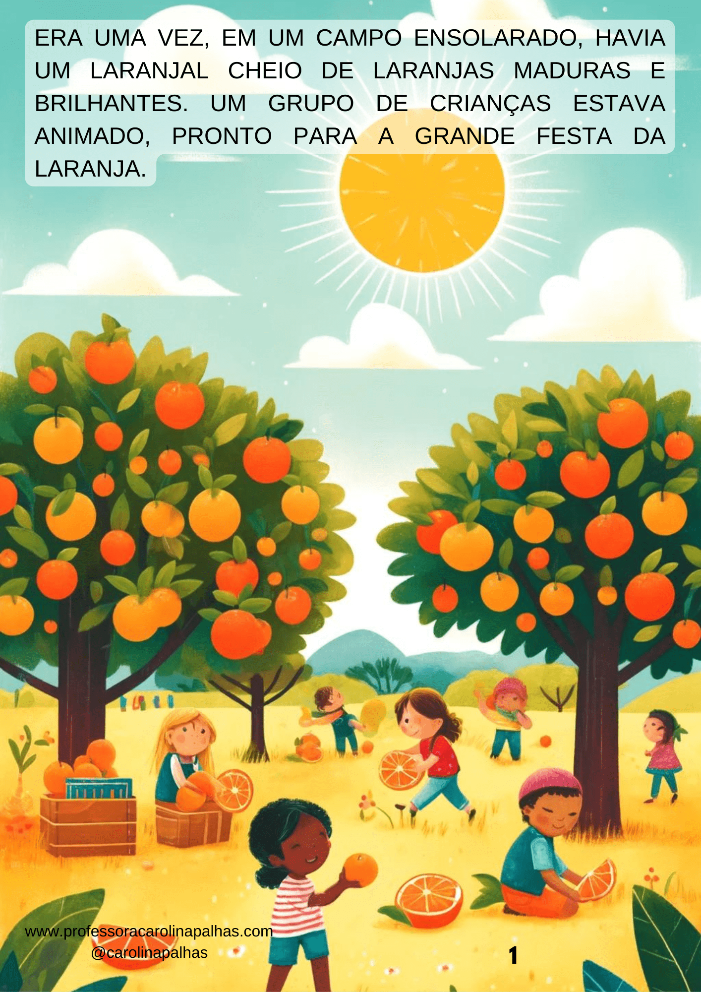 Levamos as crianças para a sala ao lado da sala de informática e contei a história “A Festa das Laranjas”, que preparei especialmente para esta aula. Após a contação, realizamos uma roda de conversa sobre a história, incentivando as crianças a expressarem suas opiniões e sentimentos.