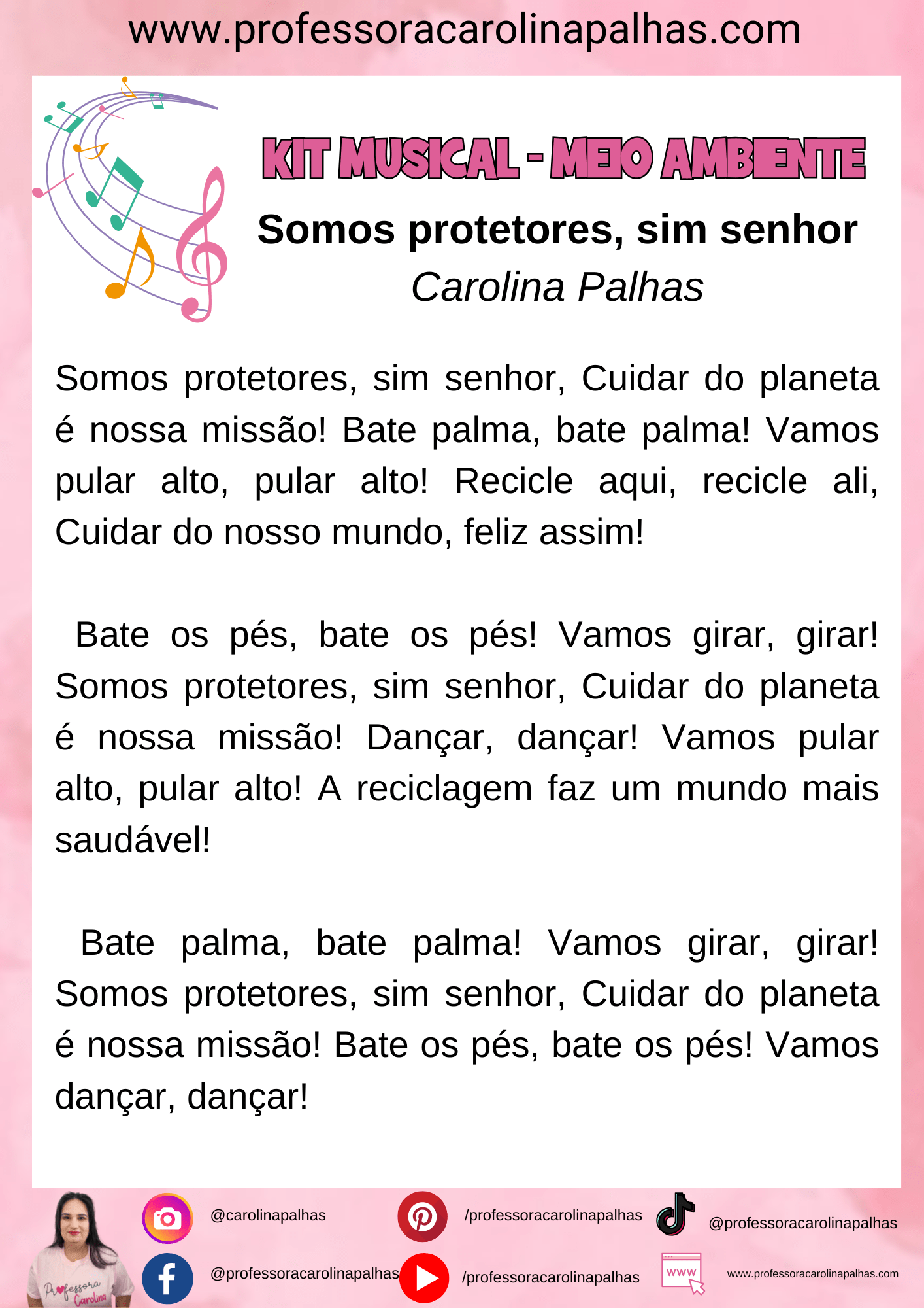 Somos protetores, sim senhor, Cuidar do planeta é nossa missão! Bate palma, bate palma! Vamos pular alto, pular alto! Recicle aqui, recicle ali, Cuidar do nosso mundo, feliz assim!