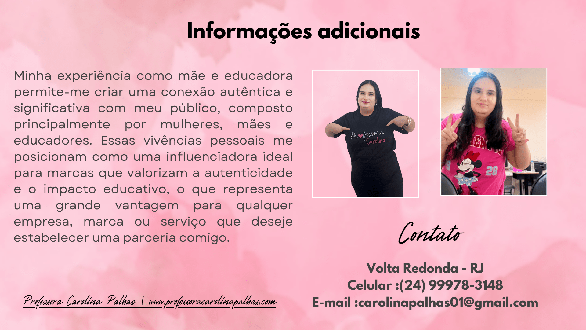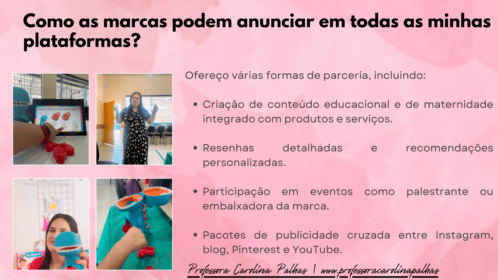 Sou a parceira ideal para marcas que valorizam a autenticidade e o impacto educativo. Minha capacidade de criar conteúdo relevante e engajador, aliada à minha expertise na integração de tecnologia na educação infantil, representa uma vantagem estratégica significativa para empresas, marcas ou serviços interessados em parcerias.