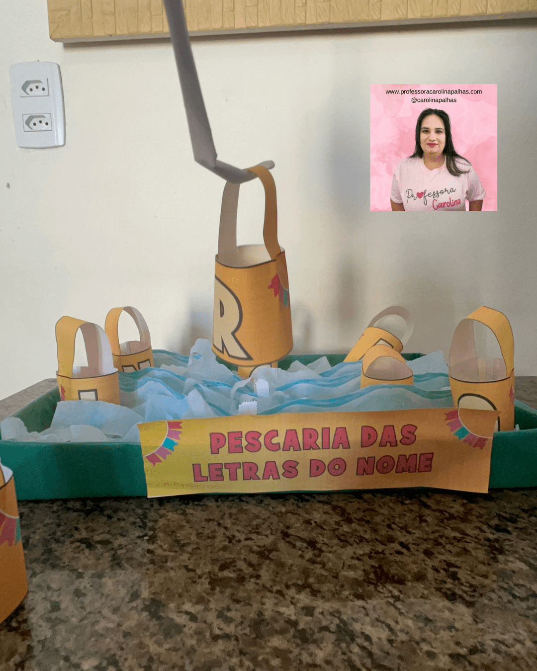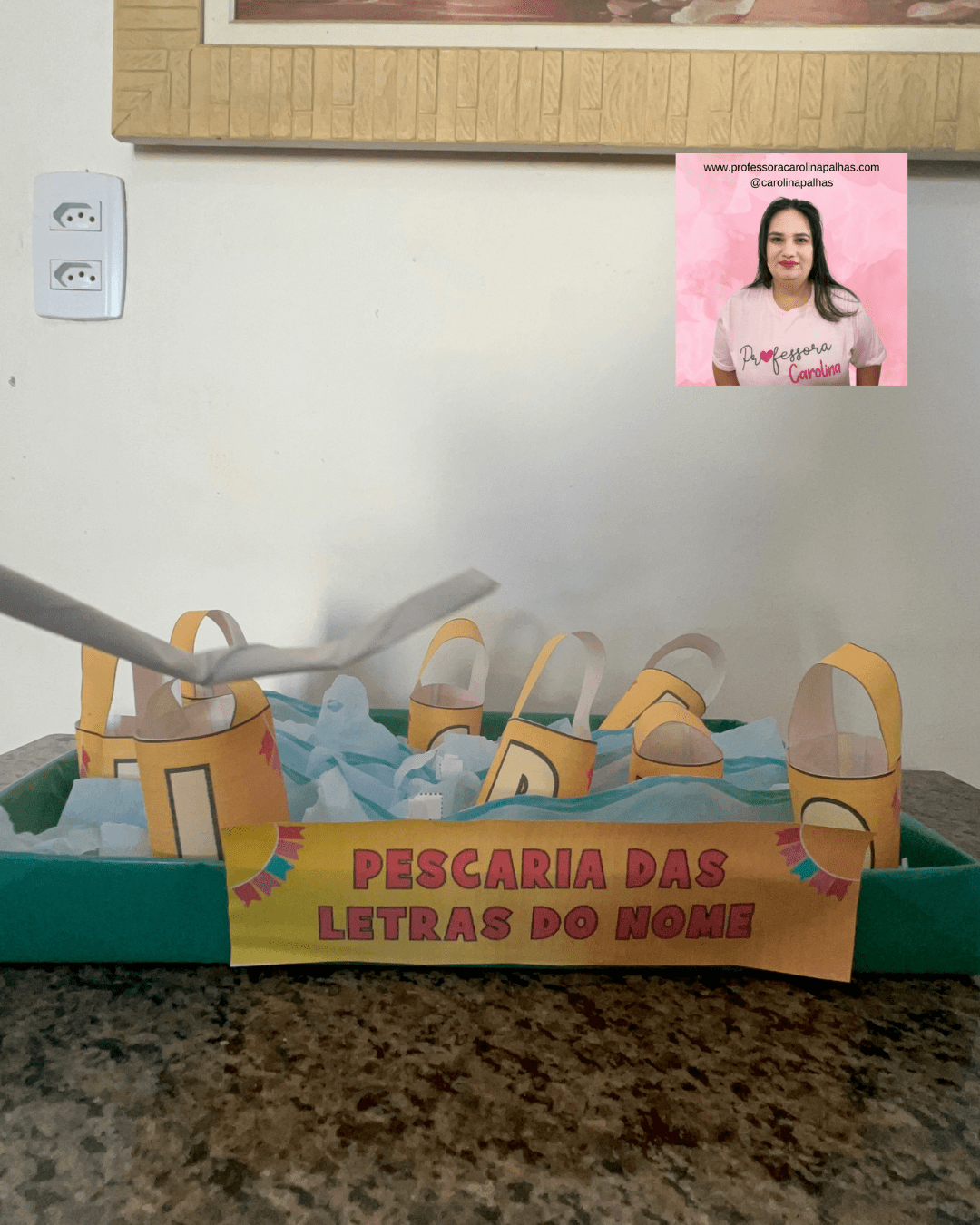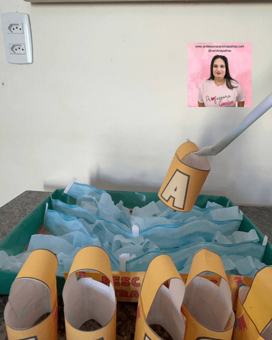 Nesta atividade festiva, cada criança tem a chance de “pescar” as letras que formam seu nome. Utilizamos cilindros de papelão com letras impressas, posicionados dentro de uma bacia que simula um lago. As crianças usam uma vara de pescar com um clipe na ponta para capturar suas letras, promovendo a coordenação motora e o reconhecimento visual.