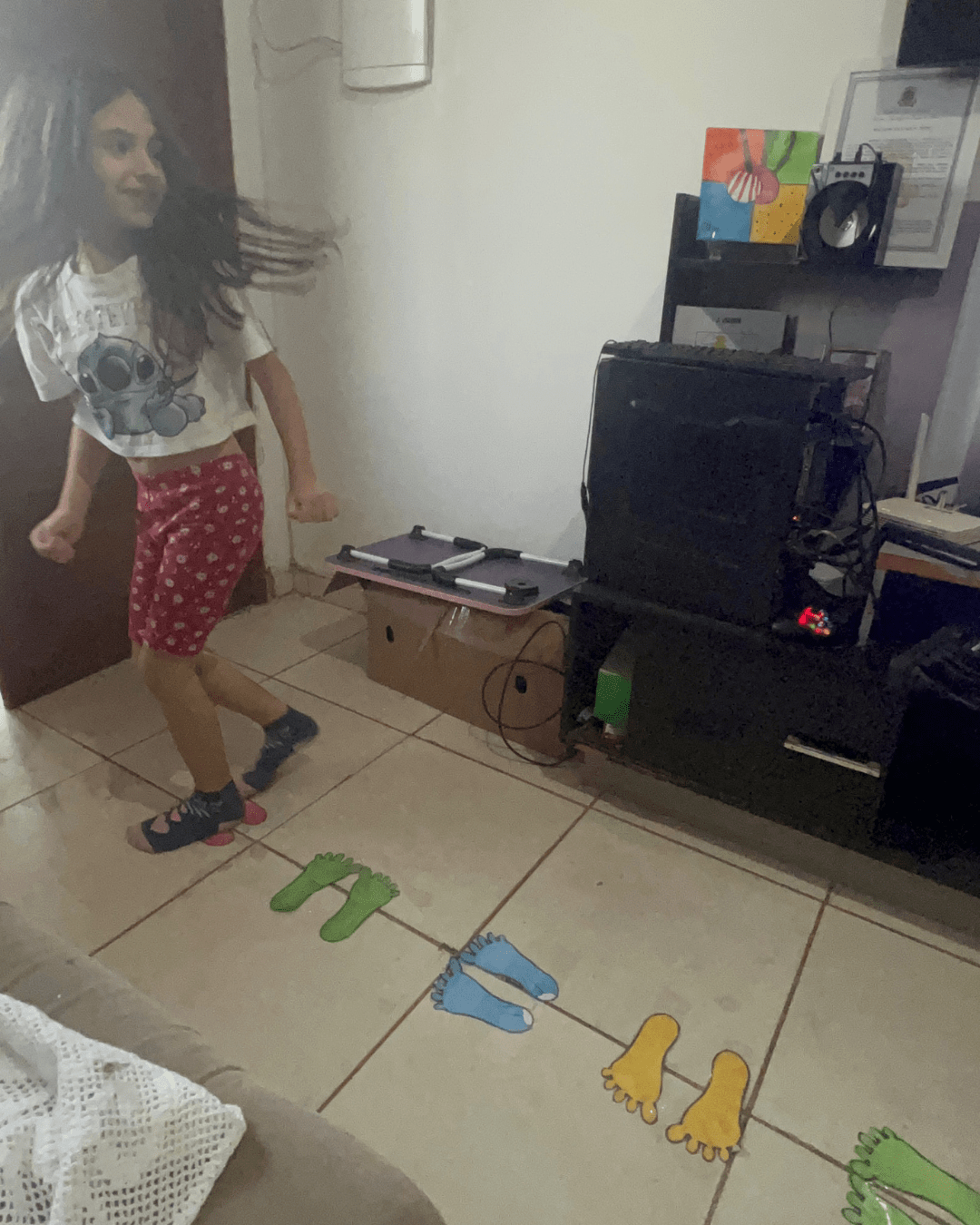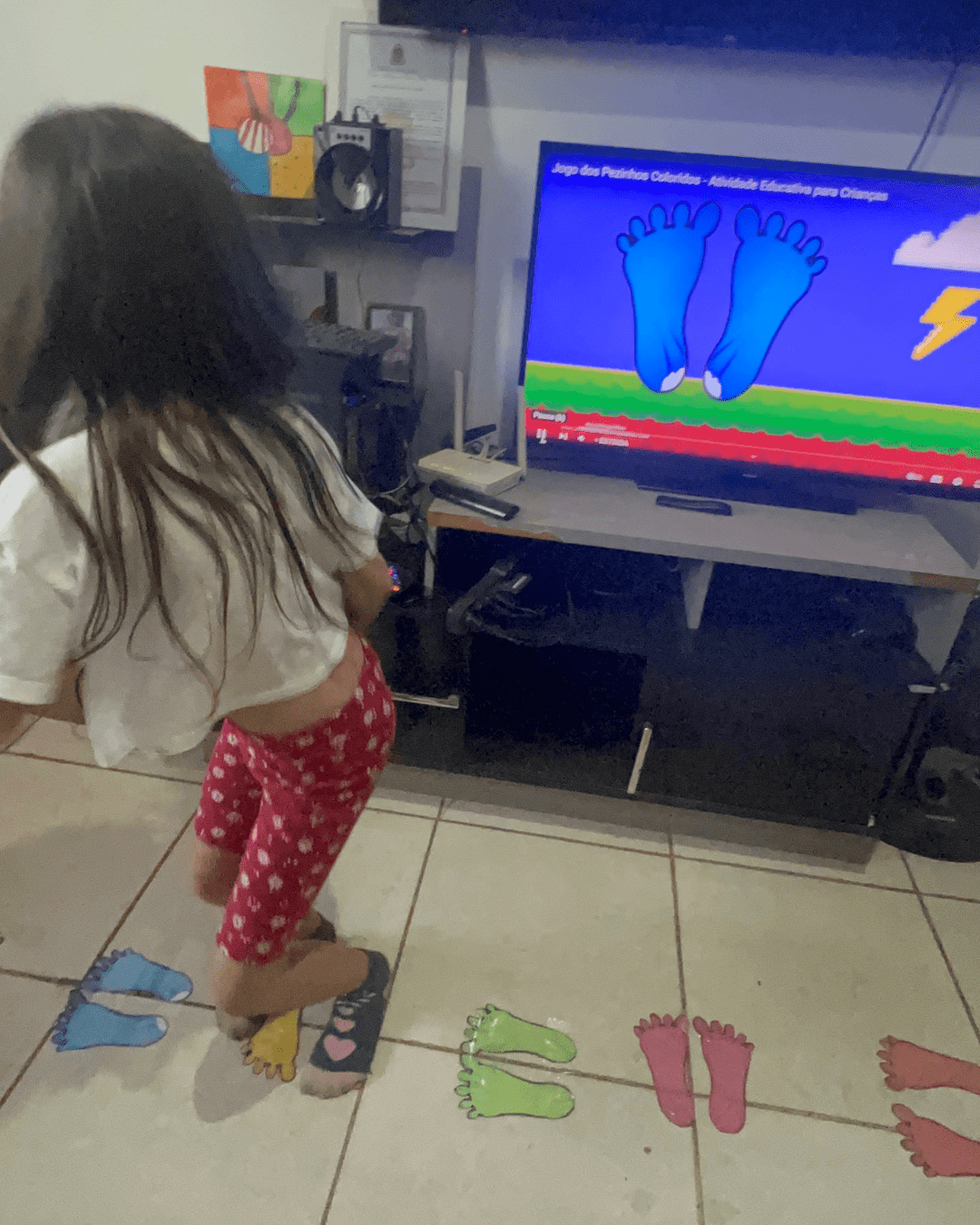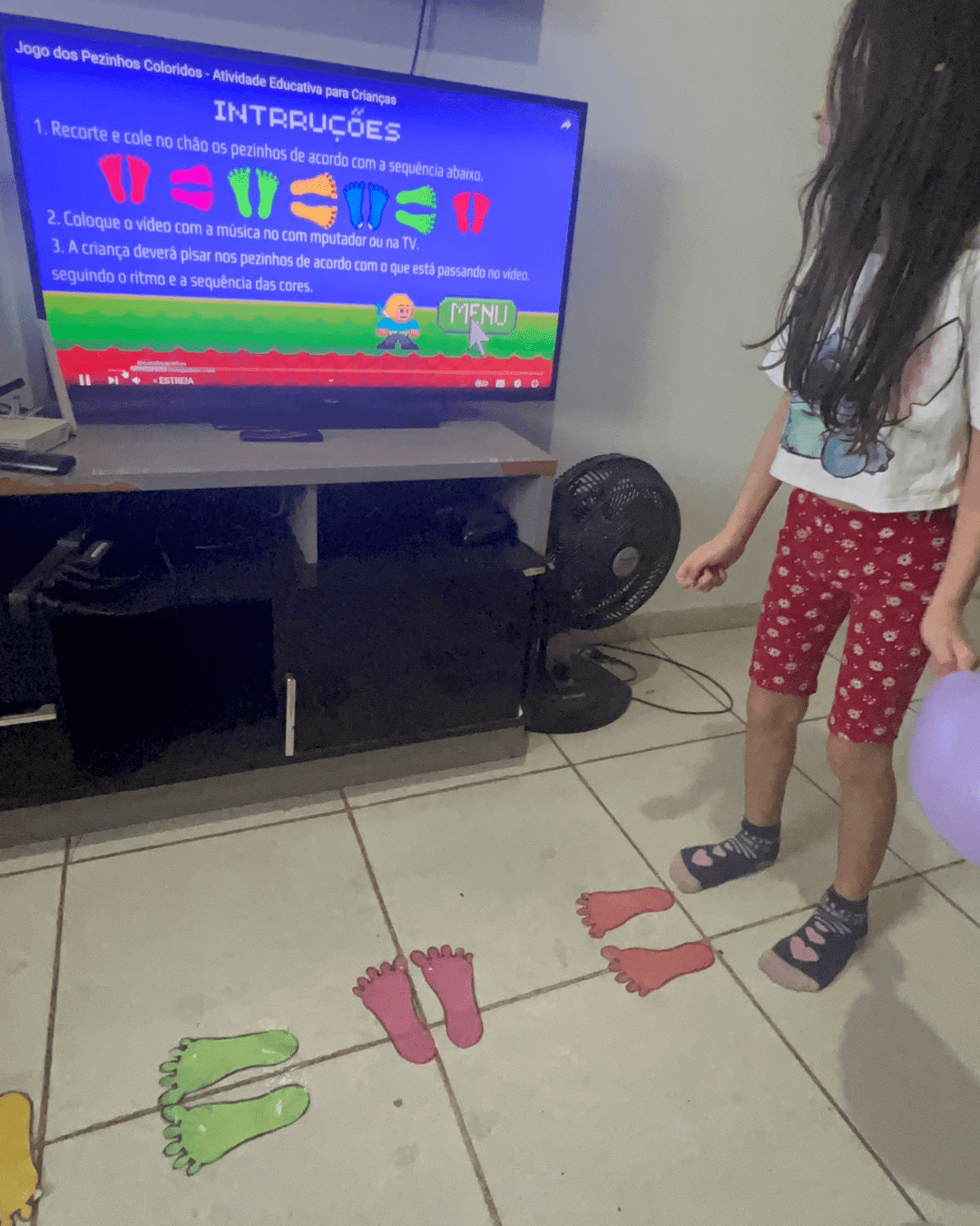 - A criança deverá pisar nos pezinhos seguindo a sequência do vídeo, acompanhando o ritmo e as instruções musicais.