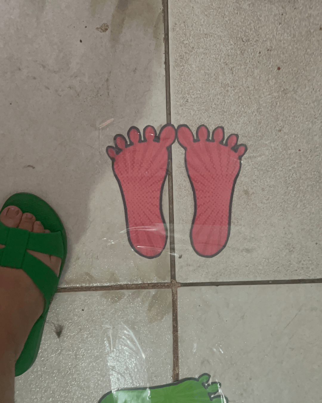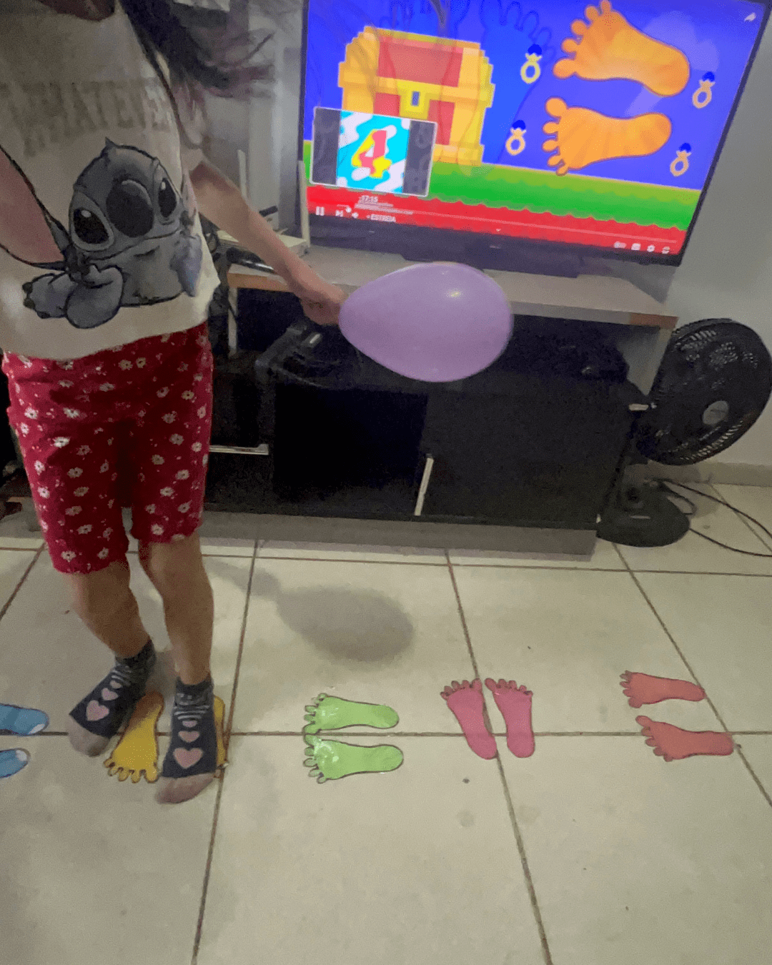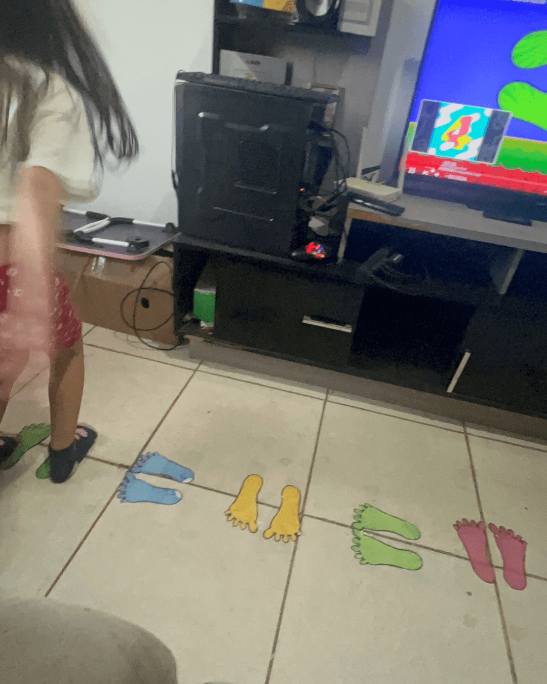 - A criança deverá pisar nos pezinhos seguindo a sequência do vídeo, acompanhando o ritmo e as instruções musicais.