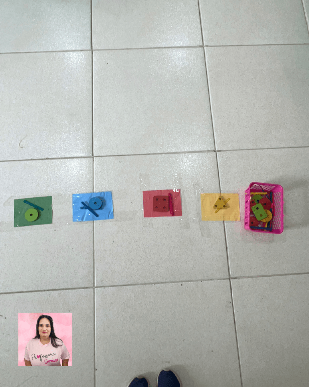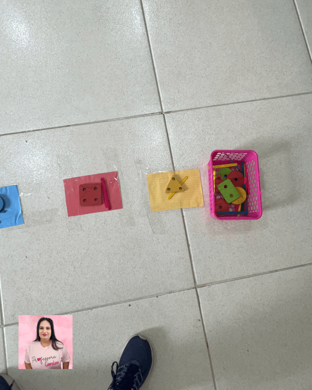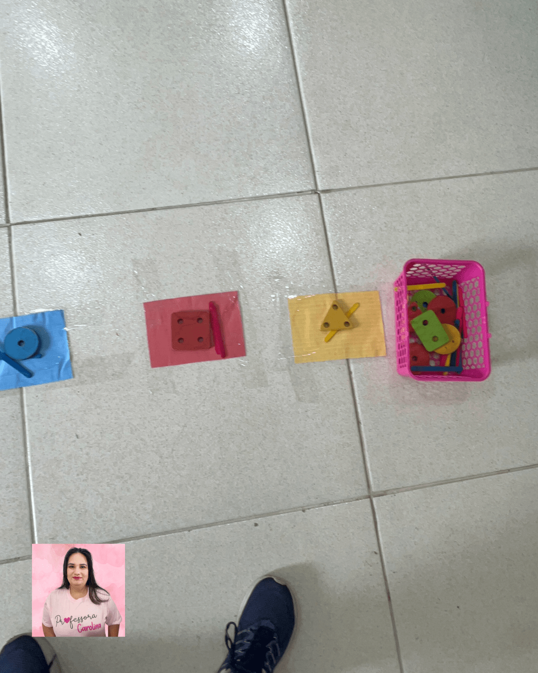 A seguir, utilizamos um rolo das cores digital criado no site Wordwall para uma atividade interativa. Colei no chão quadros coloridos nas cores vermelho, verde, amarelo e azul e coloquei ao lado um cesto com objetos variados. As crianças giraram o rolo digital e, conforme a cor sorteada, escolhiam um objeto correspondente no cesto para colocar no quadrado da mesma cor no chão. Esta atividade ajuda a desenvolver habilidades de classificação e reconhecimento de cores de forma divertida e dinâmica.