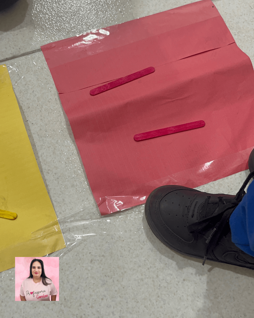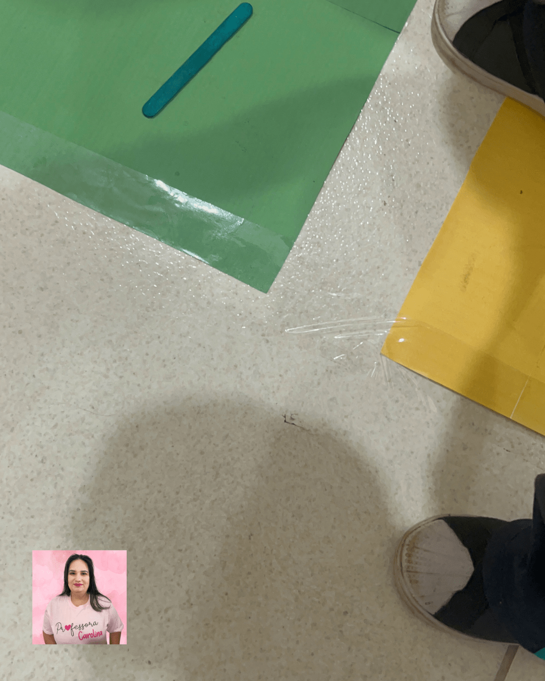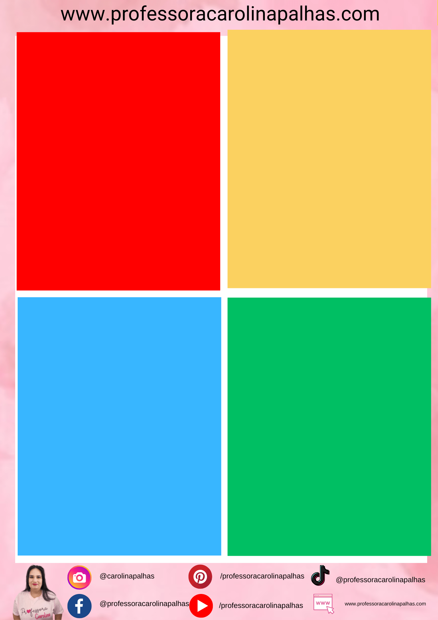A seguir, utilizamos um rolo das cores digital criado no site Wordwall para uma atividade interativa. Colei no chão quadros coloridos nas cores vermelho, verde, amarelo e azul e coloquei ao lado um cesto com objetos variados. As crianças giraram o rolo digital e, conforme a cor sorteada, escolhiam um objeto correspondente no cesto para colocar no quadrado da mesma cor no chão. Esta atividade ajuda a desenvolver habilidades de classificação e reconhecimento de cores de forma divertida e dinâmica.