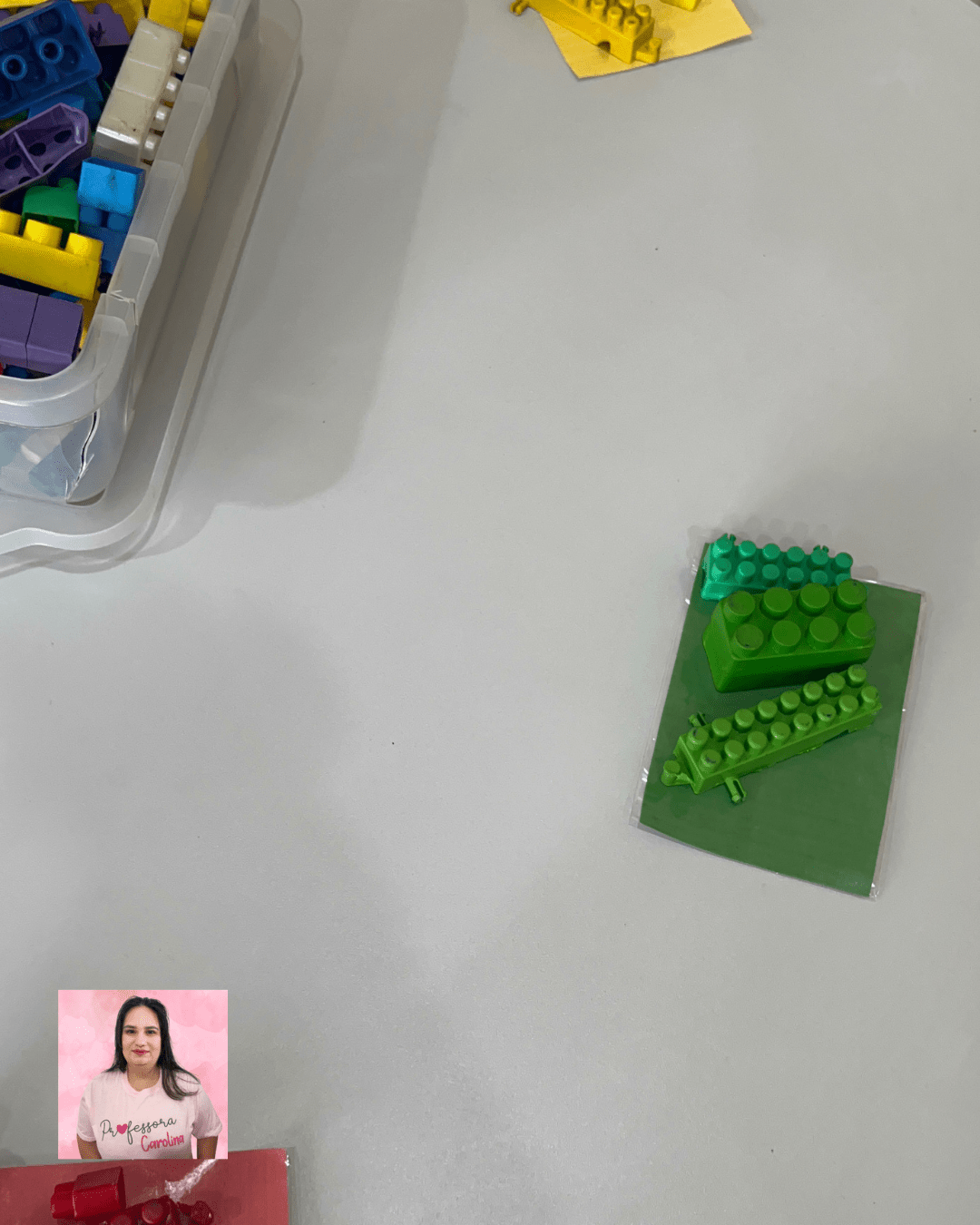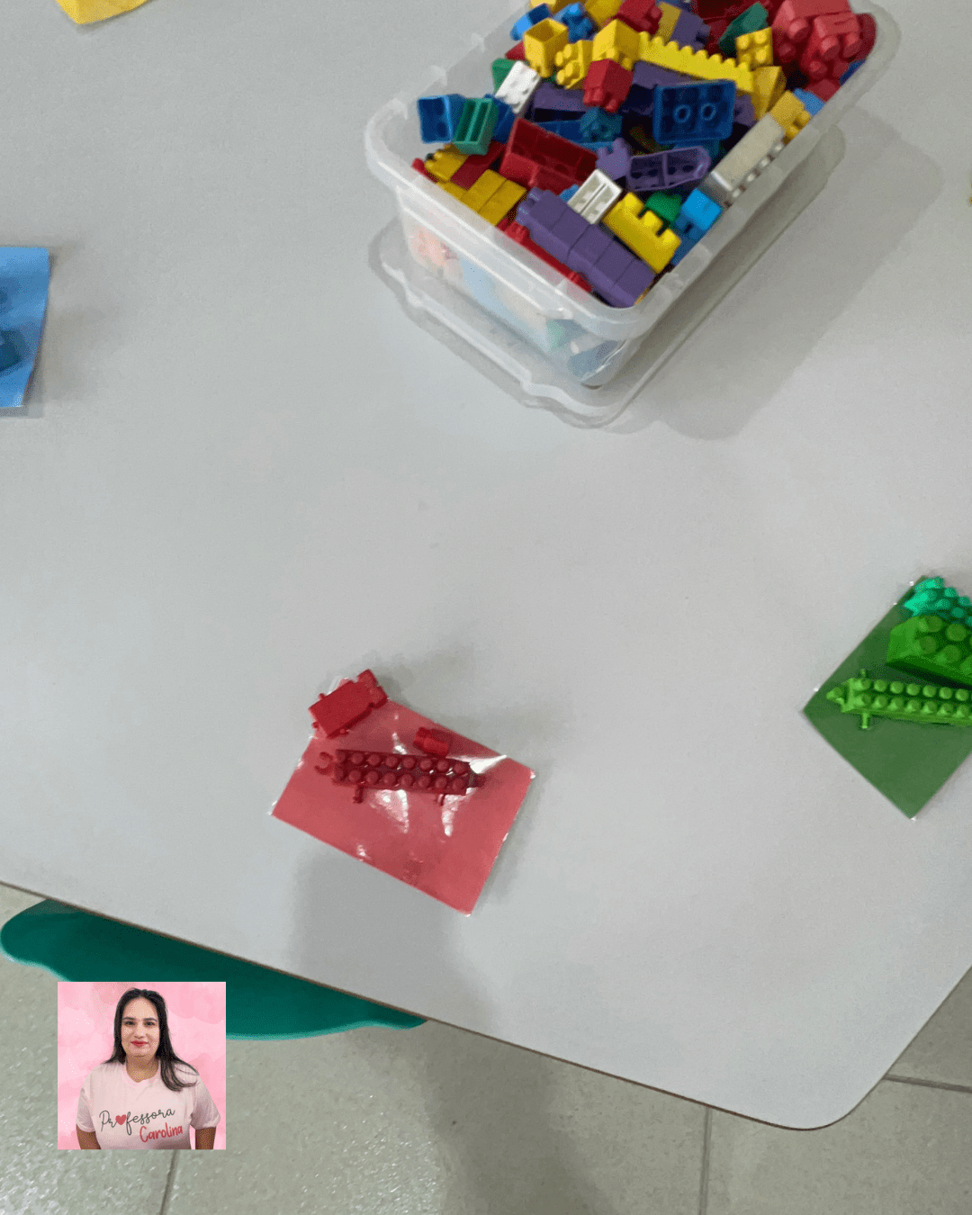 • Mesa 2 – Blocos de Montar: Disponibilizamos blocos de montar e cartões coloridos. As crianças deveriam classificar os blocos por cor e, após a classificação, tiveram a liberdade de construir o que desejassem com os blocos. Esta mesa não só reforça o aprendizado das cores, mas também incentiva habilidades motoras e a criatividade.