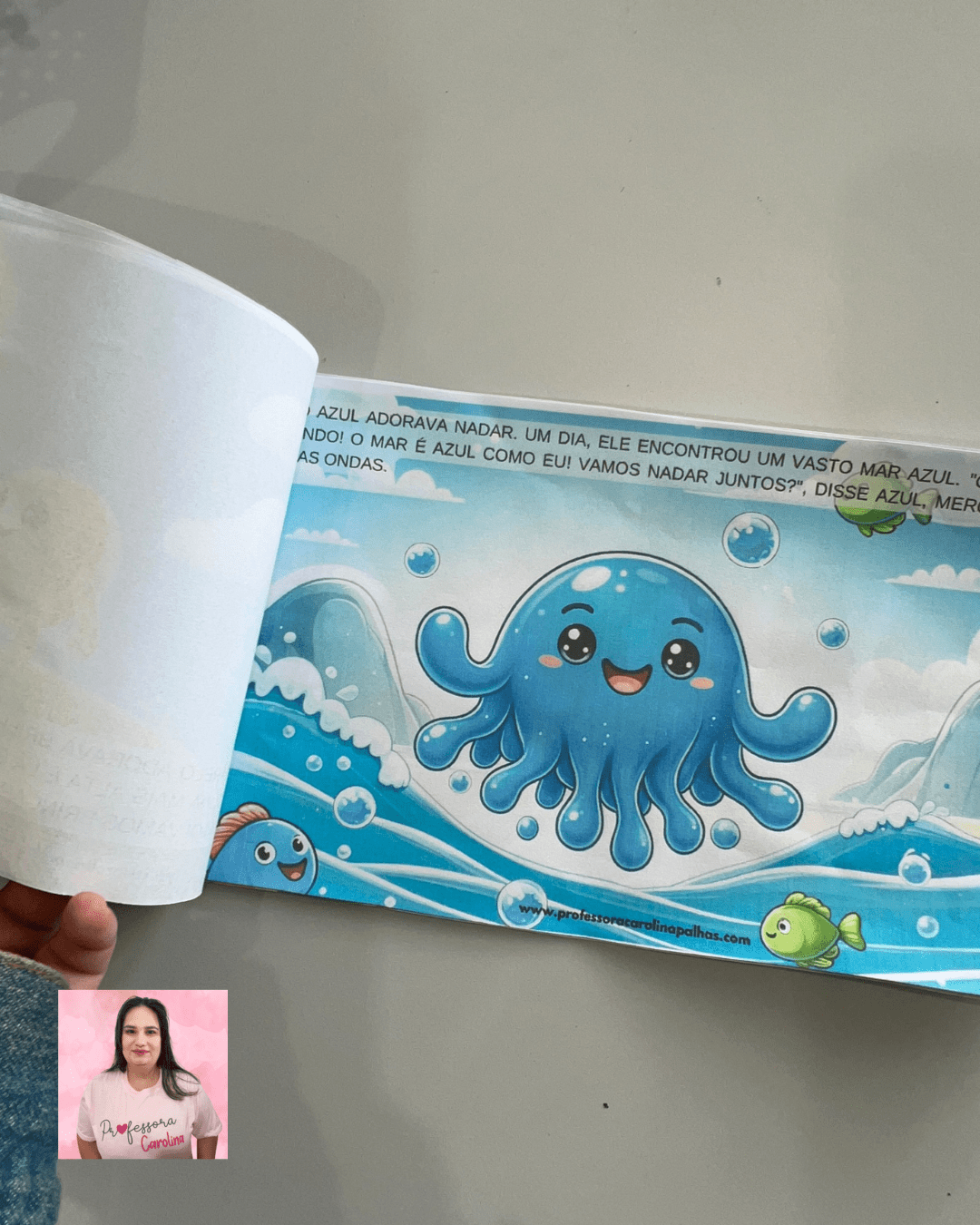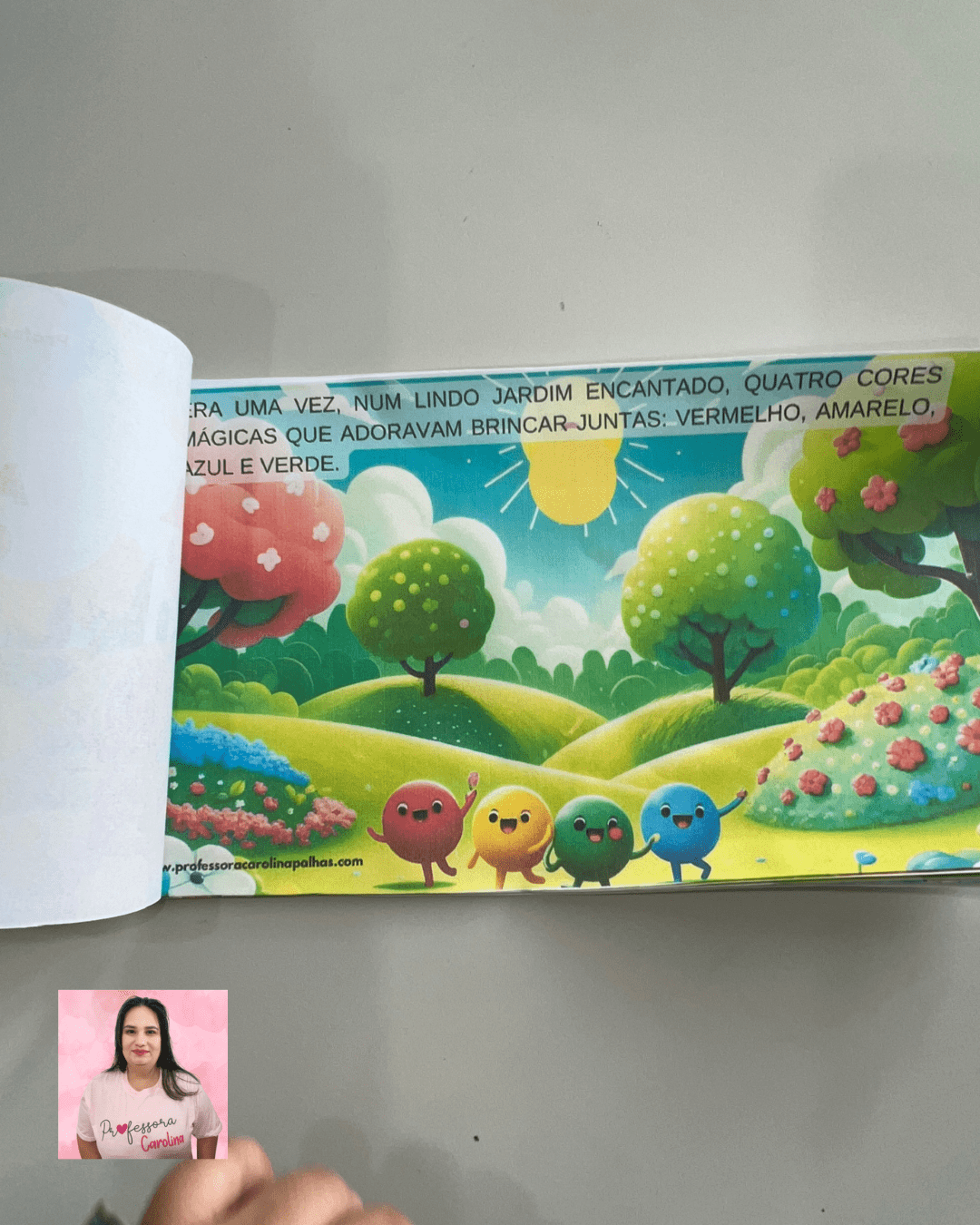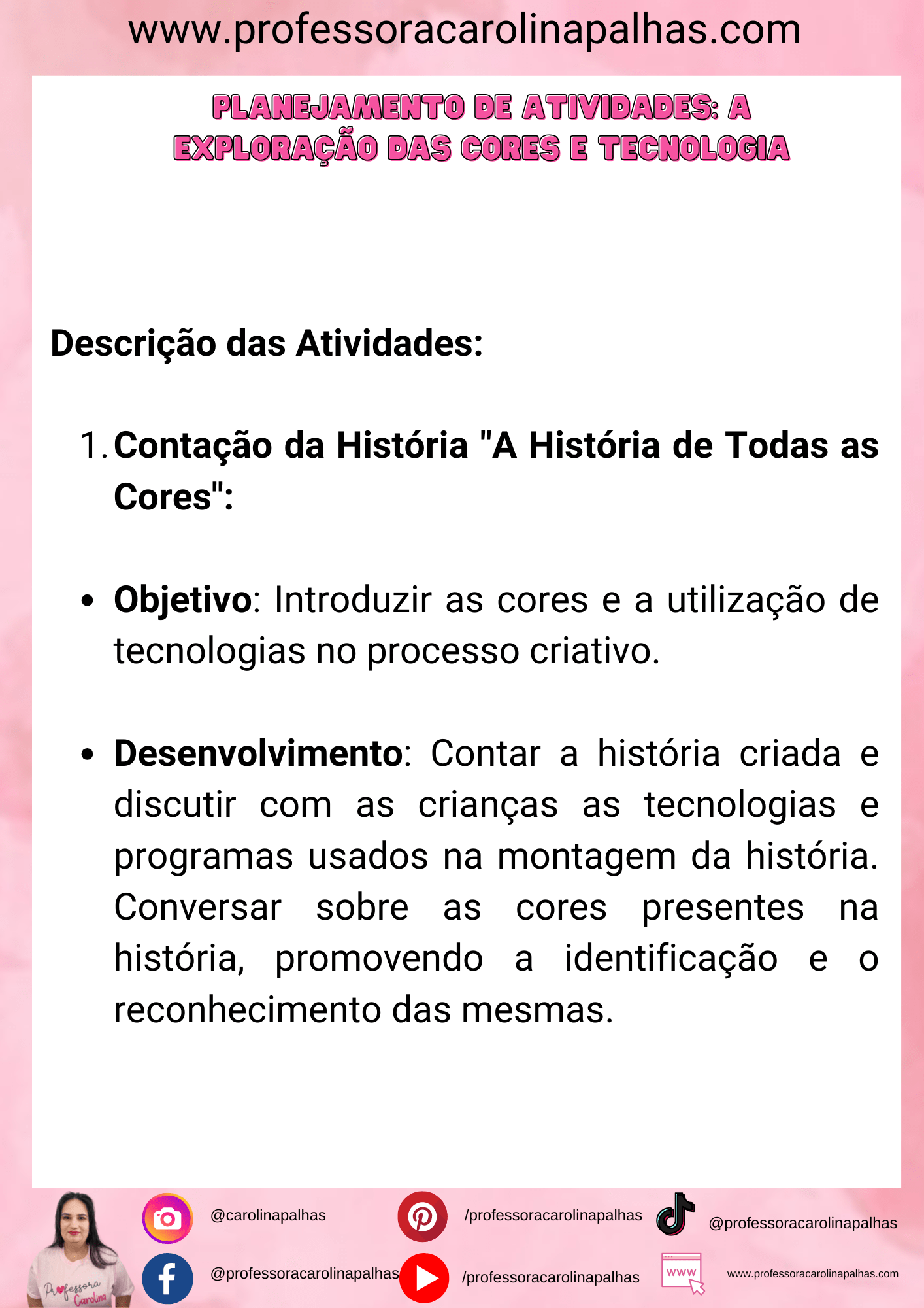 Iniciamos nossa jornada com a contação da história “A História de Todas as Cores”, que eu mesma criei e ilustrei usando diversas ferramentas tecnológicas. Esta atividade serve não apenas para introduzir as cores, mas também para mostrar como a tecnologia pode ser uma aliada no processo de aprendizado. Discutimos com as crianças as tecnologias e programas utilizados para montar a história, e exploramos as cores que aparecem ao longo do conto.