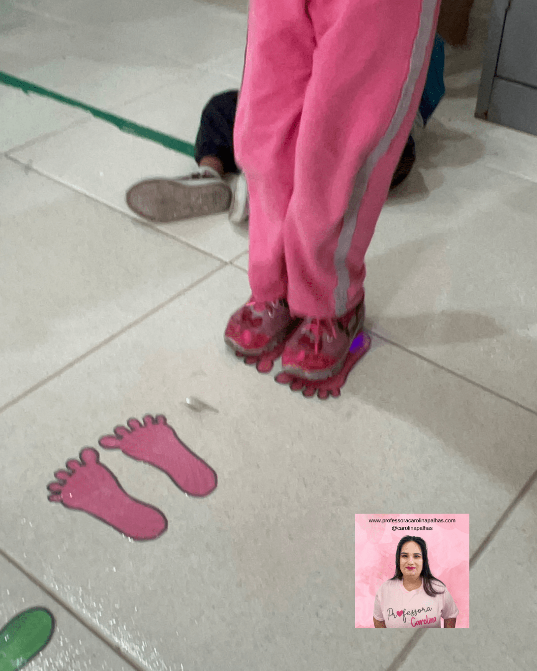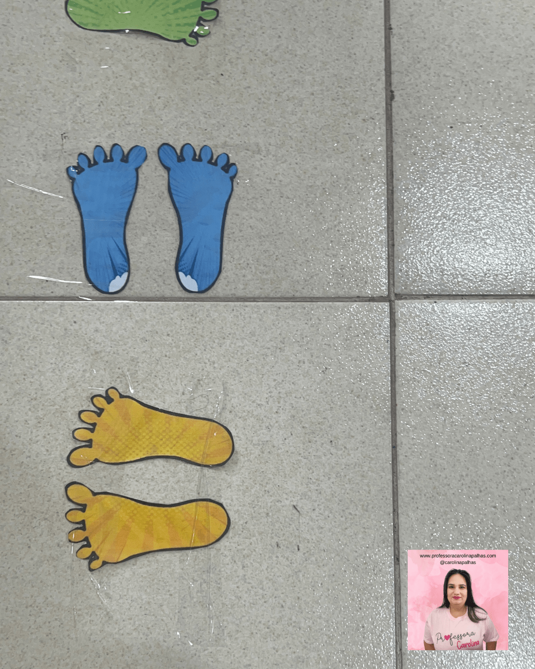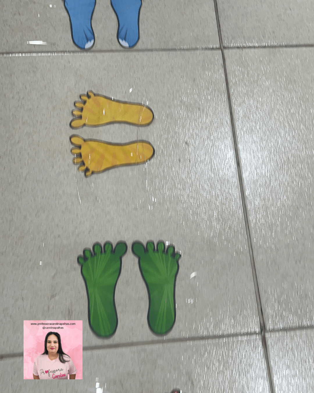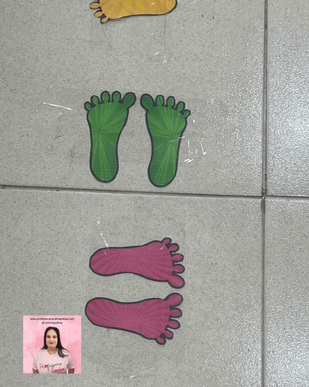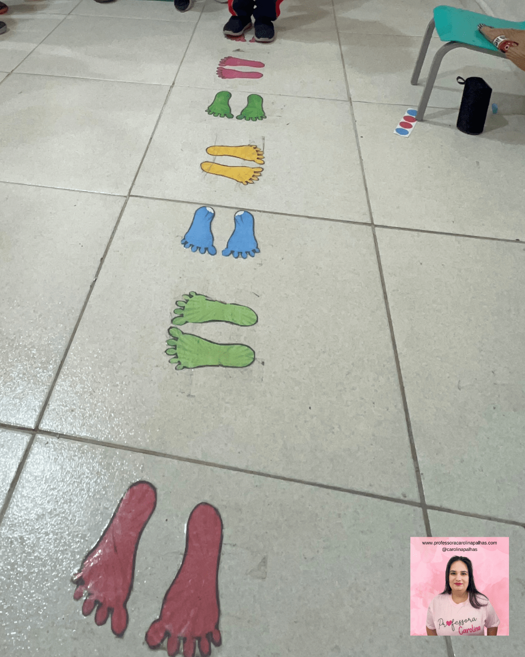 - História com Sequência: Crie uma história onde os personagens precisam seguir uma trilha de pés coloridos para chegar ao destino, e peça para as crianças recriarem a trilha no chão.