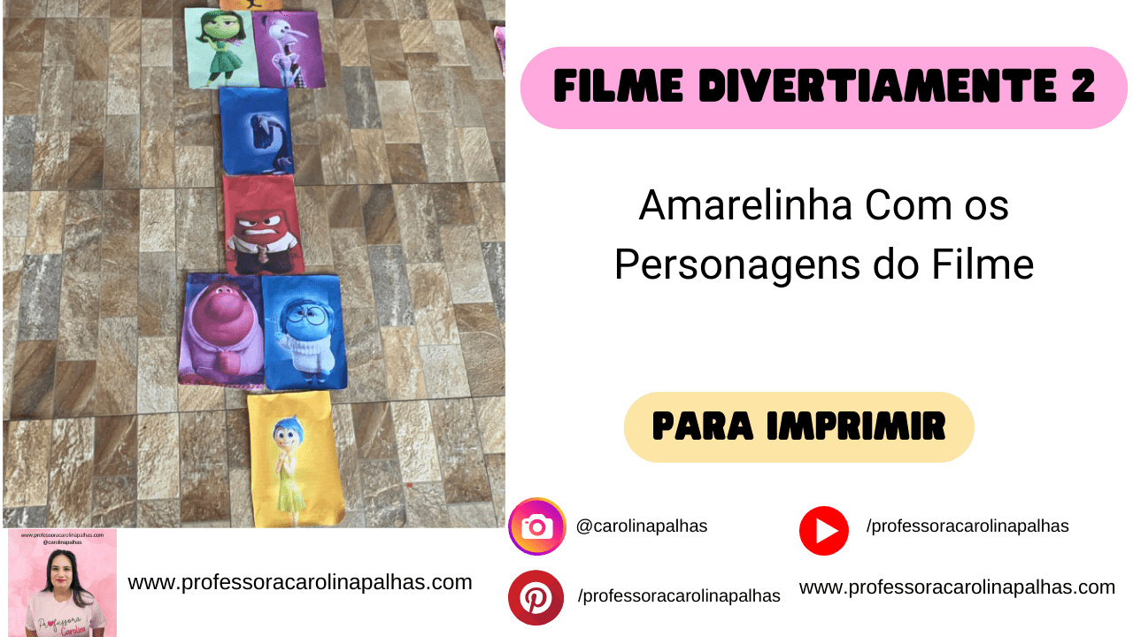 Palavras-chave: Amarelinha, Divertidamente 2, personagens, atividade infantil, desenvolvimento motor, emoções, brincadeira educativa, educação infantil, jogos pedagógicos, filmes infantis