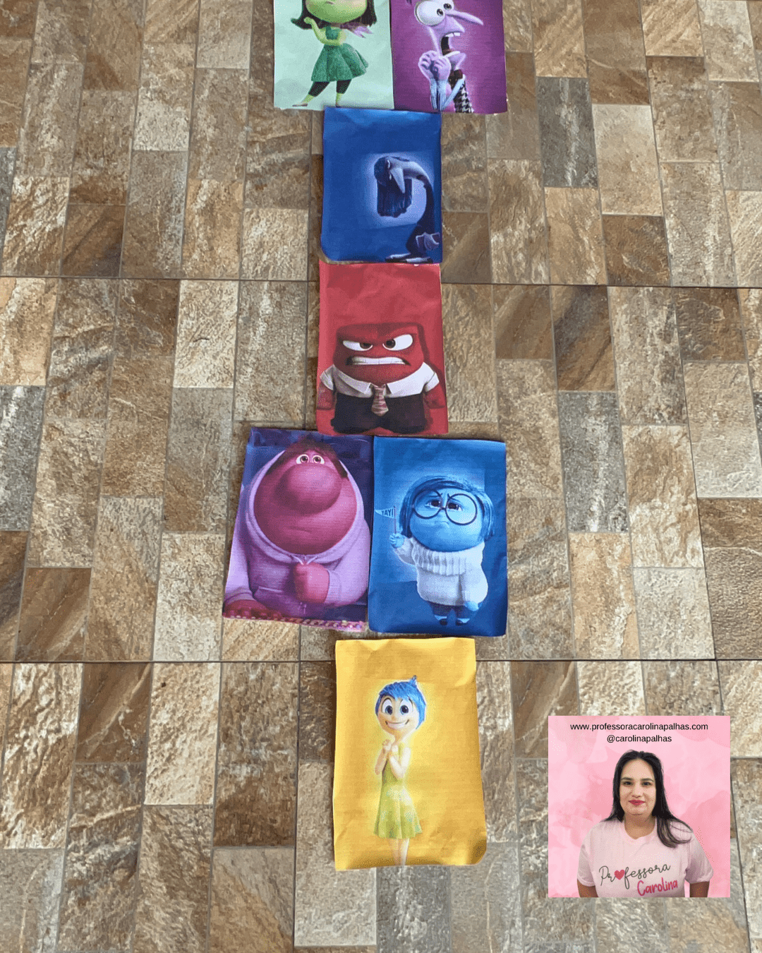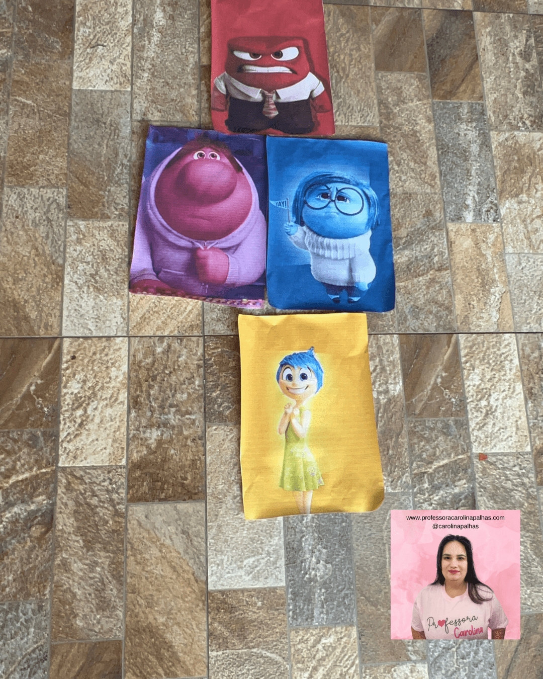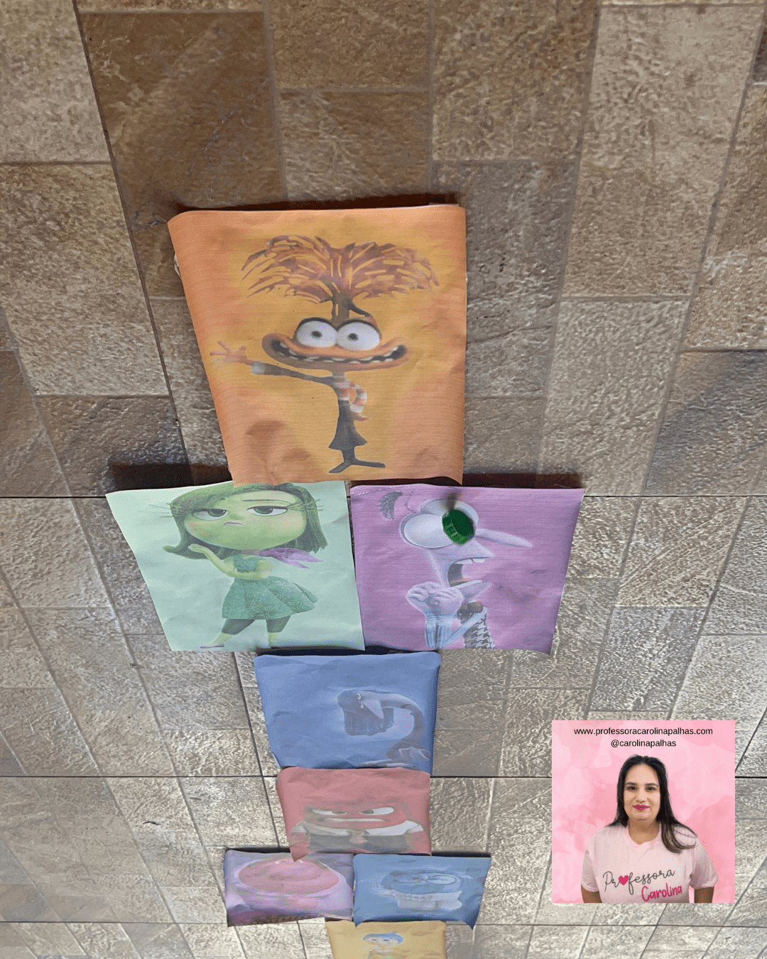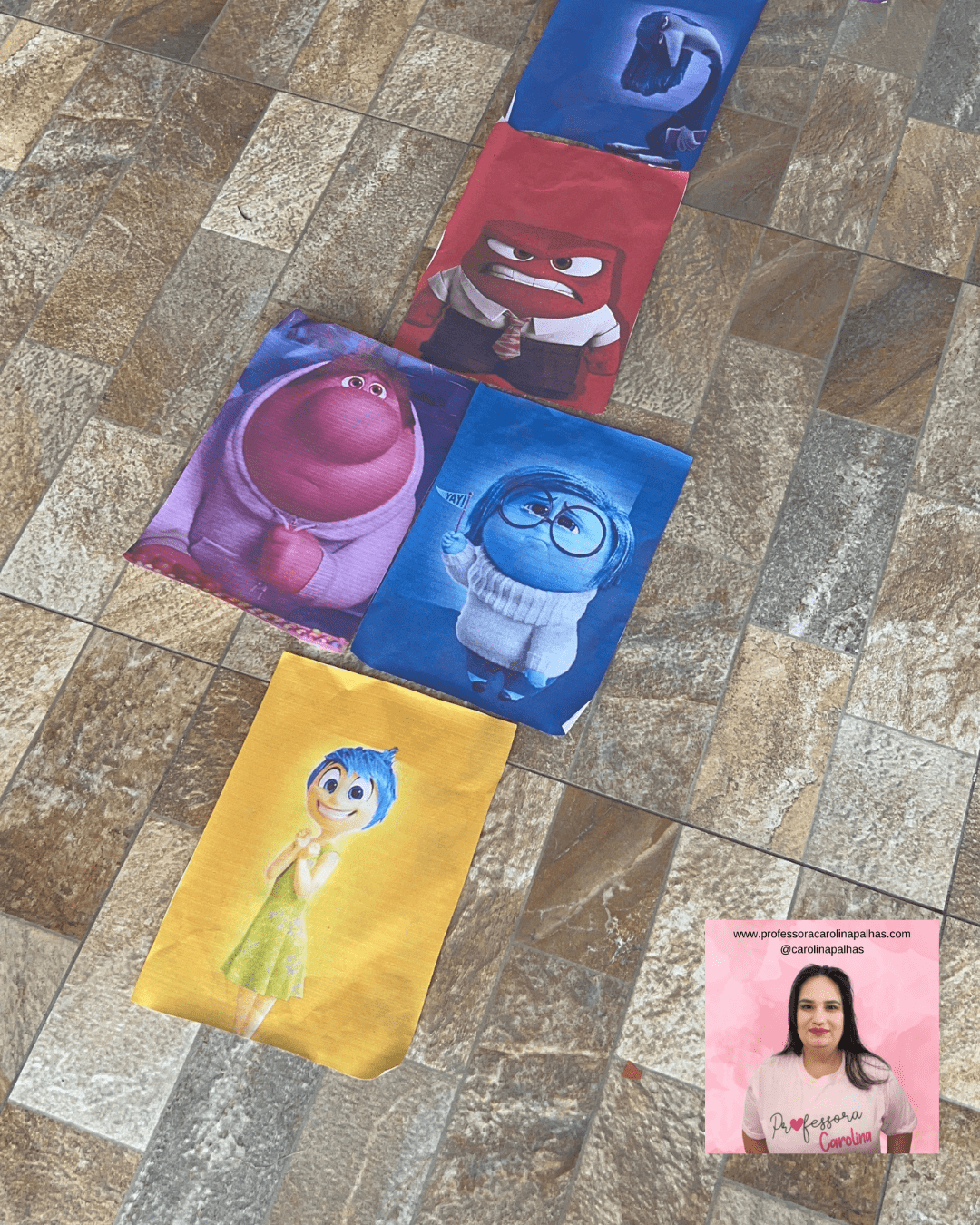 - Preparação das Imagens: Imprima imagens dos personagens do filme “Divertidamente 2”. No nosso caso, utilizamos Joy, Sadness, Anger, Disgust, Fear, e Bing Bong. Recorte e plastifique (opcional) as imagens para maior durabilidade.