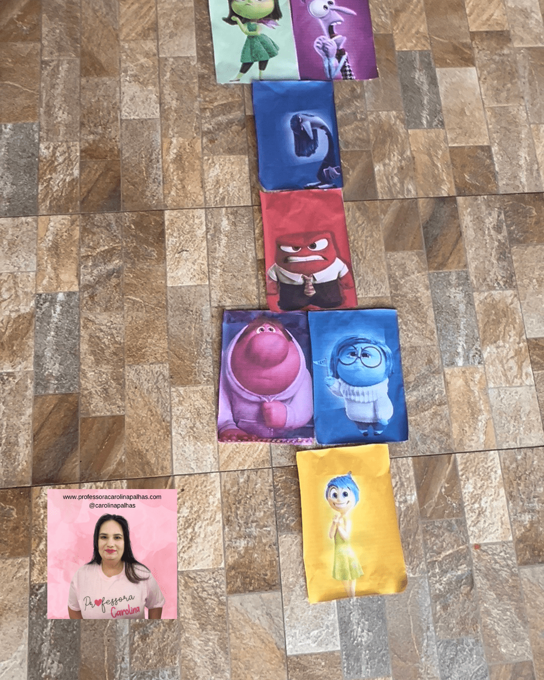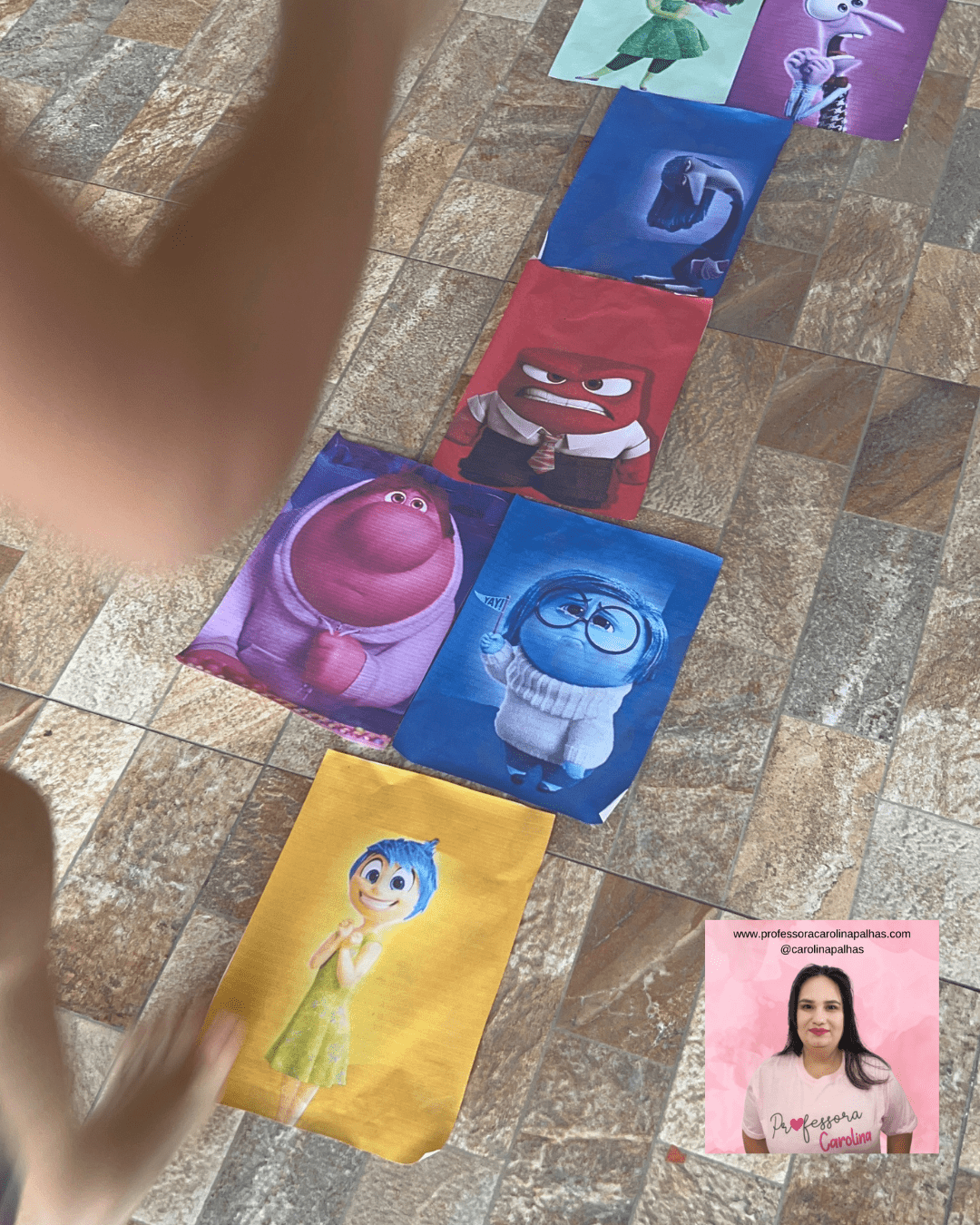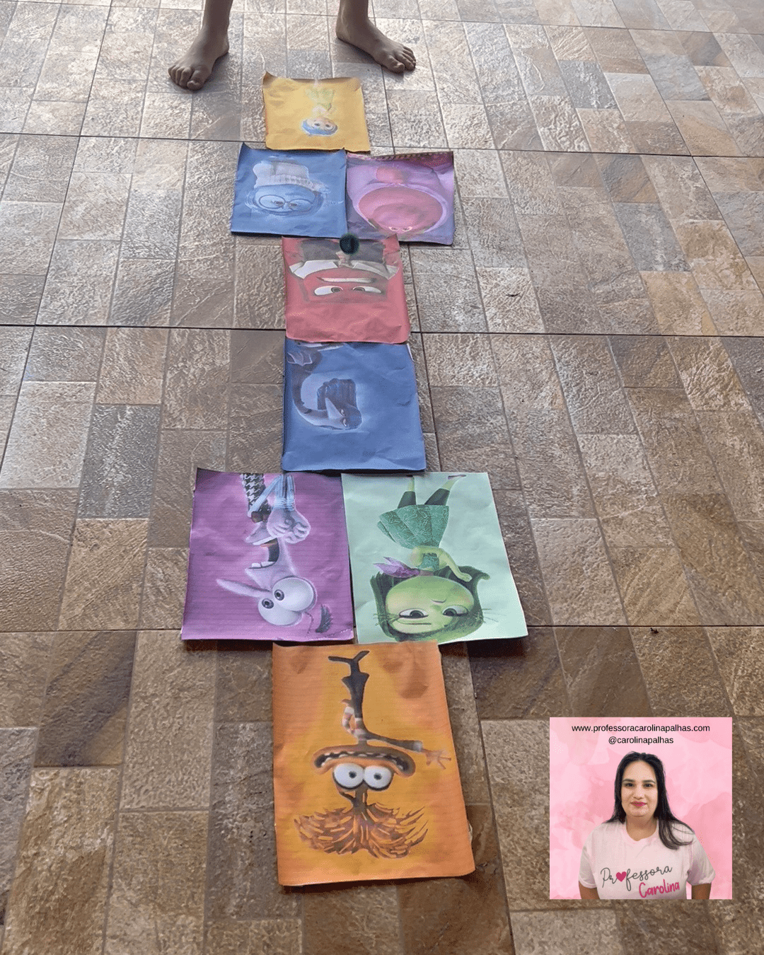 - Regras do Jogo: Explique para as crianças que elas devem pular de imagem em imagem, evitando pisar fora das figuras. Cada personagem representa uma emoção, e é interessante discutir essas emoções durante a brincadeira.
