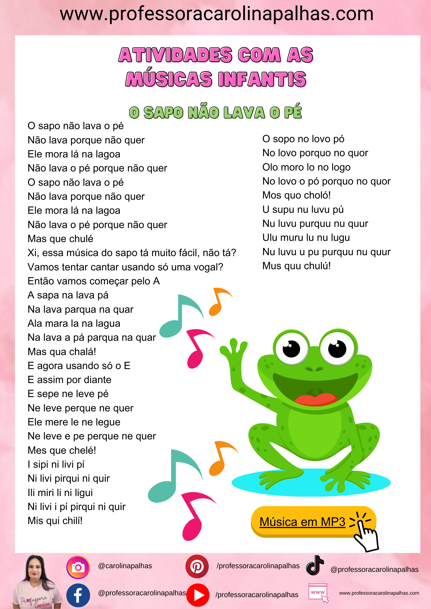 A música “O Sapo Não Lava o Pé” é um clássico que encanta crianças de todas as idades. Utilizar essa canção nas atividades educativas pode tornar o aprendizado mais leve e divertido. Neste post, apresento uma atividade lúdica e divertida e uma sequência didática completa para educação infantil, alfabetização e ensino fundamental (2º ao 5º ano), baseada nessa música querida. Além disso, compartilho um vídeo com uma nova versão da música e o áudio em MP3 para facilitar sua utilização em sala de aula. Não perca essa dica incrível e compartilhe comigo os resultados das atividades das suas crianças! Vamos juntos tornar o aprendizado mais leve e divertido!