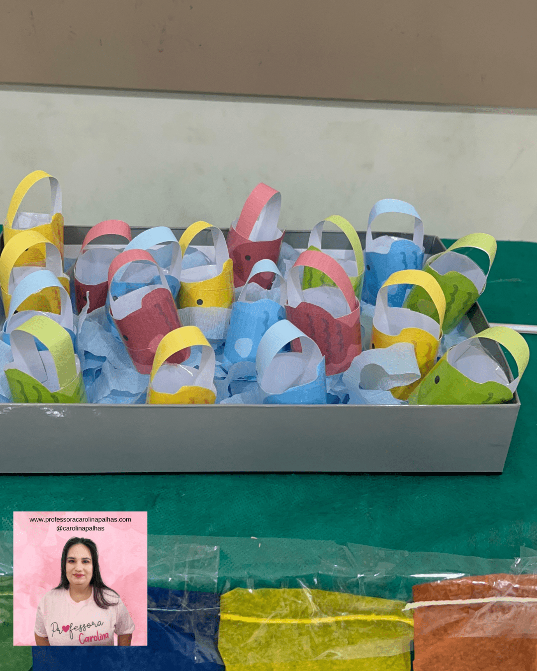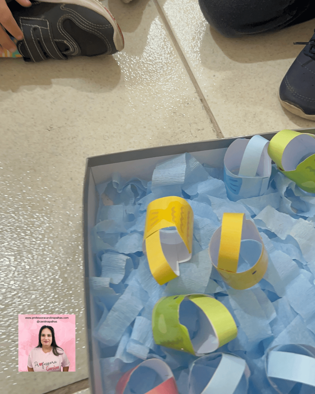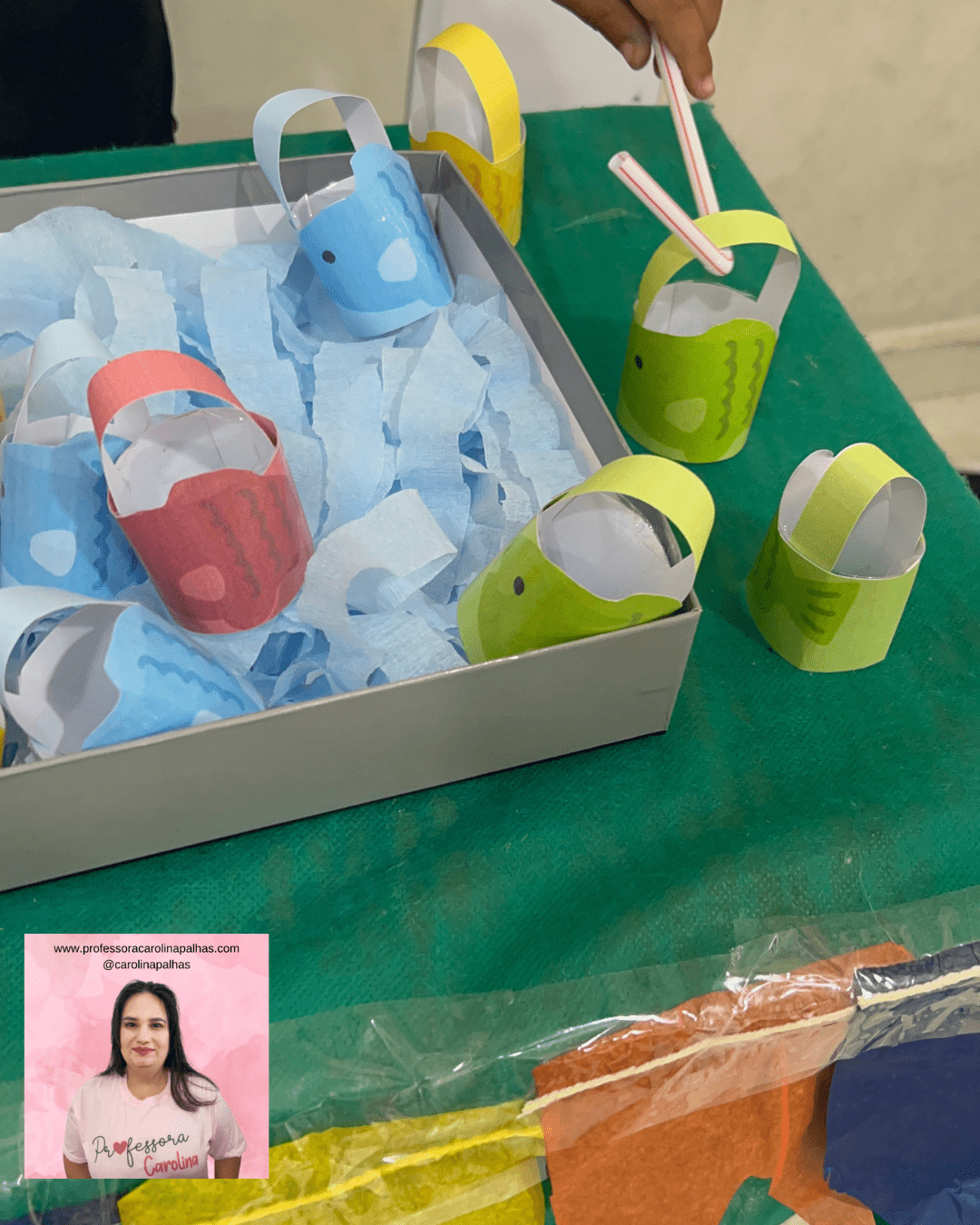 - Montar o cenário da pescaria, utilizando uma bacia com peixinhos coloridos.