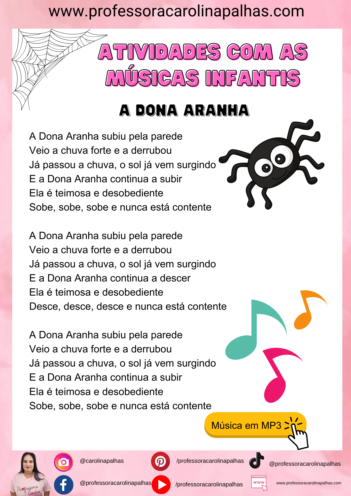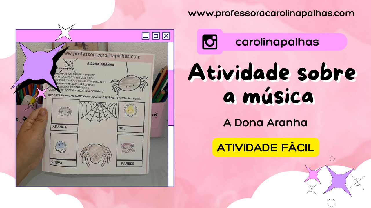 Utilizar a música “A Dona Aranha” como base para atividades pedagógicas pode ser uma maneira divertida e eficaz de desenvolver diversas habilidades nas crianças da educação infantil. Ao final deste post, você encontrará a letra da música, o material em PDF para impressão e um vídeo animado que pode ser usado como recurso complementar.