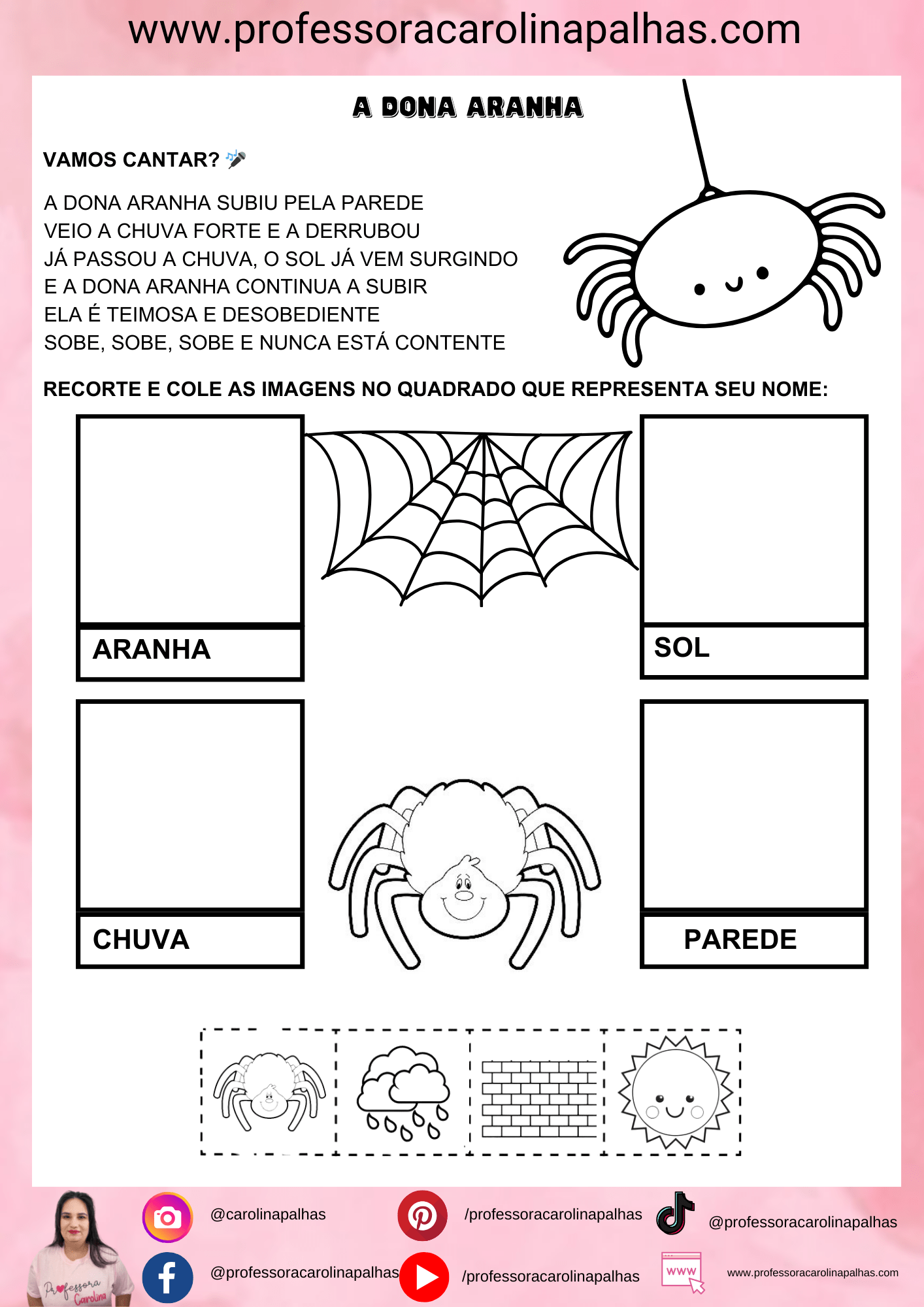 A atividade consiste em recortar e colar as imagens que representam as partes da música “A Dona Aranha”. As crianças serão incentivadas a cantar a música enquanto associam as imagens às palavras correspondentes, como aranha, chuva, sol e parede. Esta atividade não só reforça a memorização da canção, mas também estimula habilidades motoras finas e a compreensão auditiva.