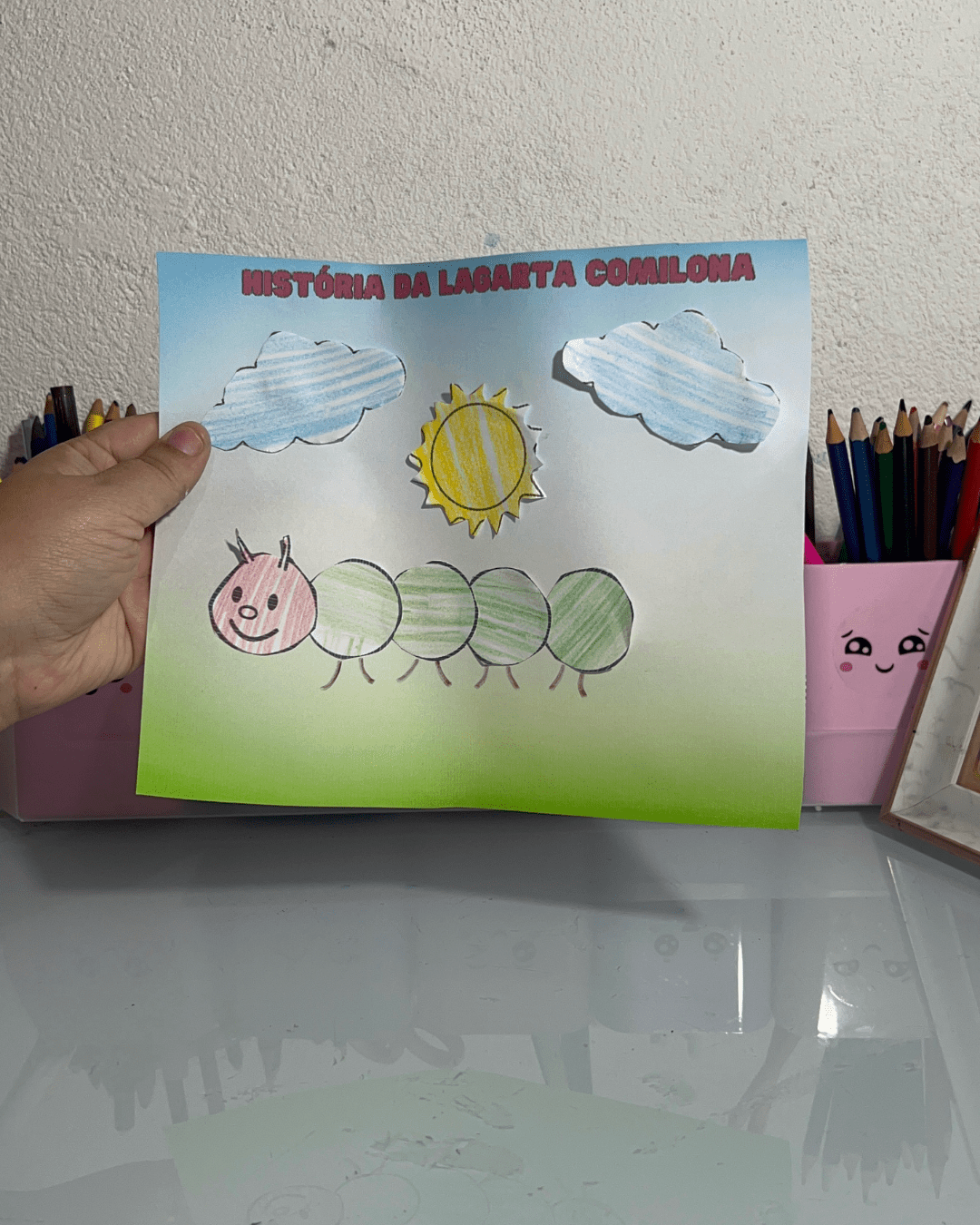 - Utilize materiais como papel, lápis de cor, e tinta para criar uma lagartinha colorida.
